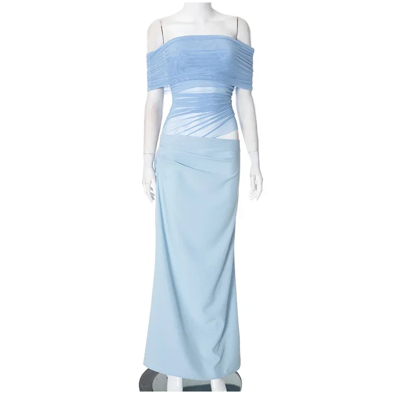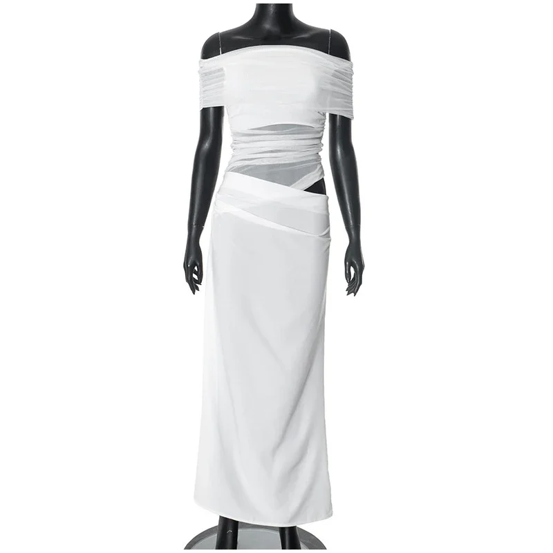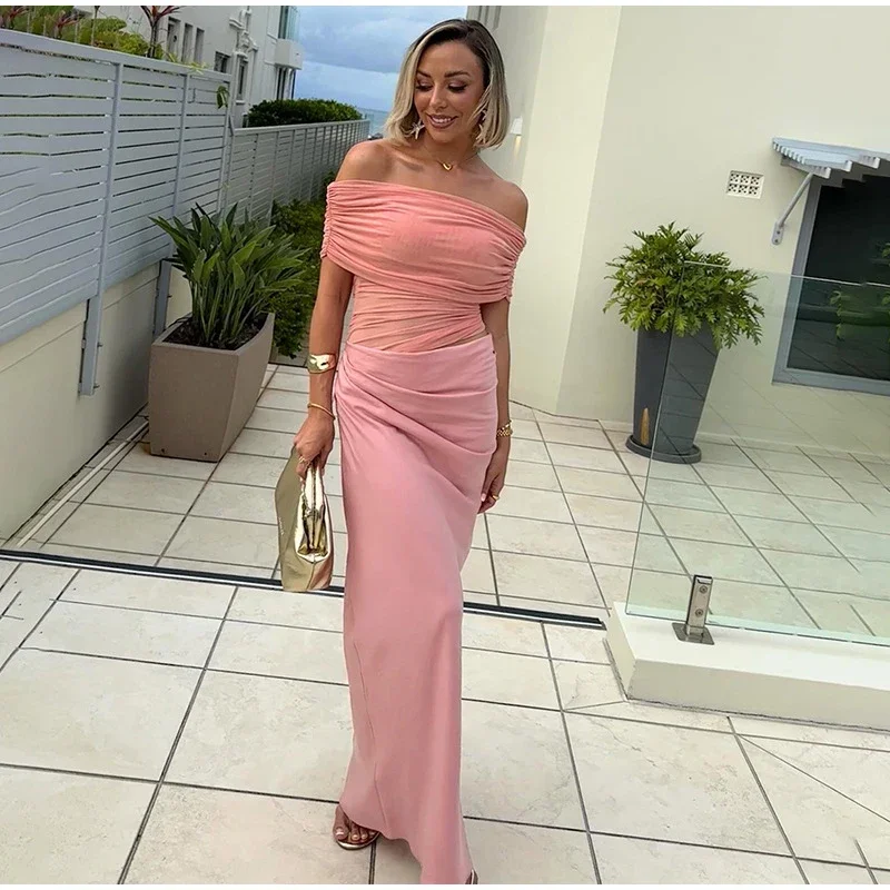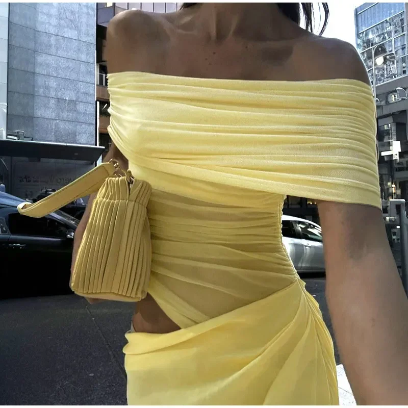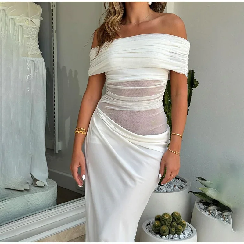 Sexy Slim Mesh Pleated Dress Women Off The Shoulder Sleeveless Backless Party Dresses 2025 Summer Lady Solid Beach Vacation Robe