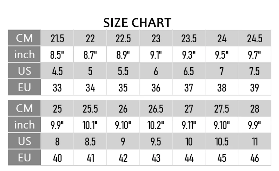 Size:please choose size according to your feet length.If your feet are a little fat and wide,please choose larger size.If you can’t make sure the size,please free to contact us.