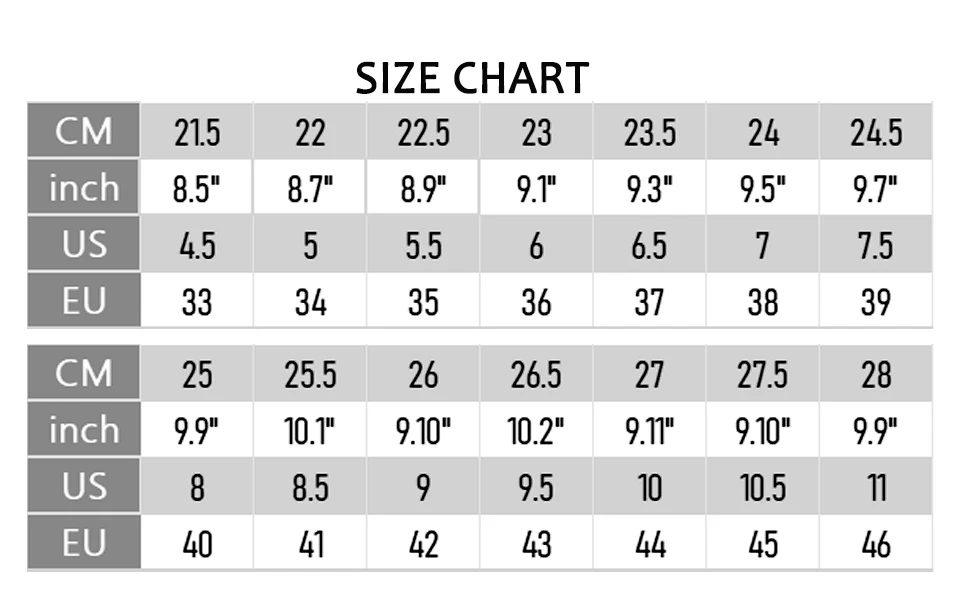 Size:please choose size according to your feet length.If your feet are a little fat and wide,please choose larger size.If you can’t make sure the size,please free to contact us.