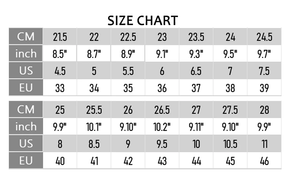 Size:please choose size according to your feet length.If your feet are a little fat and wide,please choose larger size.If you can’t make sure the size,please free to contact us.