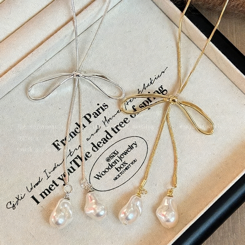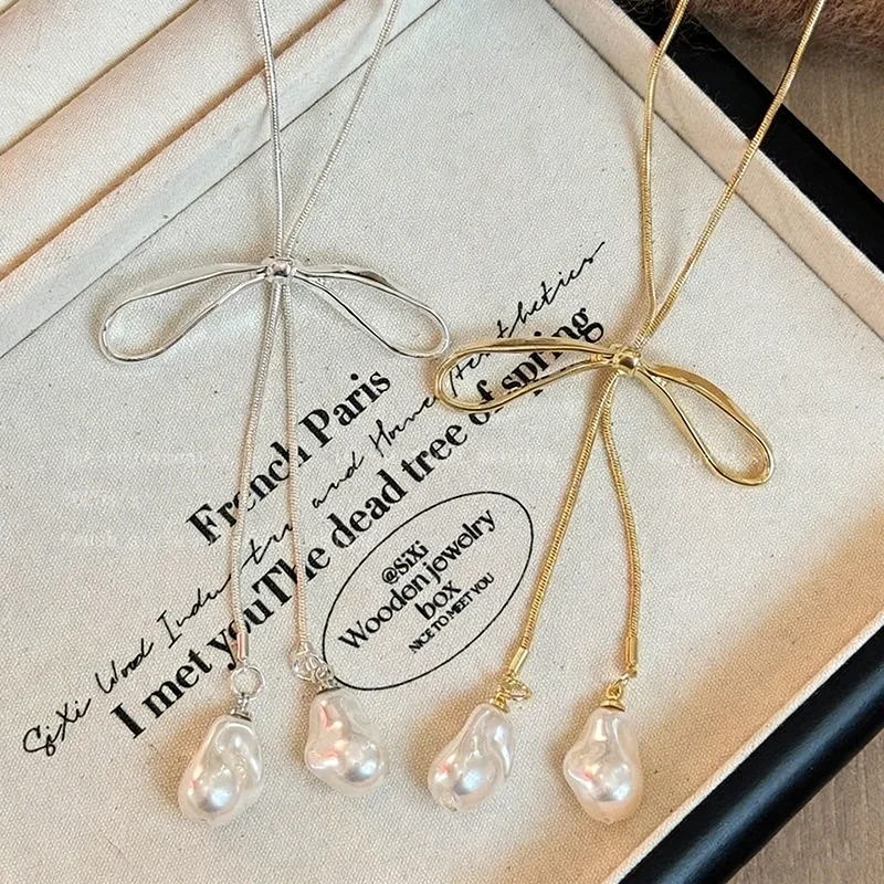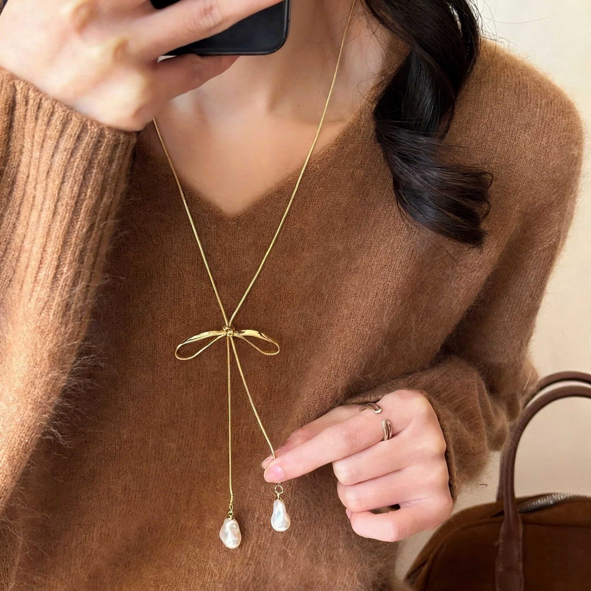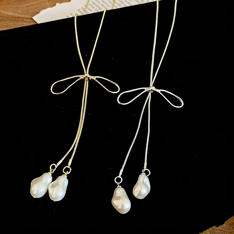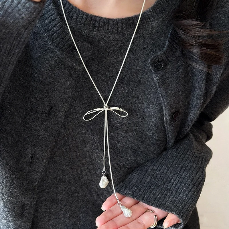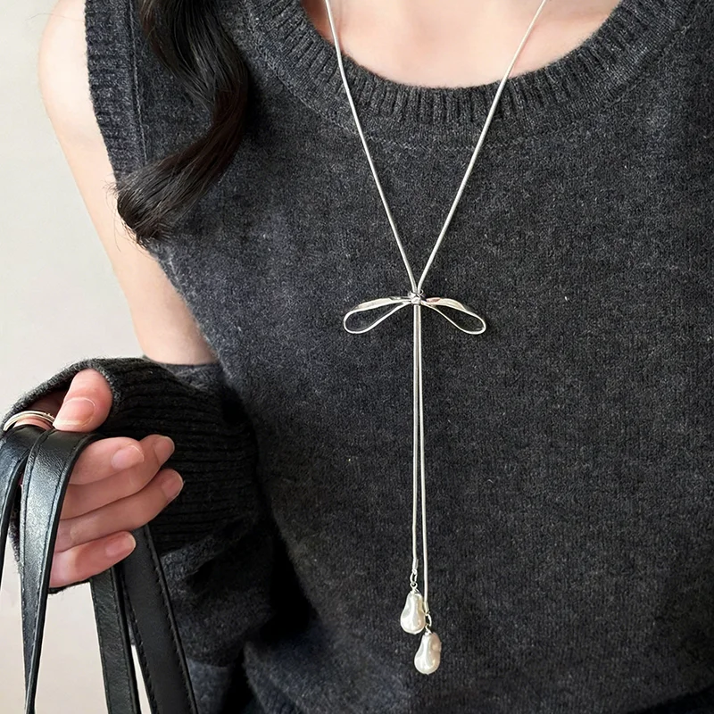 Simple Bowknot Elegance Imitation Pearl Pendant Drawstring Long Necklace for Women Korean New Fashion Sweater Chain Jewelry Gift