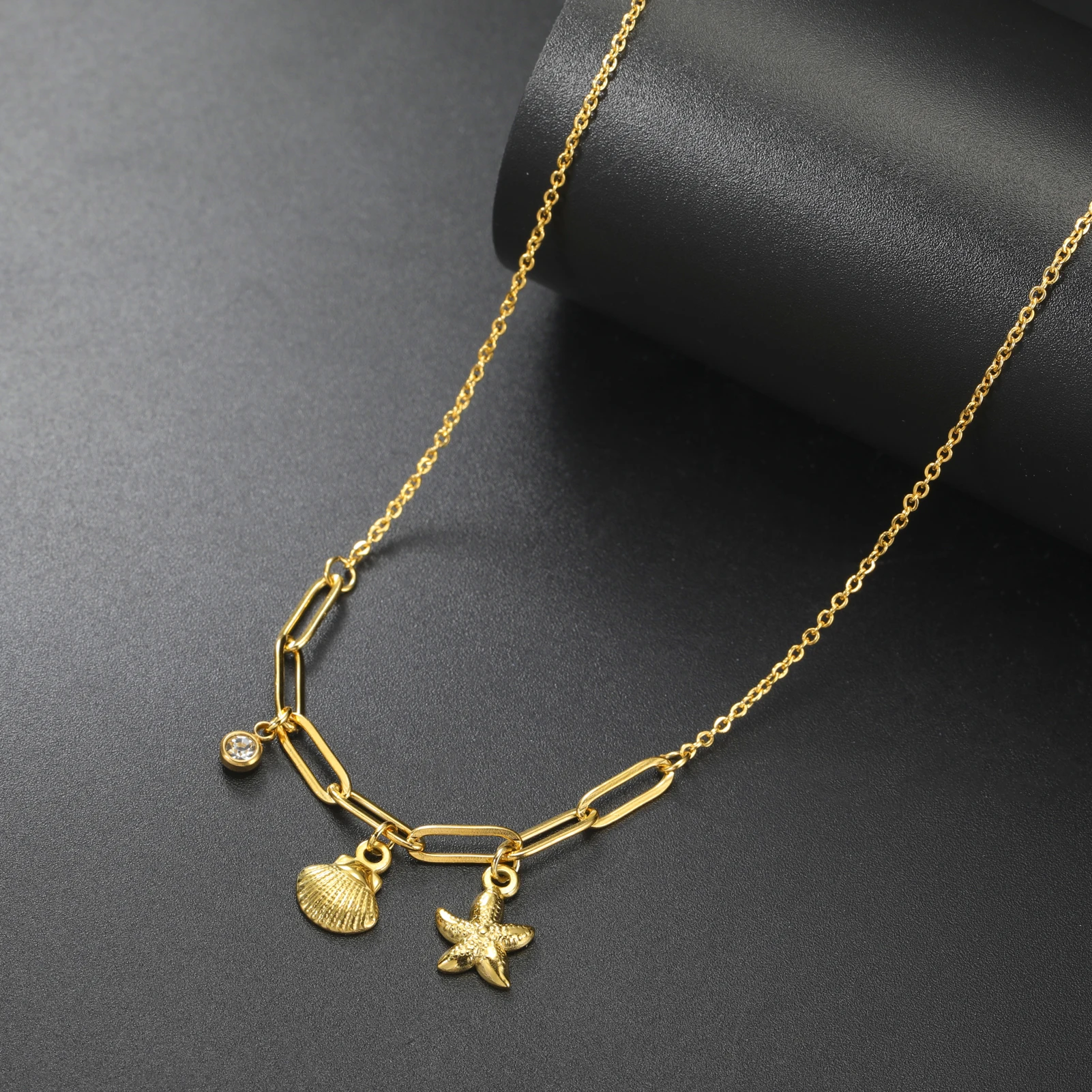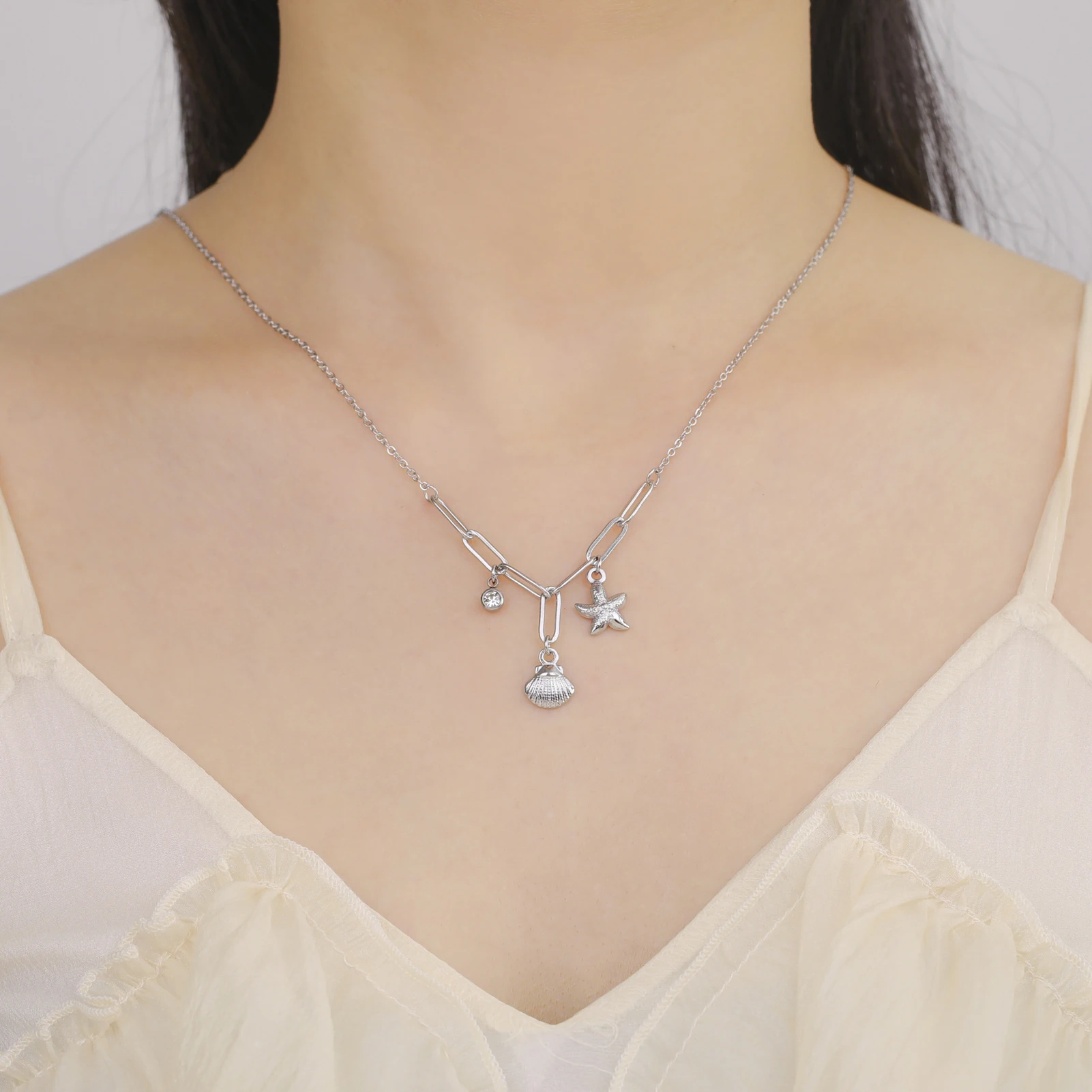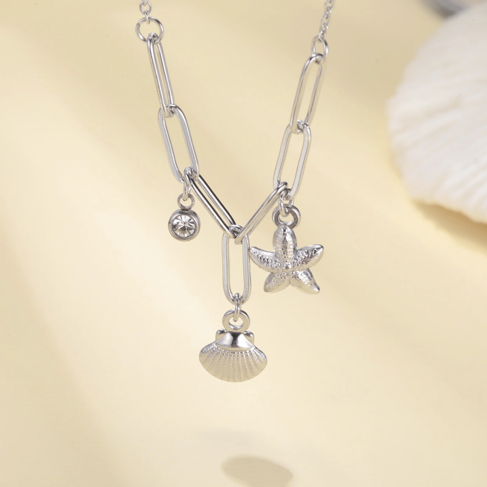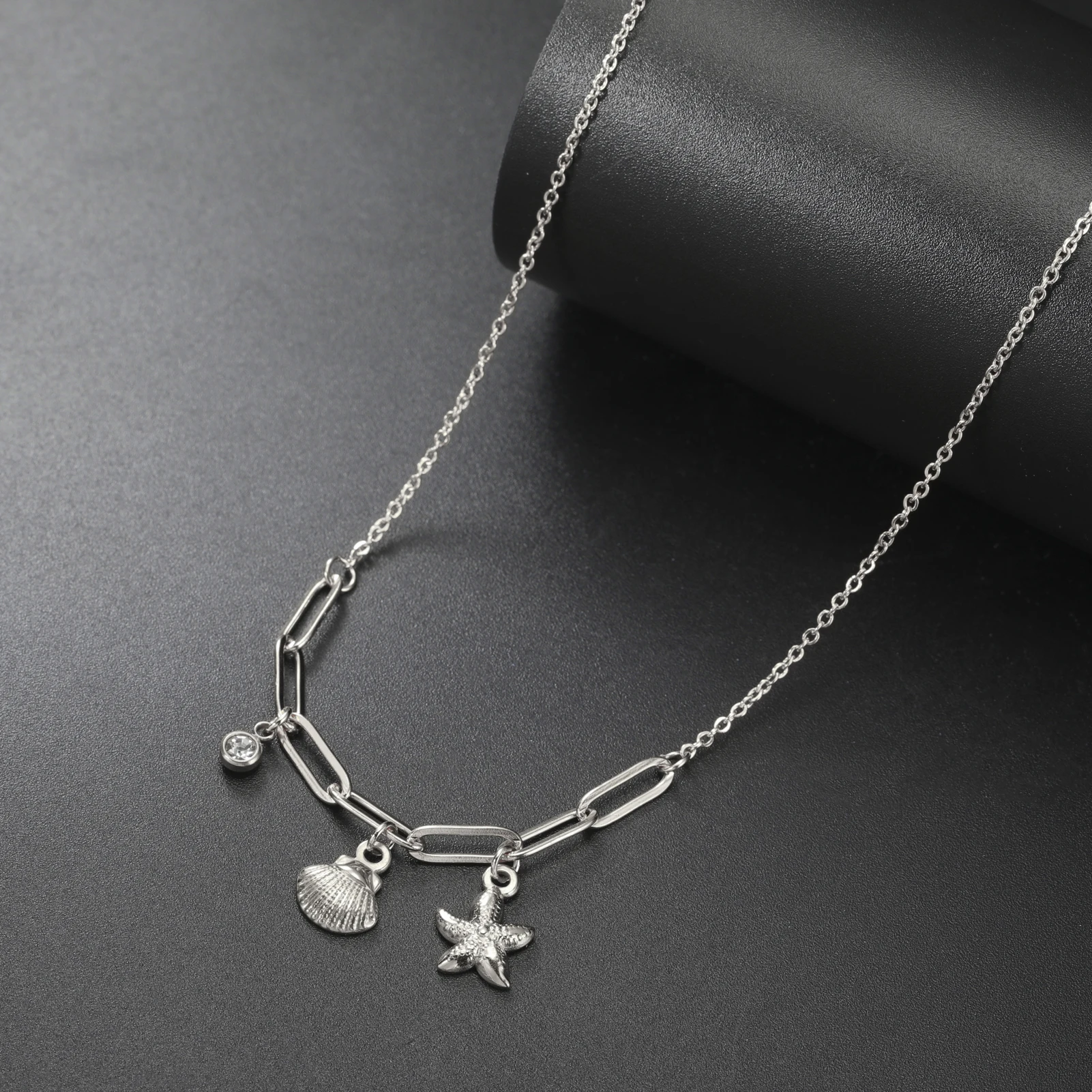 Skyrim Starfish Shell Zircon Pendant Necklace Women Girls Stainless Steel Paperclip Chain Choker Beach Jewelry Gift Wholesale