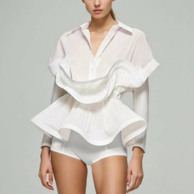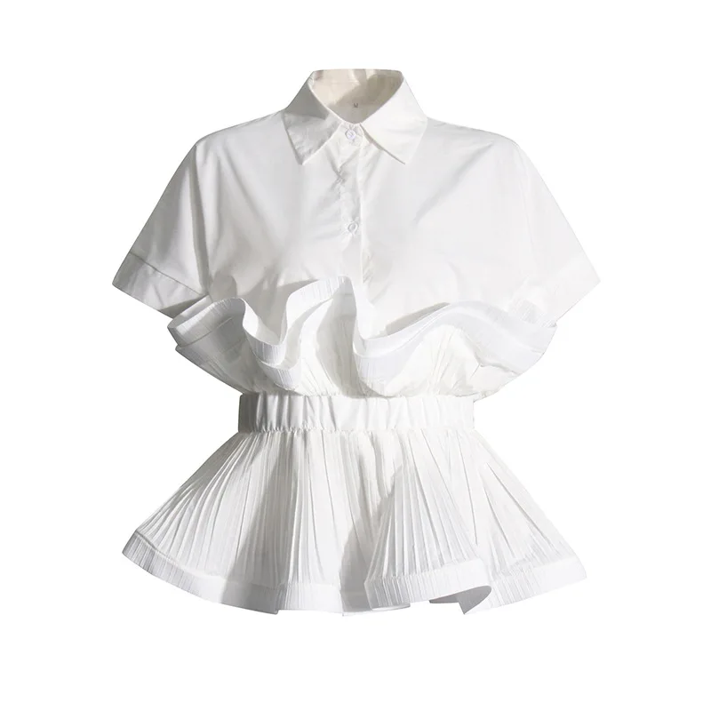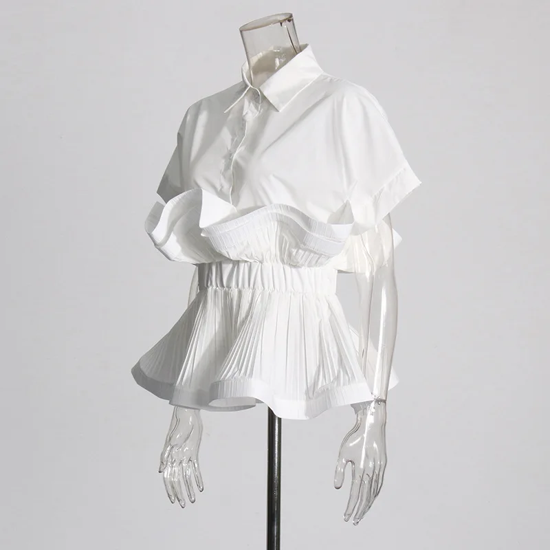 Solid Button Shirts For Women Lapel Short Sleeve Patchwork Ruffles Elegant Chic Blouse Female Summer Fashion Clothing