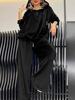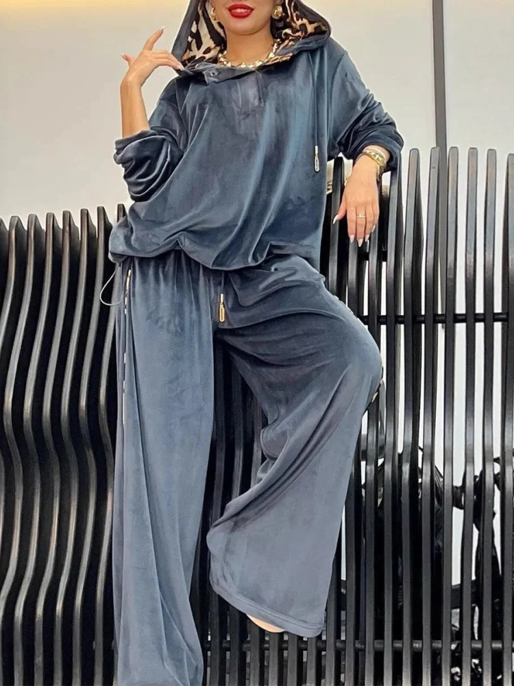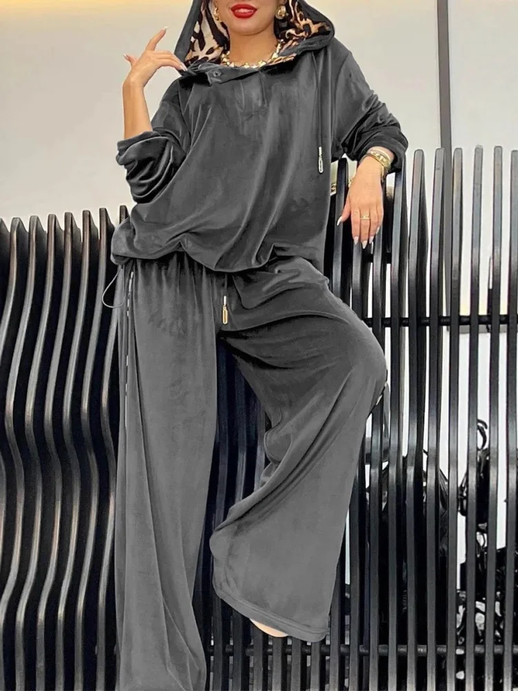Solid Color Velvet Pants Sets Women Fashion Hoodie Pullover High Waist Drawstring Trousers Two Piece Set Female Autumn Winter