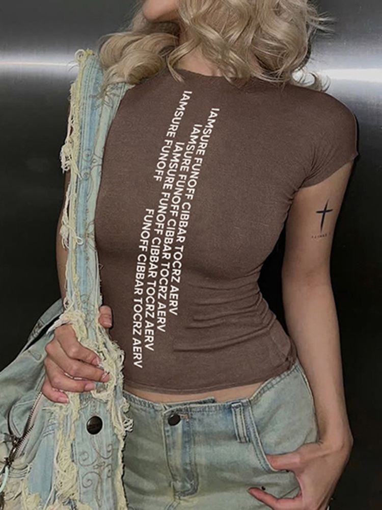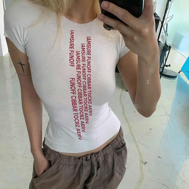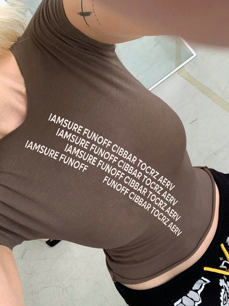 Solid Slim Letter Print Women’s Clothing Casual All-match Harajuku Fashion Basic Top Korean Aesthetic Clothings