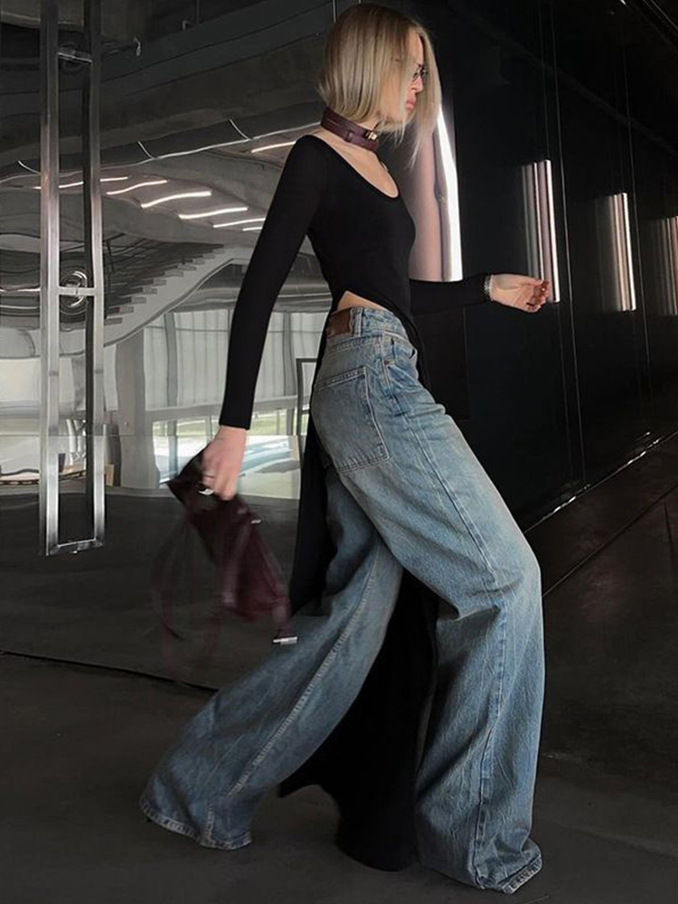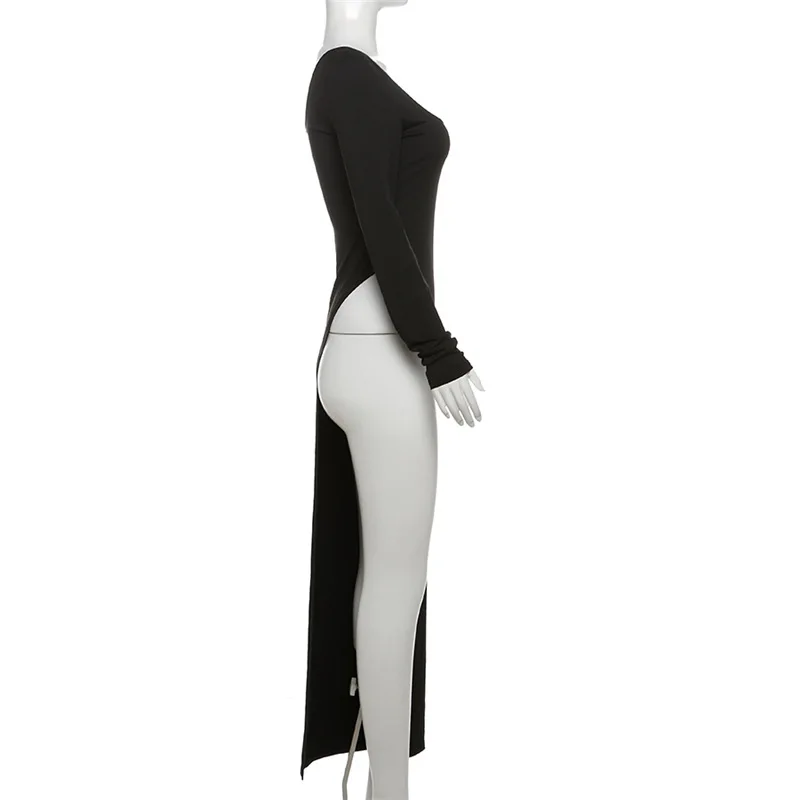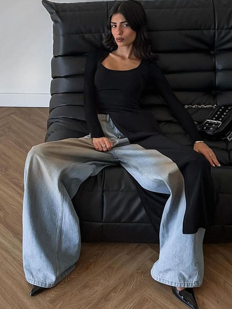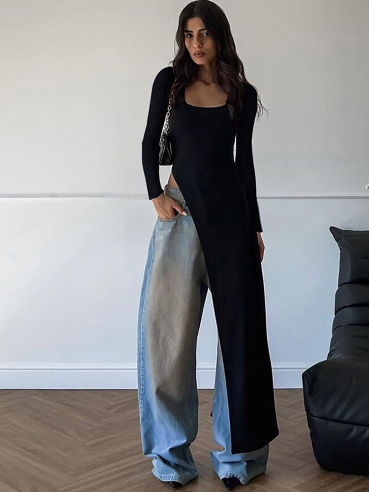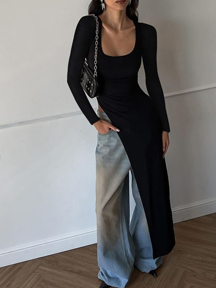 Solid Unique Women Tops Classic Concise Autumn Full Sleeve U-neck Skinny Splited Super-Long Tees Popular New Wild T-shirts
