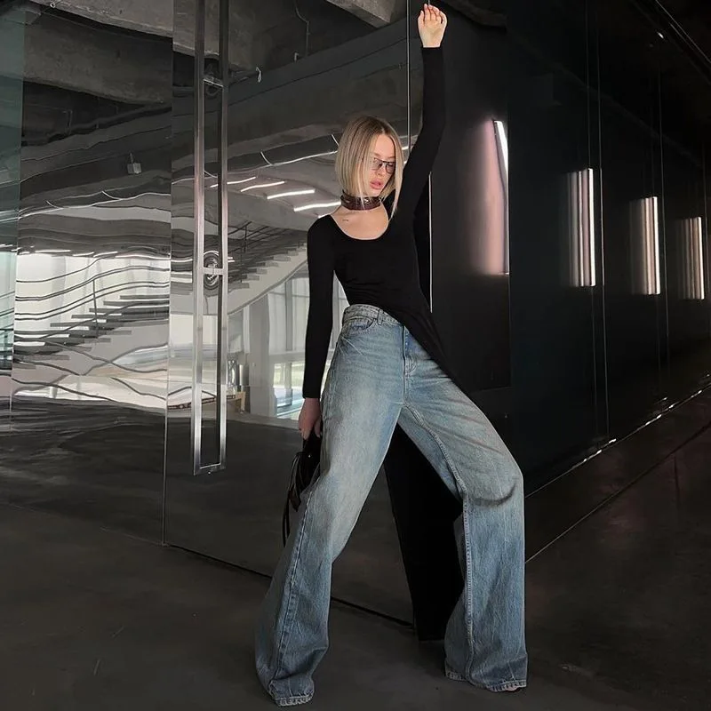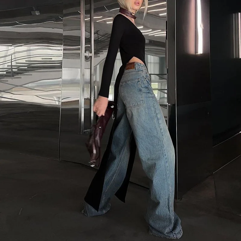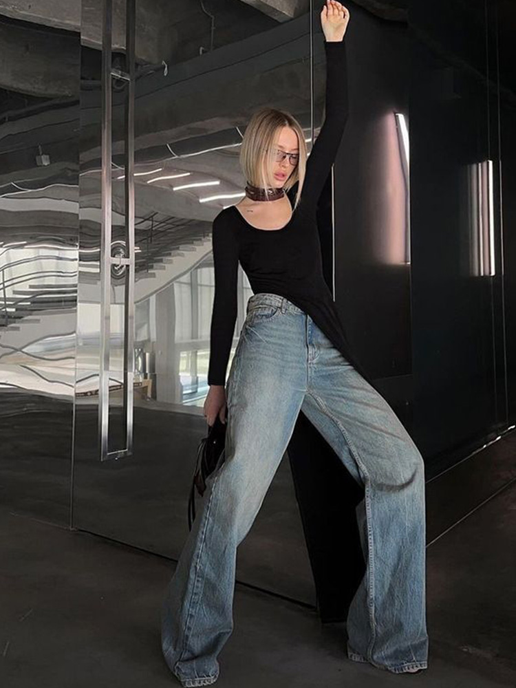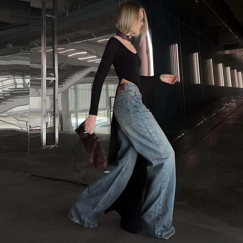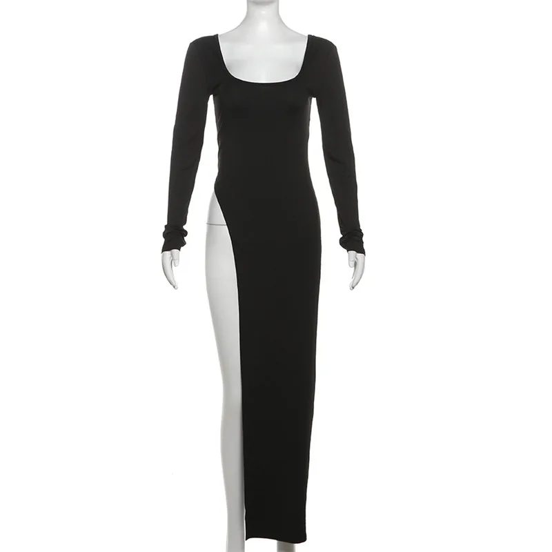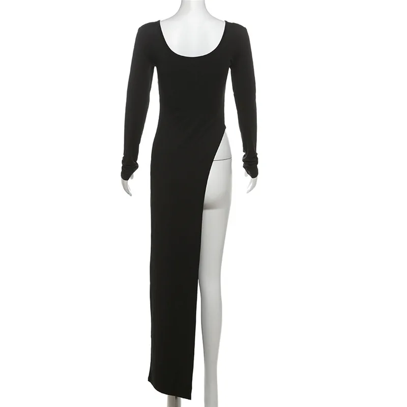 Solid Unique Women Tops Classic Concise Autumn Full Sleeve U-neck Skinny Splited Super-Long Tees Popular New Wild T-shirts