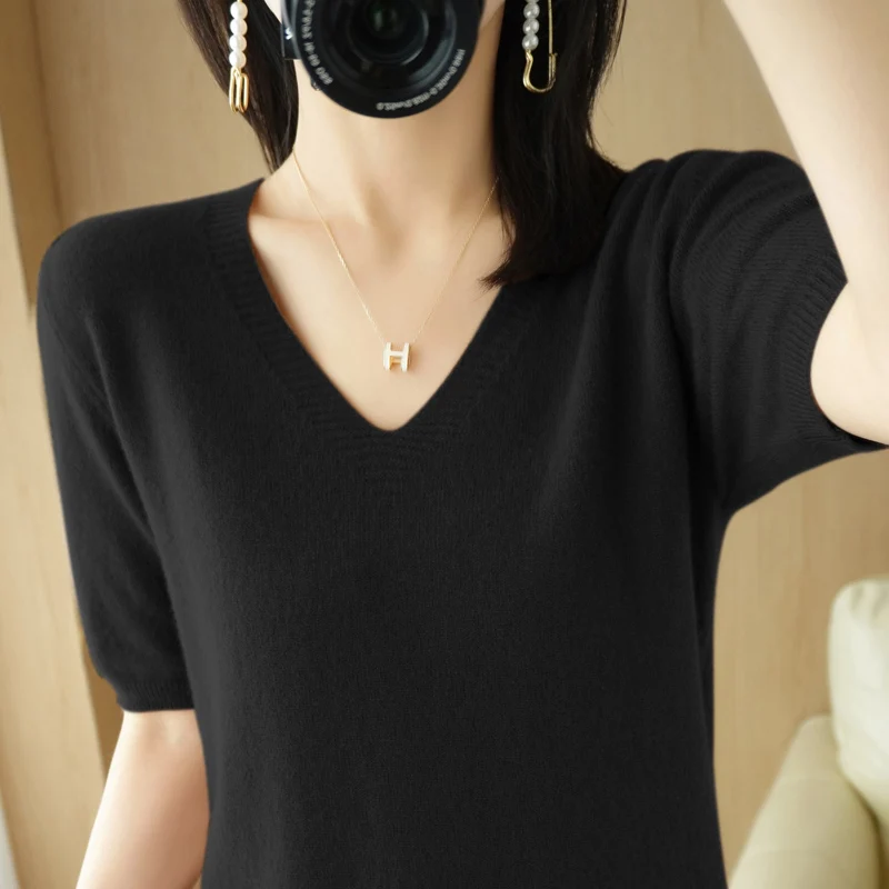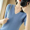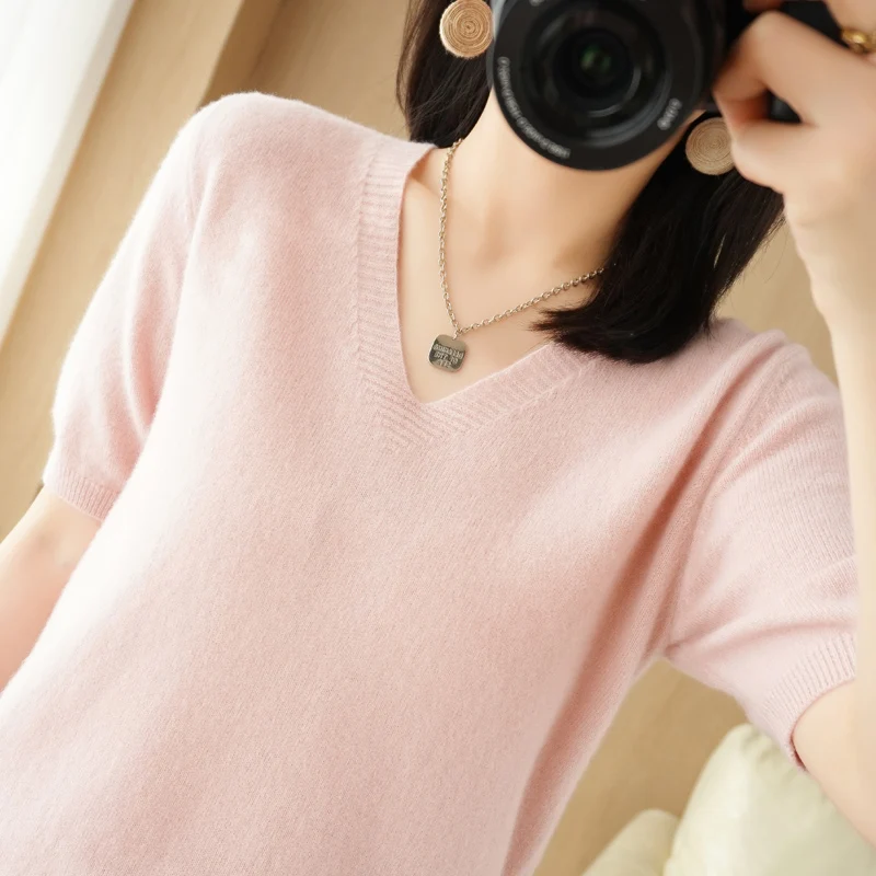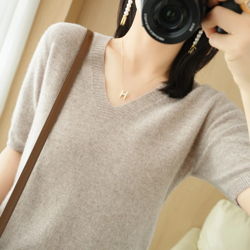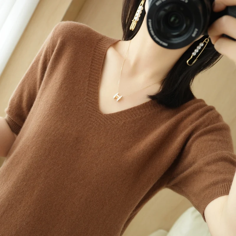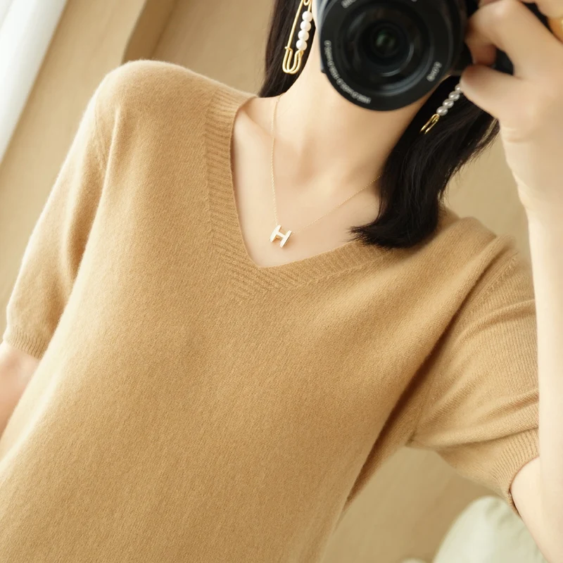 Spring Autumn Women Sweaters Short Sleeves V-neck Bottoming Shirt Knitwear 2025 Summer Camel Green Pink Pullovers Korean Jumpers