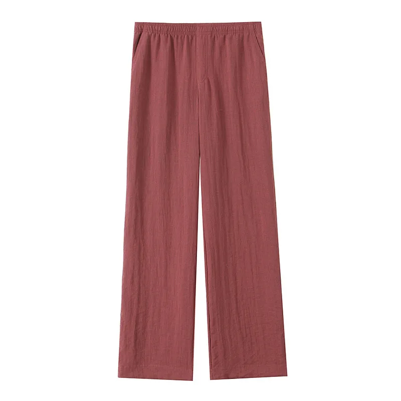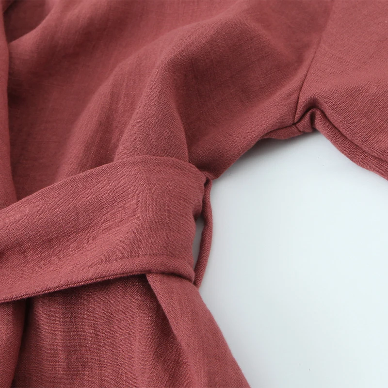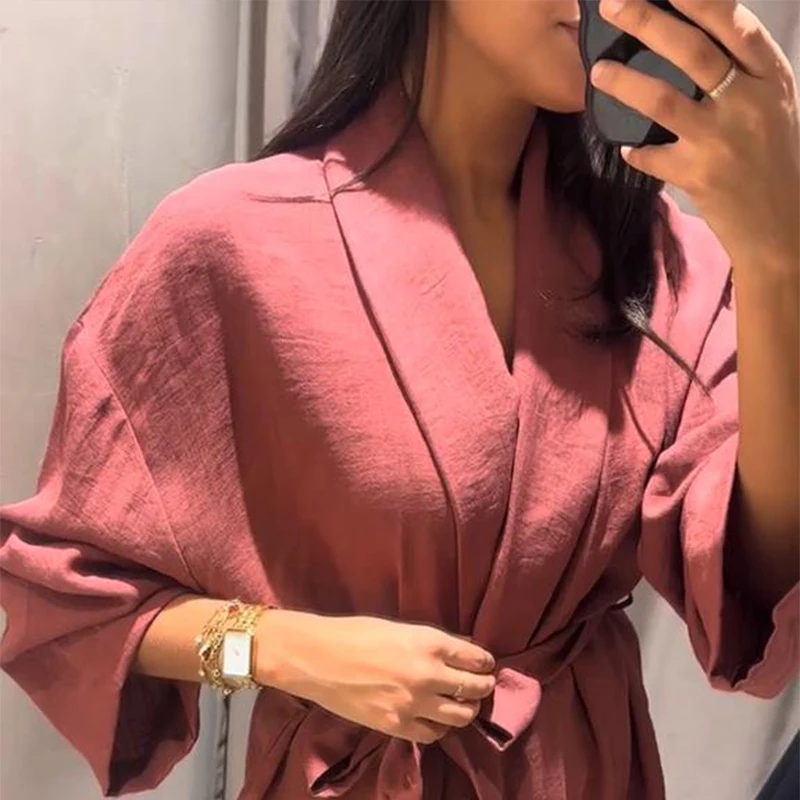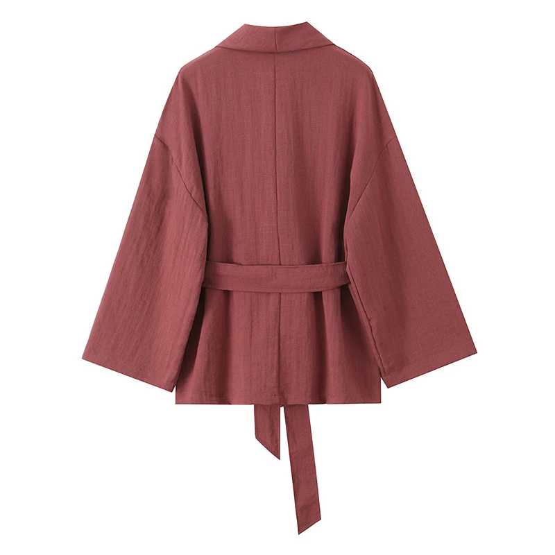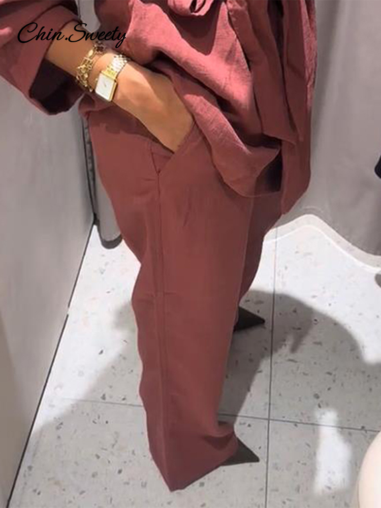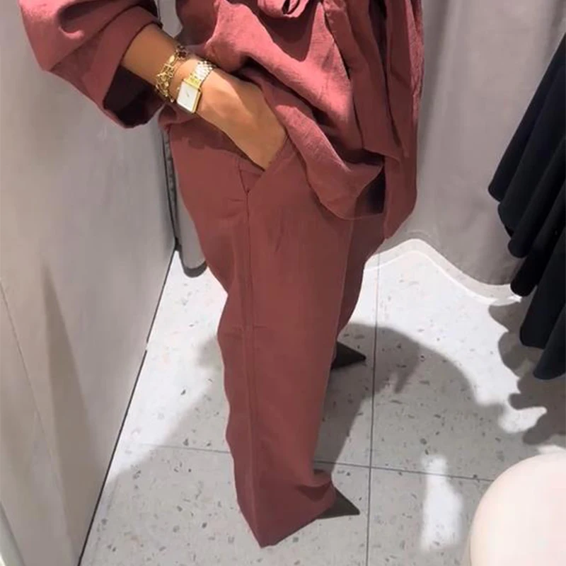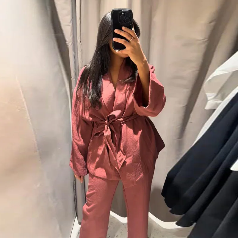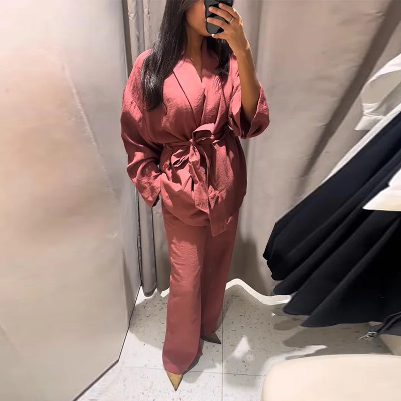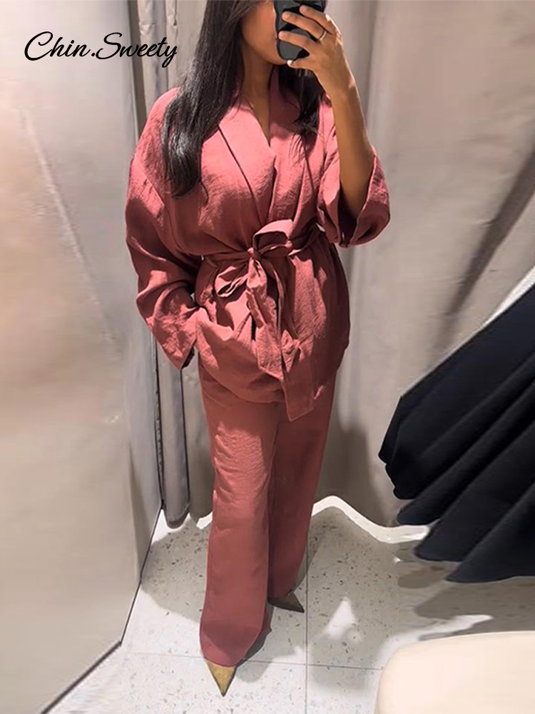 Spring Kimono Style Coat Pants Set Women Solid Lace Up Shirt Wide Leg Pleat Pockets Trousers 2025 Lady Loose 2 Piece Outfits