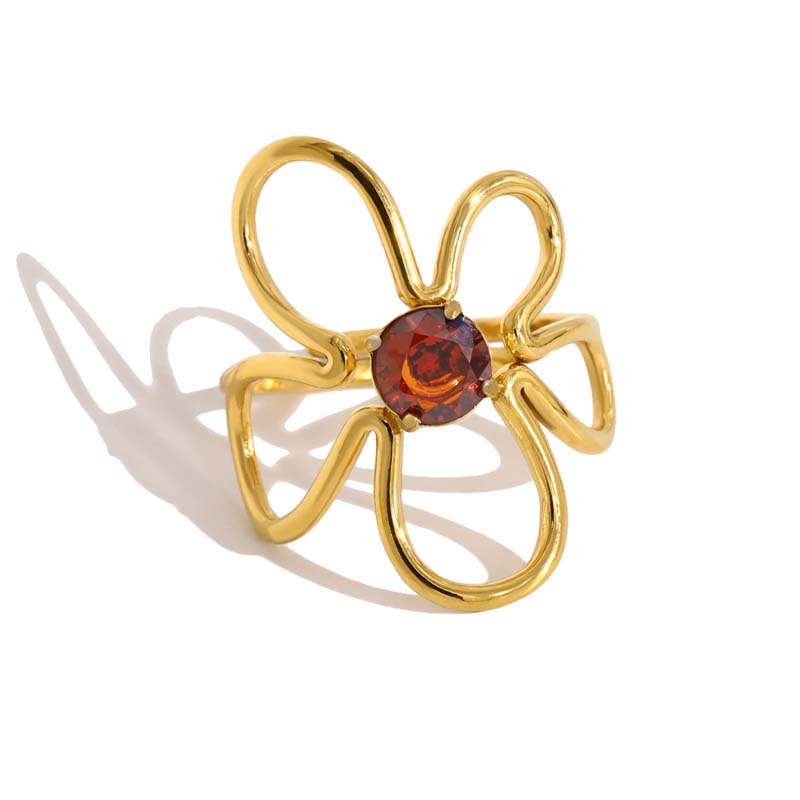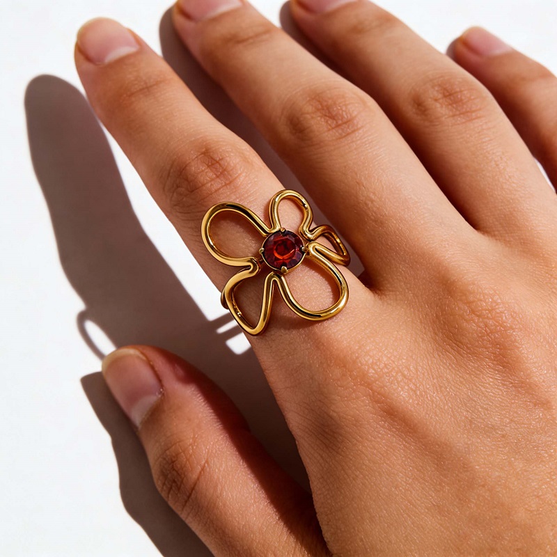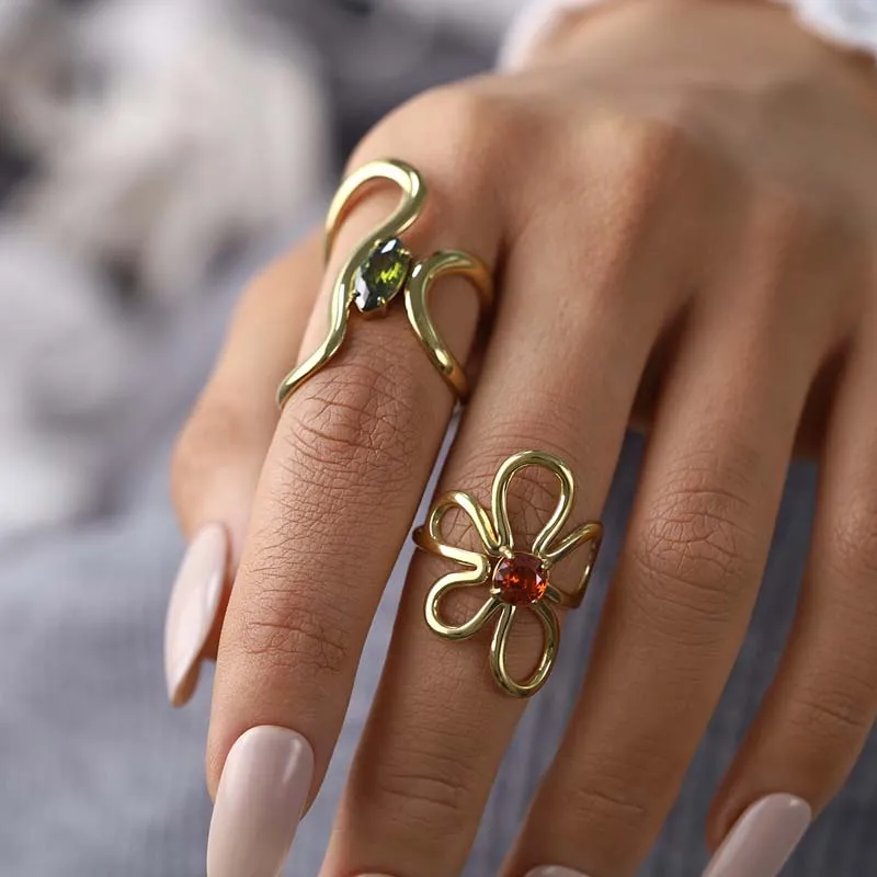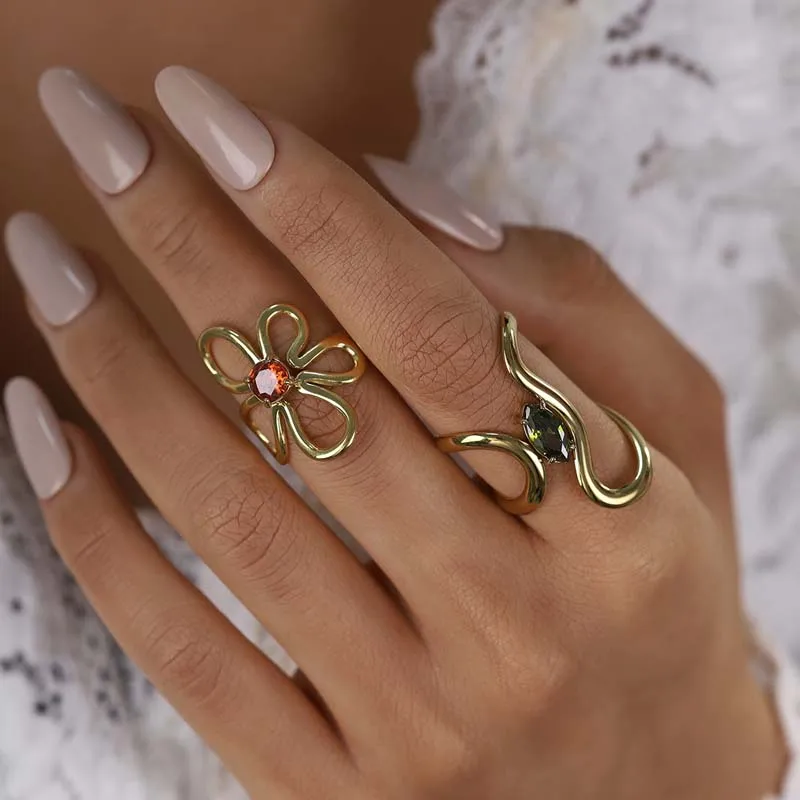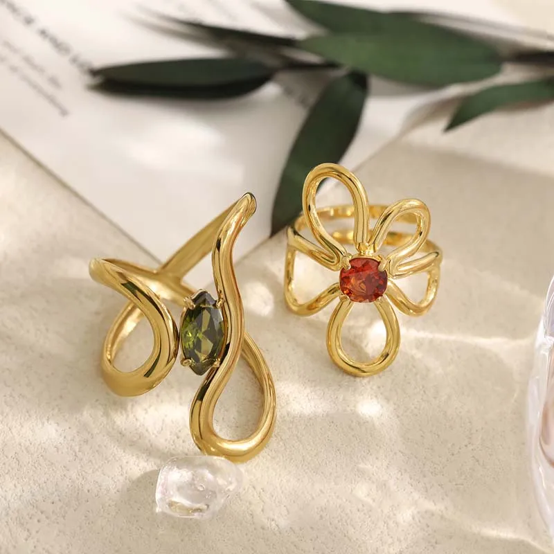 Stainless Steel Color Color Flower Open Rings for Women Exquisite Green Zircon Hollow Line Irregular Rings Jewelry 2026 Trendy