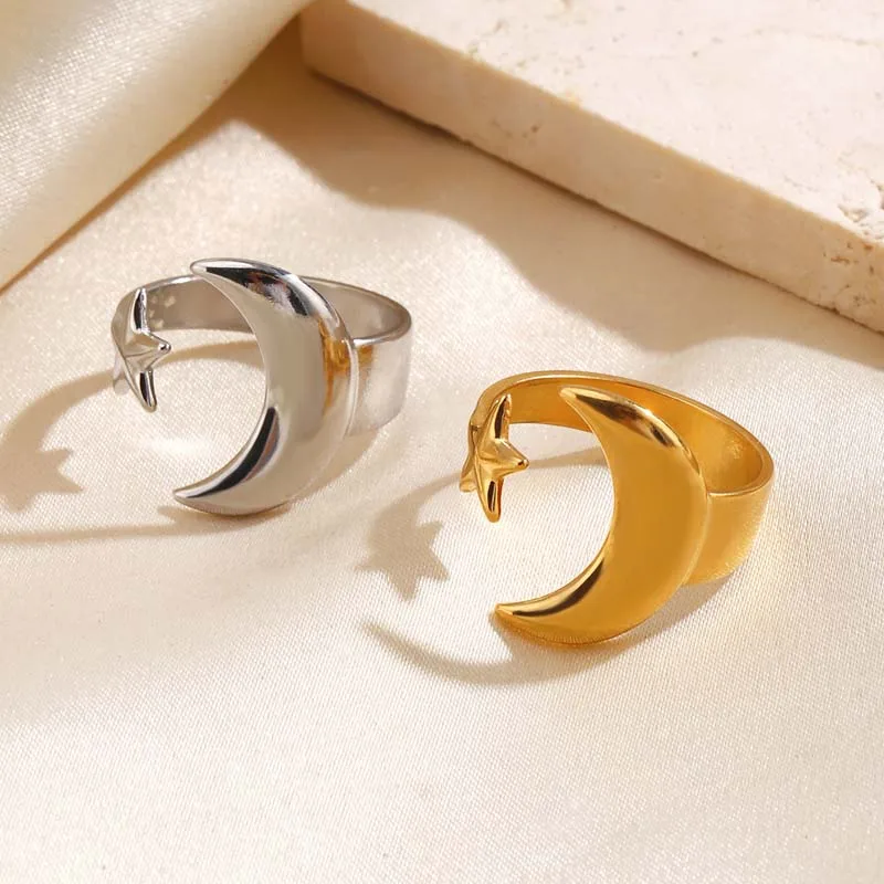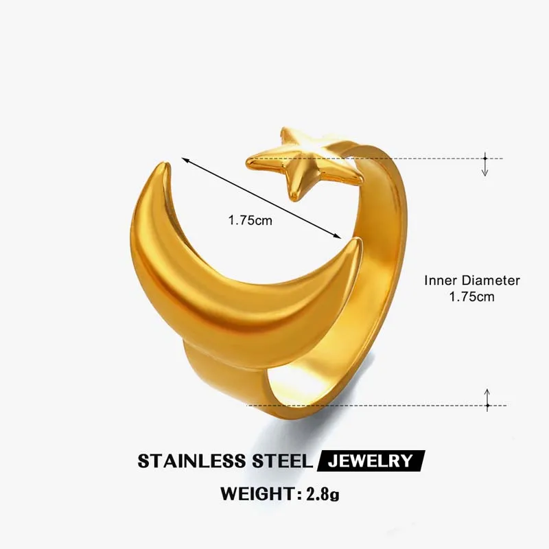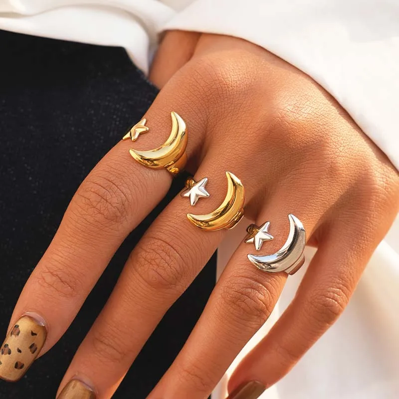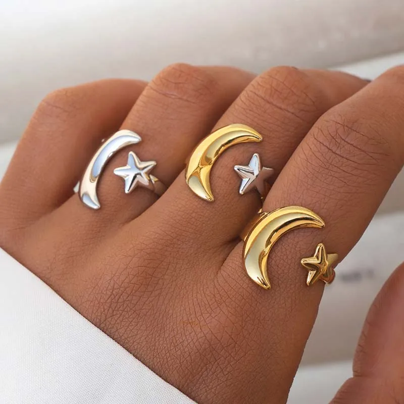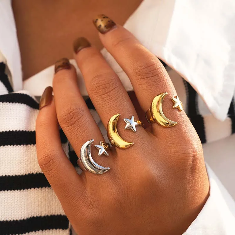 Stainless Steel Gold Color Star Moon Open Rings For Women Minimalist Metal Two Tone Adjustable Finger Ring Jewelry Party Gift