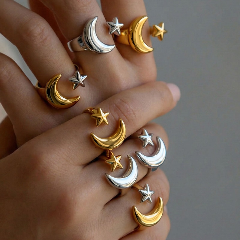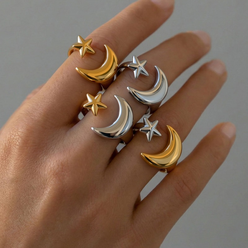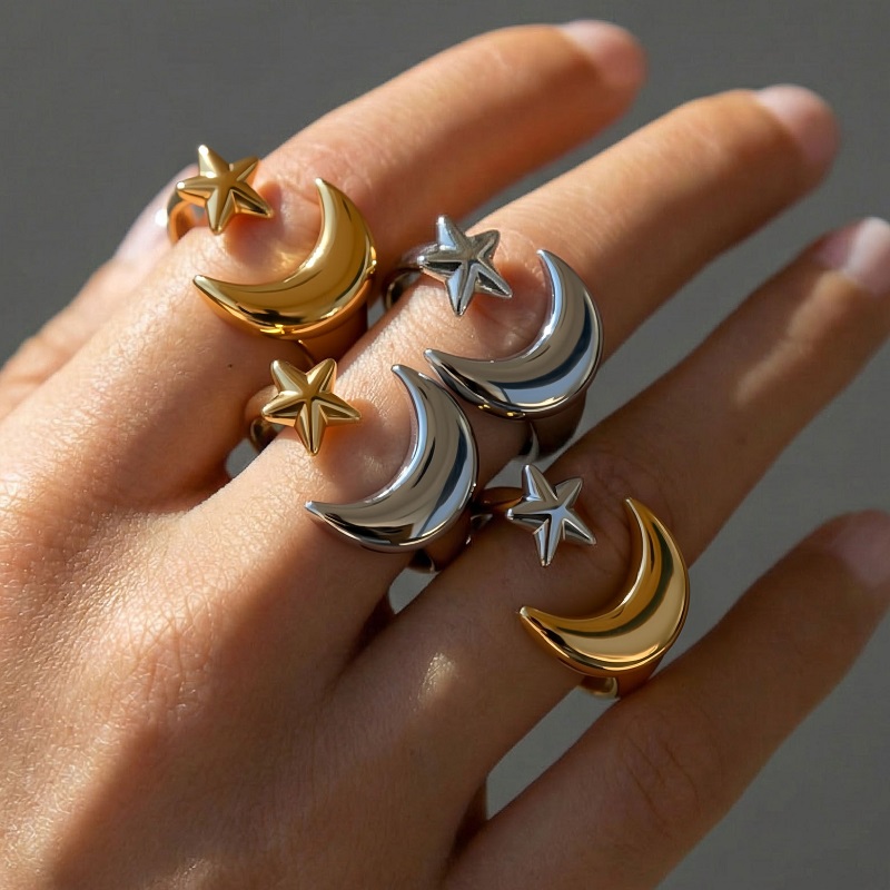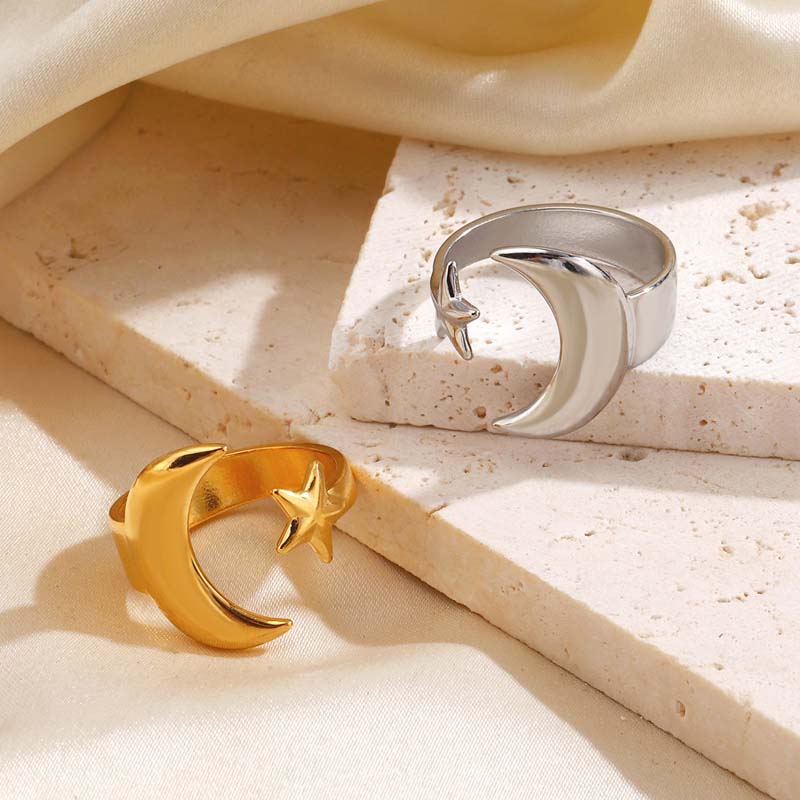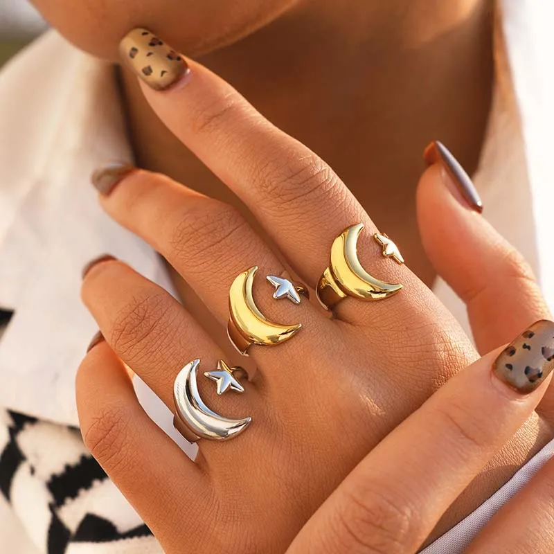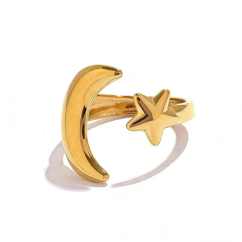 Stainless Steel Gold Color Star Moon Open Rings For Women Minimalist Metal Two Tone Adjustable Finger Ring Jewelry Party Gift