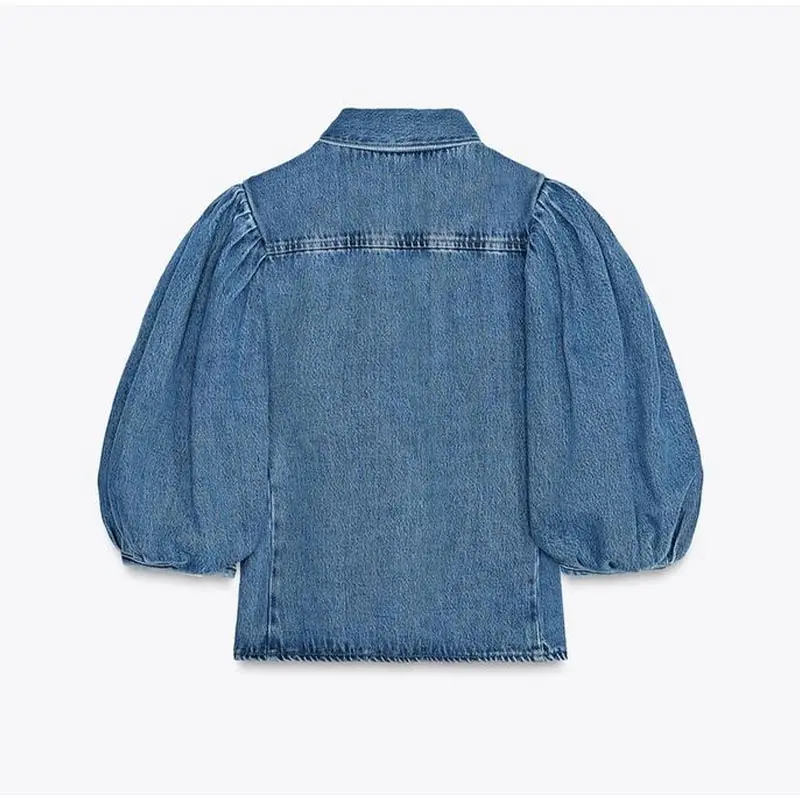 Street Denim Women’s Shirt Blue Puff Half Sleeve Single-breasted Pleated Female Blouses 2025 Spring Summer All-match Streetwear
