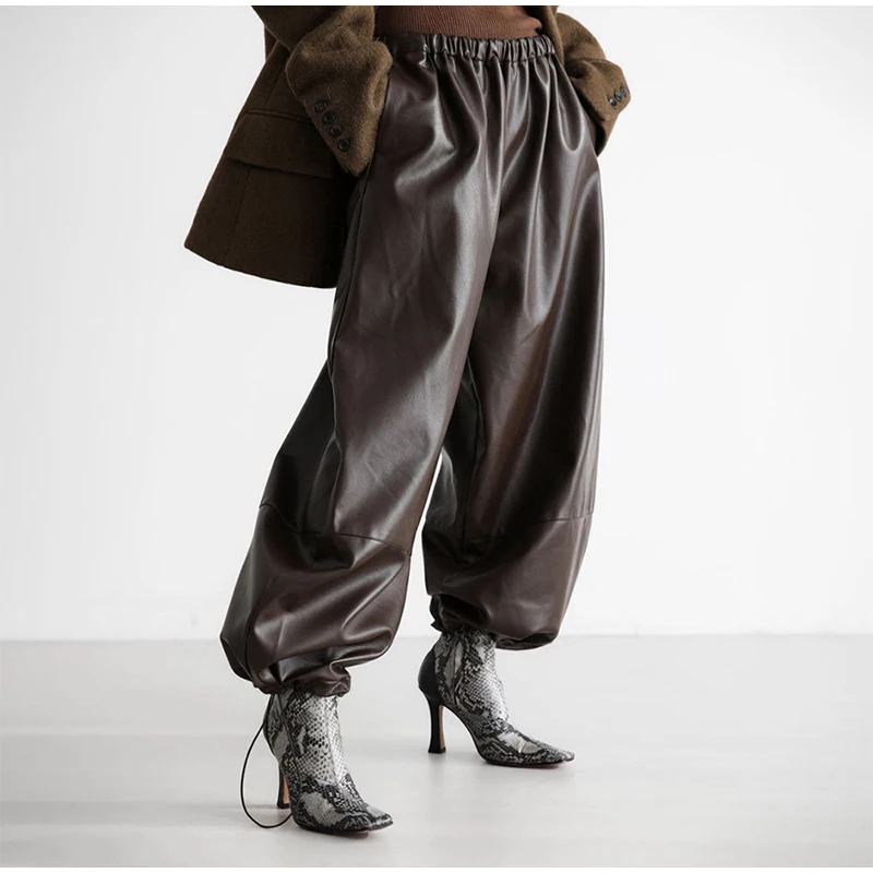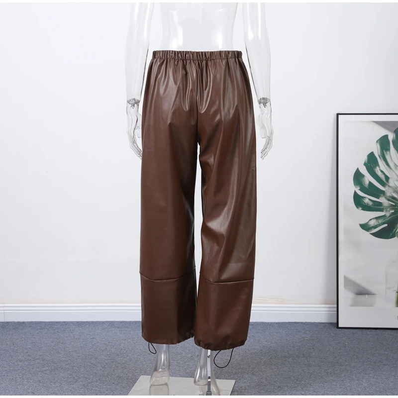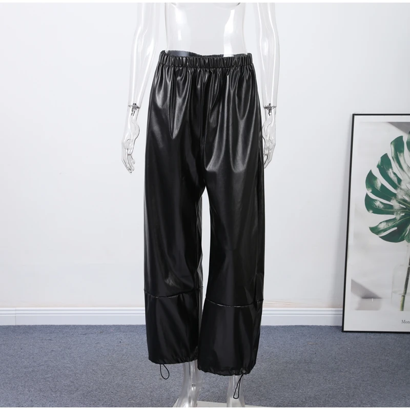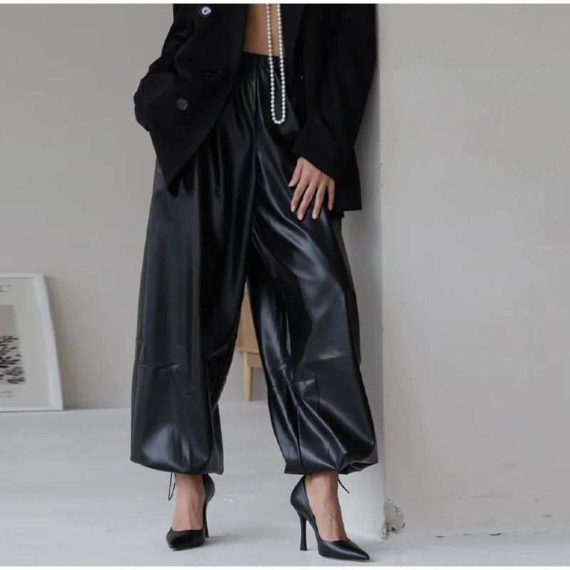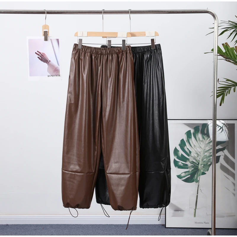 Street Fashion PU Leather Bloomers Pants Women Loose Elastic Waist Pocket Drawstring Pant 2025 Autumn Winter New Lady Trousers