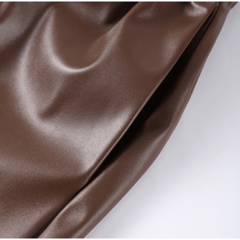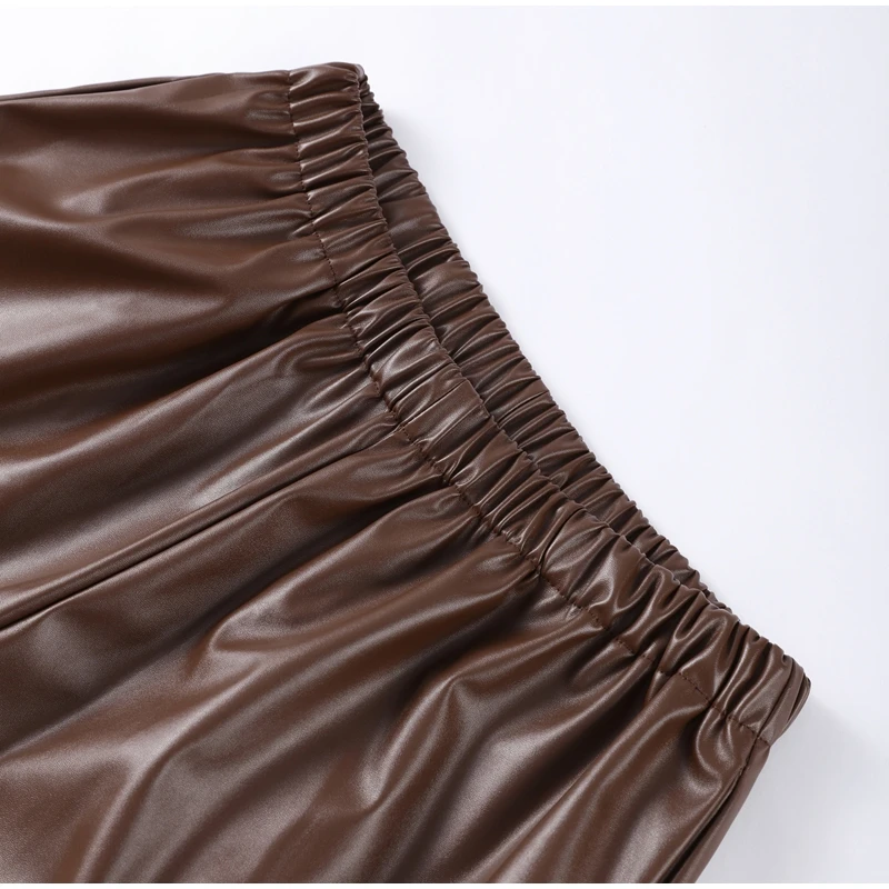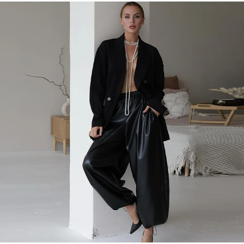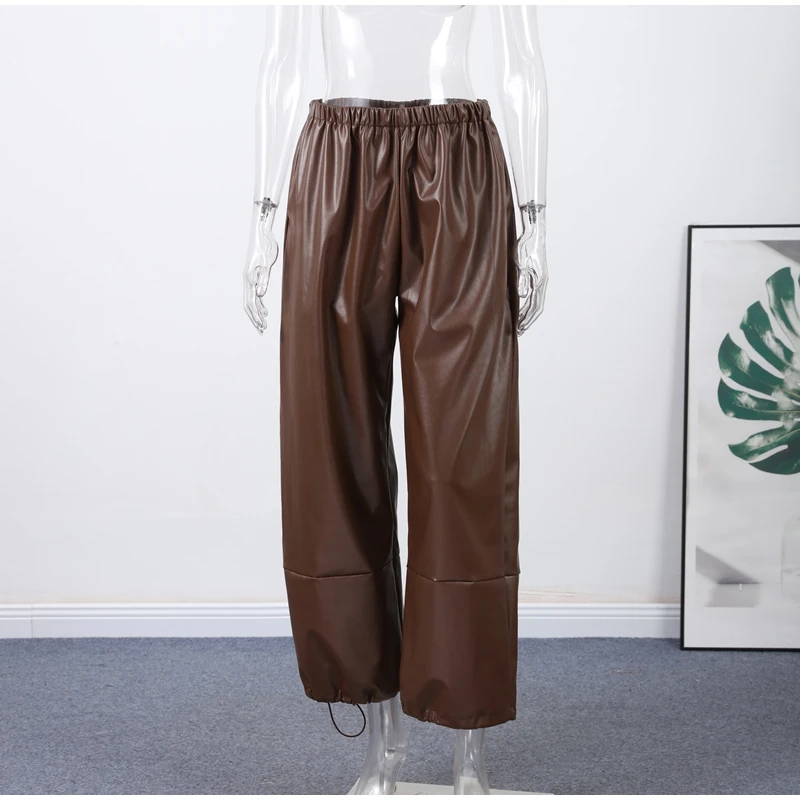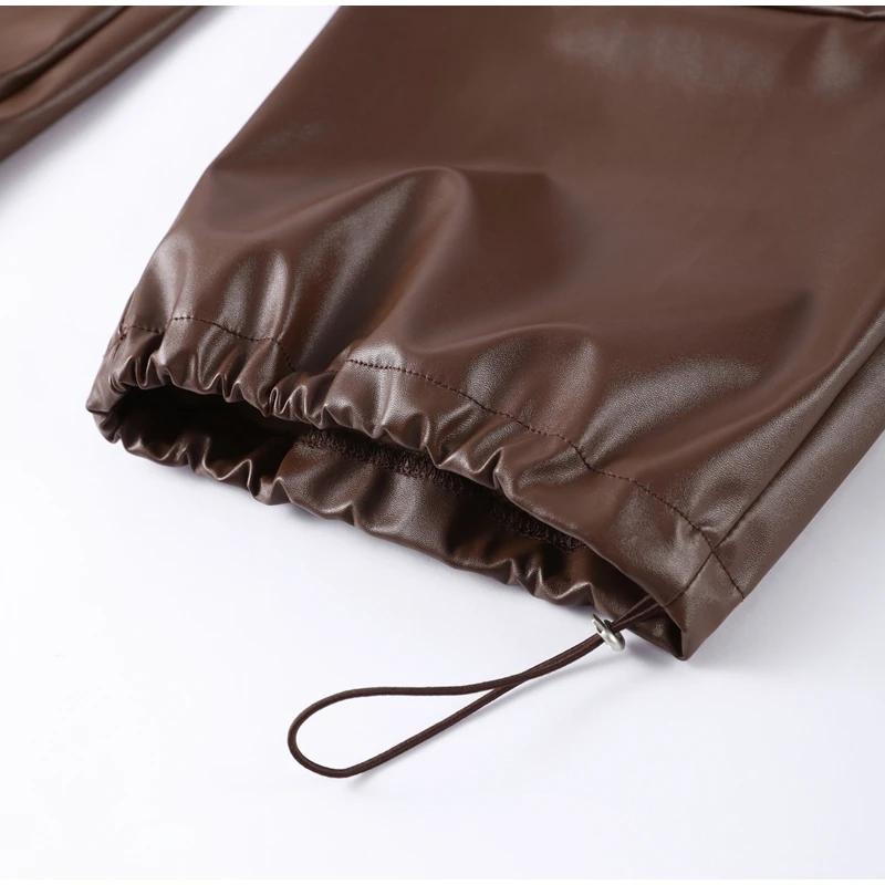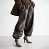 Street Fashion PU Leather Bloomers Pants Women Loose Elastic Waist Pocket Drawstring Pant 2025 Autumn Winter New Lady Trousers