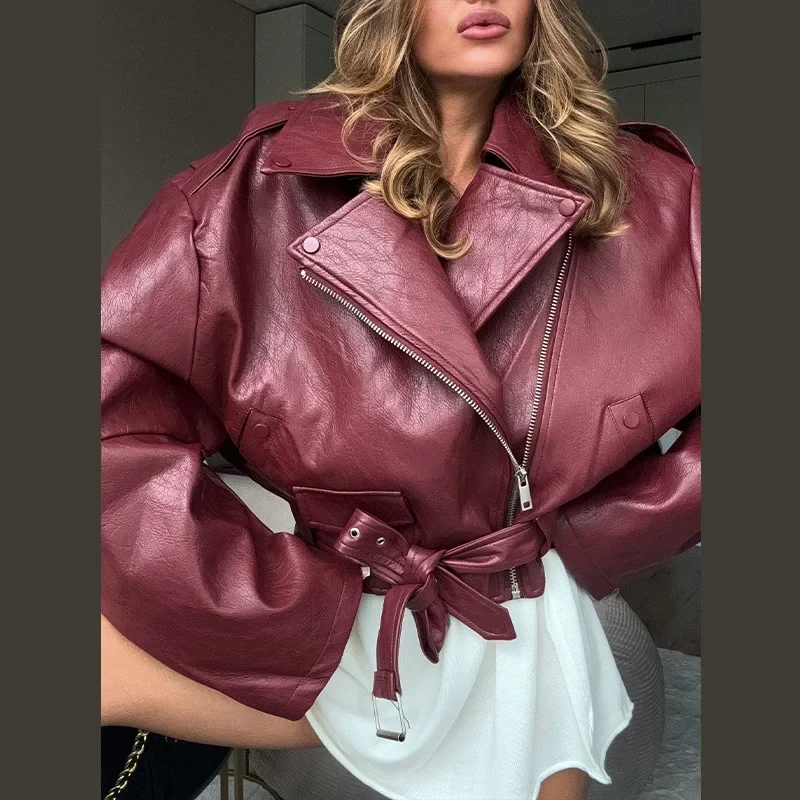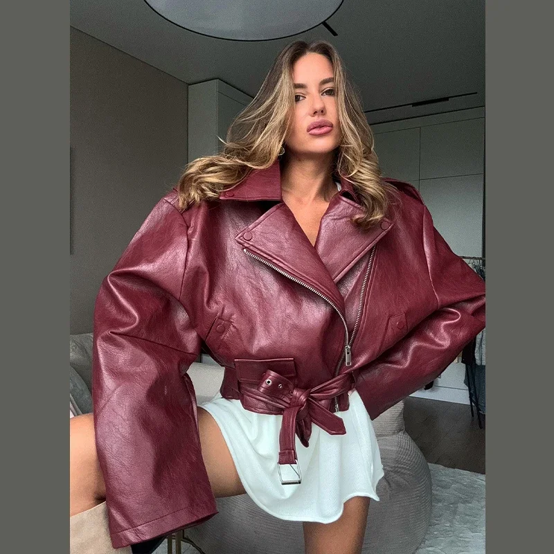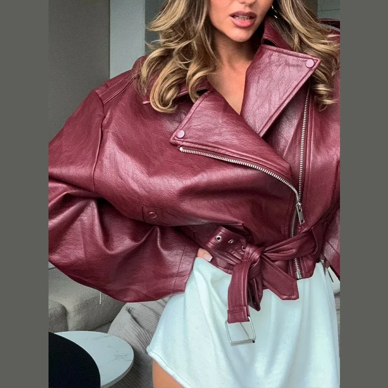 Street Pu Leather Lace Up Jacket Women Solid Zippers V-neck Loose Pockets Lady Jackets 2025 Autumn Winter Casual Female Outwears