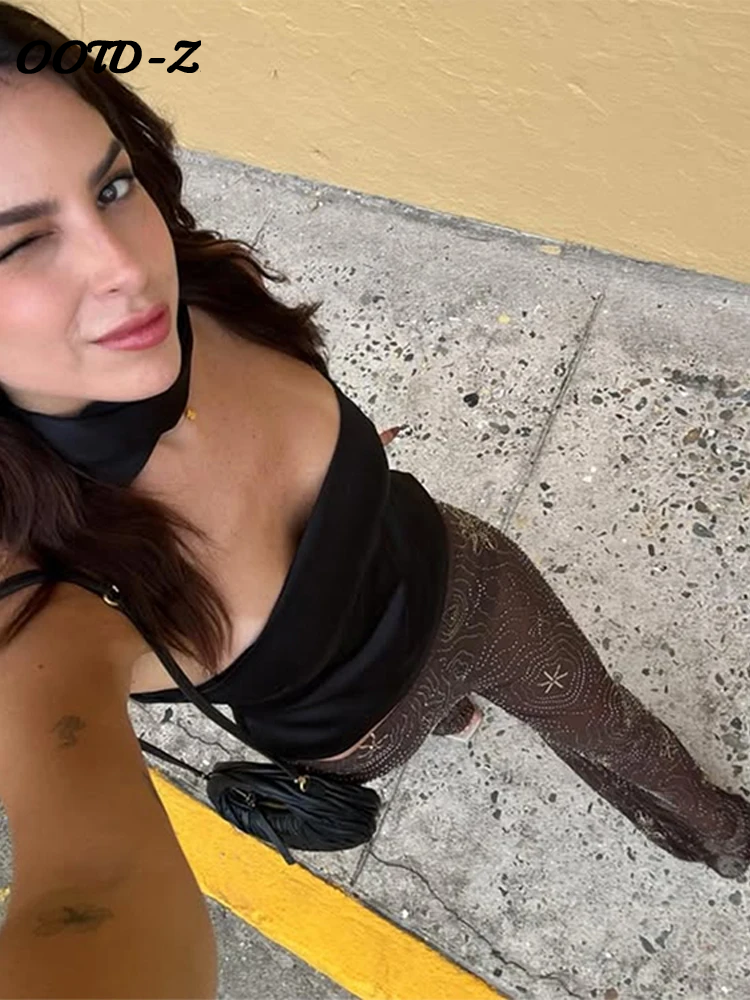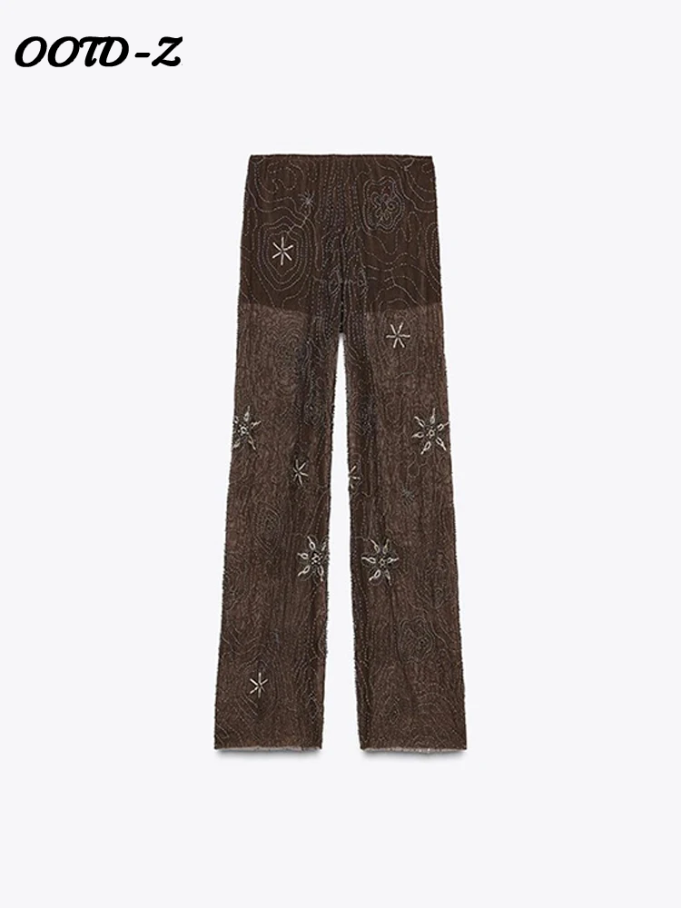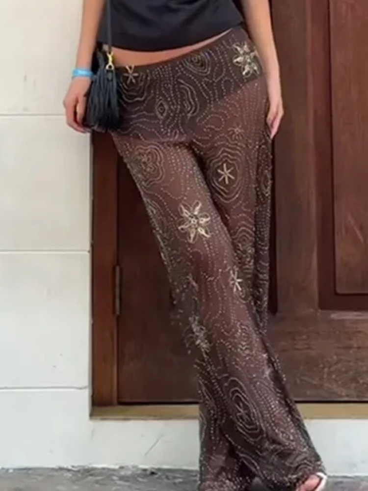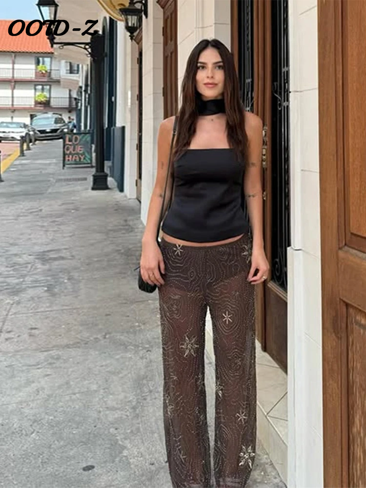 Street Sequined Print Pants Women Elastic Waist Wide Leg See Through Trousers Female 2025 Spring Summer Shiny Pant Lady Party