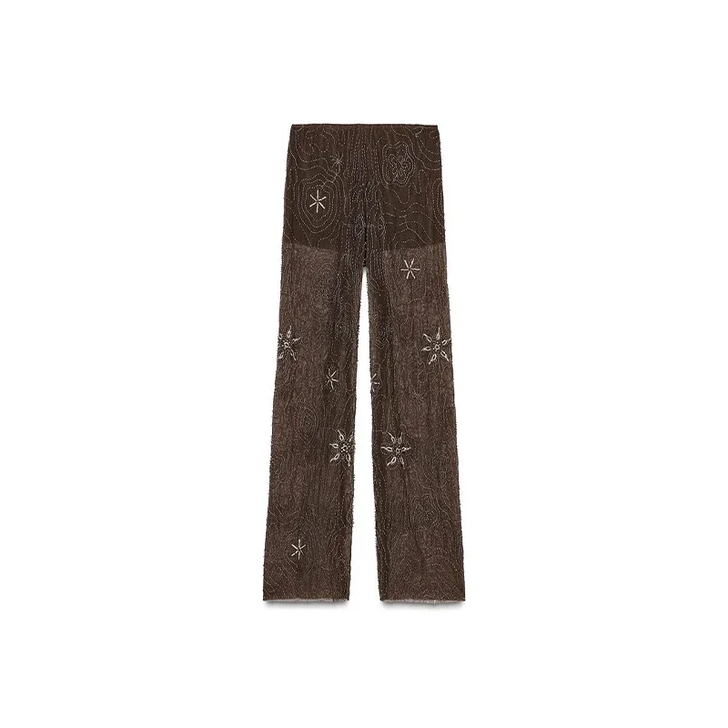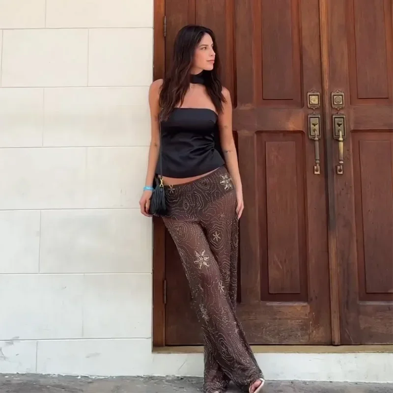 Street Sequined Print Pants Women Elastic Waist Wide Leg See Through Trousers Female 2025 Spring Summer Shiny Pant Lady Party