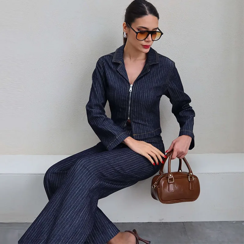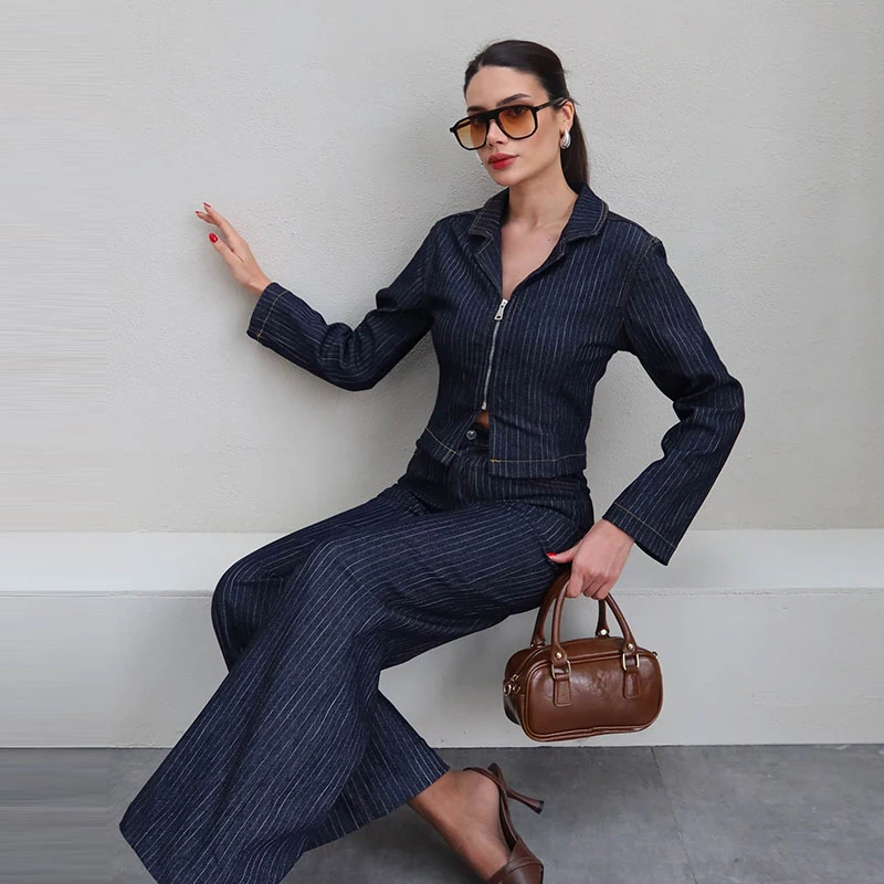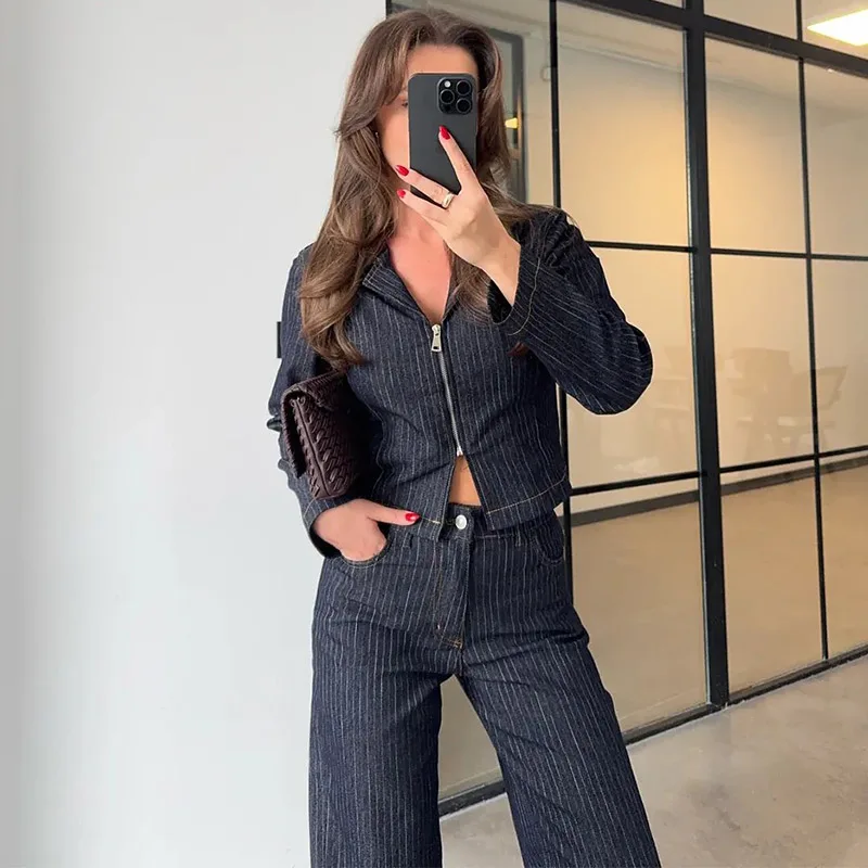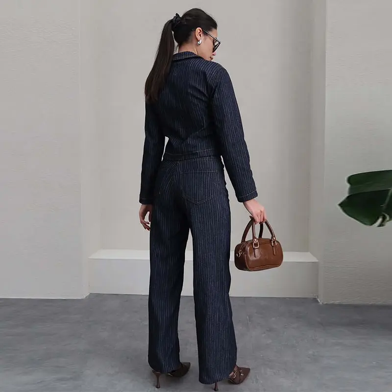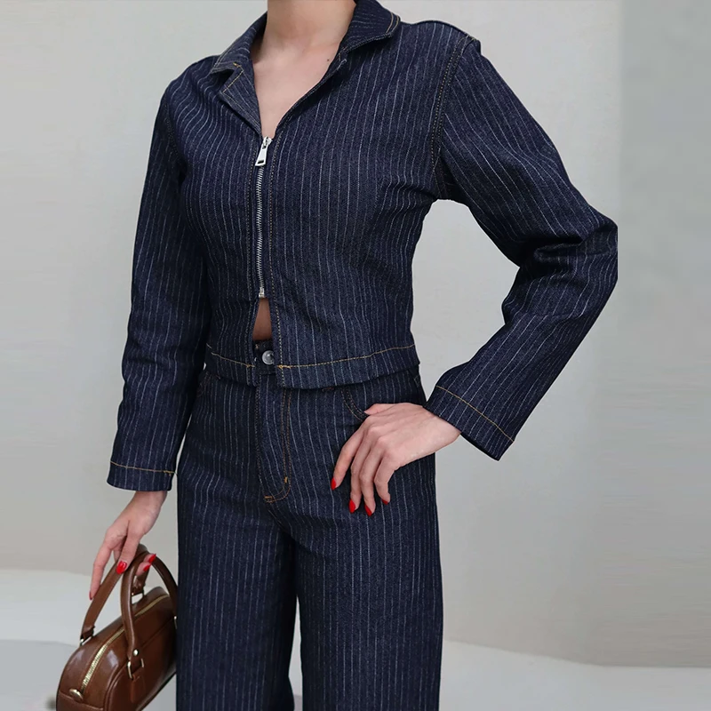 Striped Jeans Women Suit Lapel Long Sleeve Zippers Coat Wide Leg Trousers Female Set 2025 Spring Urban Casual Denim Lady Set