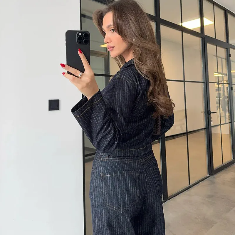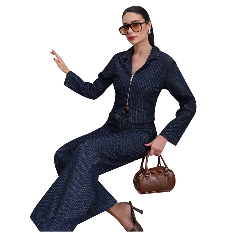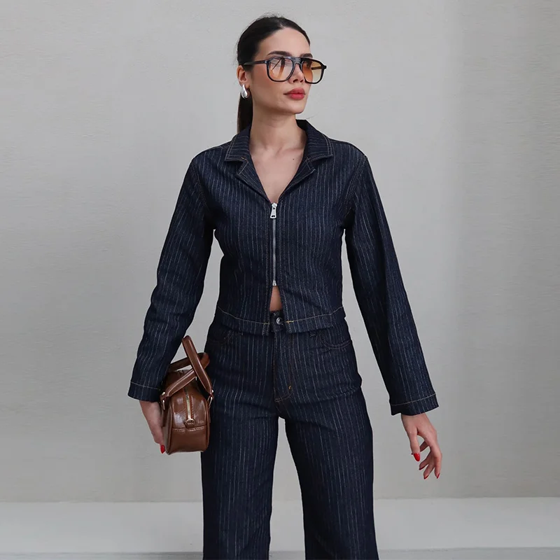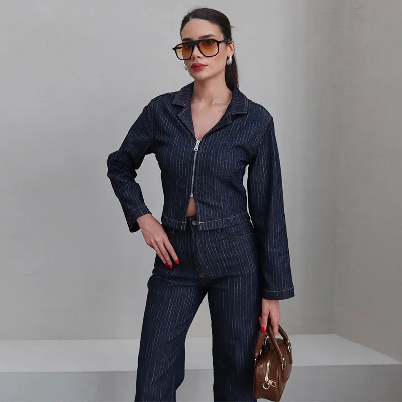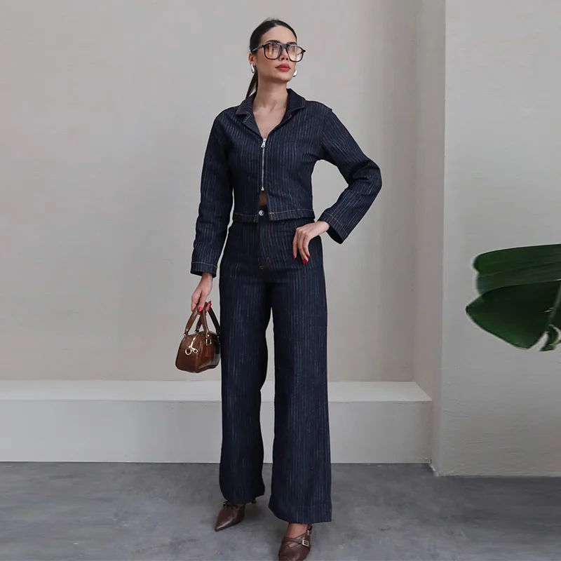 Striped Jeans Women Suit Lapel Long Sleeve Zippers Coat Wide Leg Trousers Female Set 2025 Spring Urban Casual Denim Lady Set