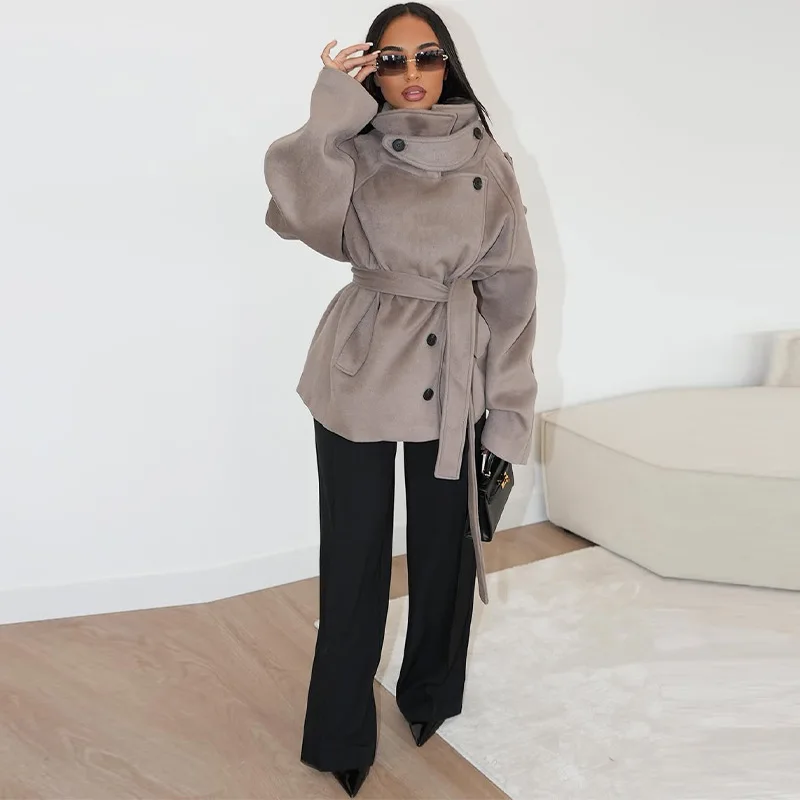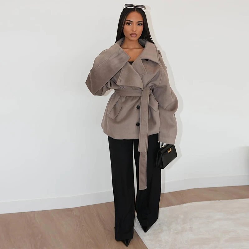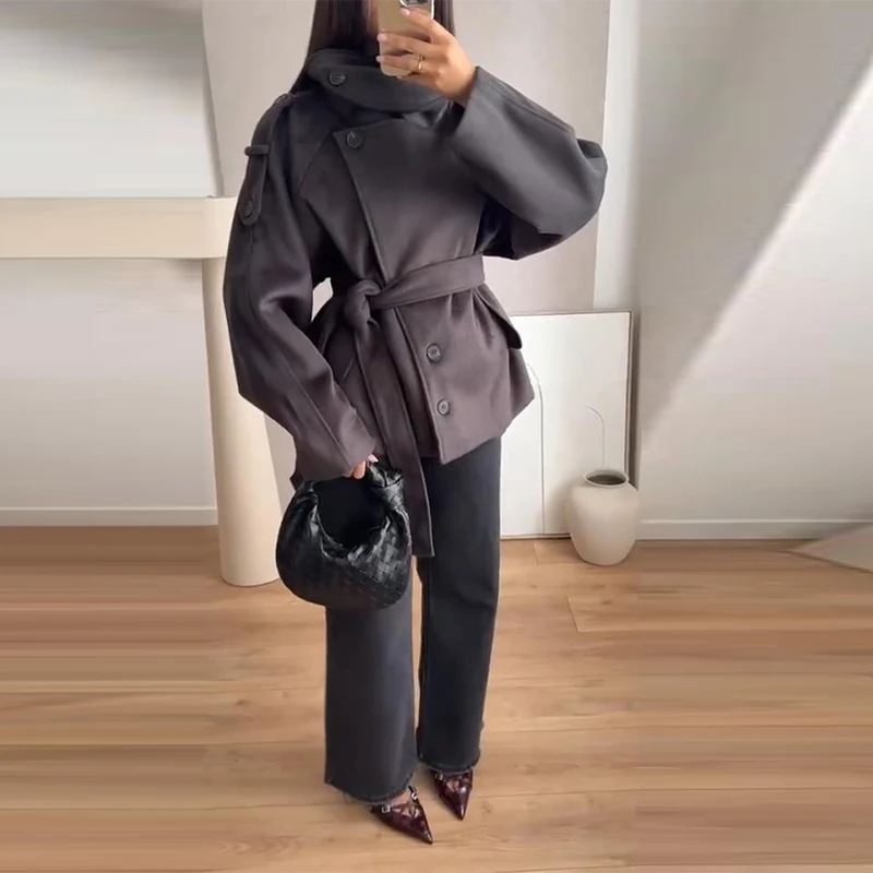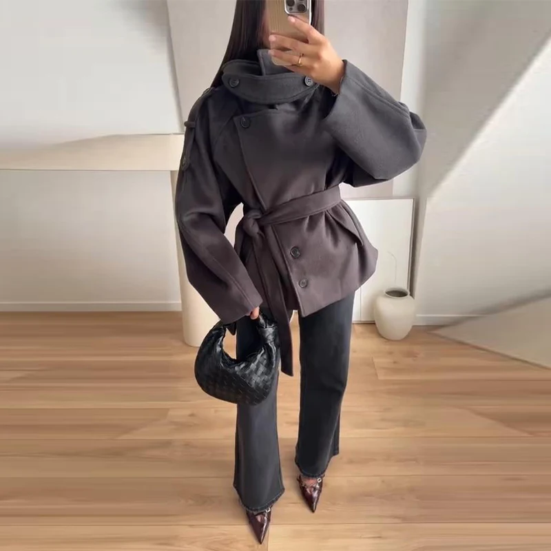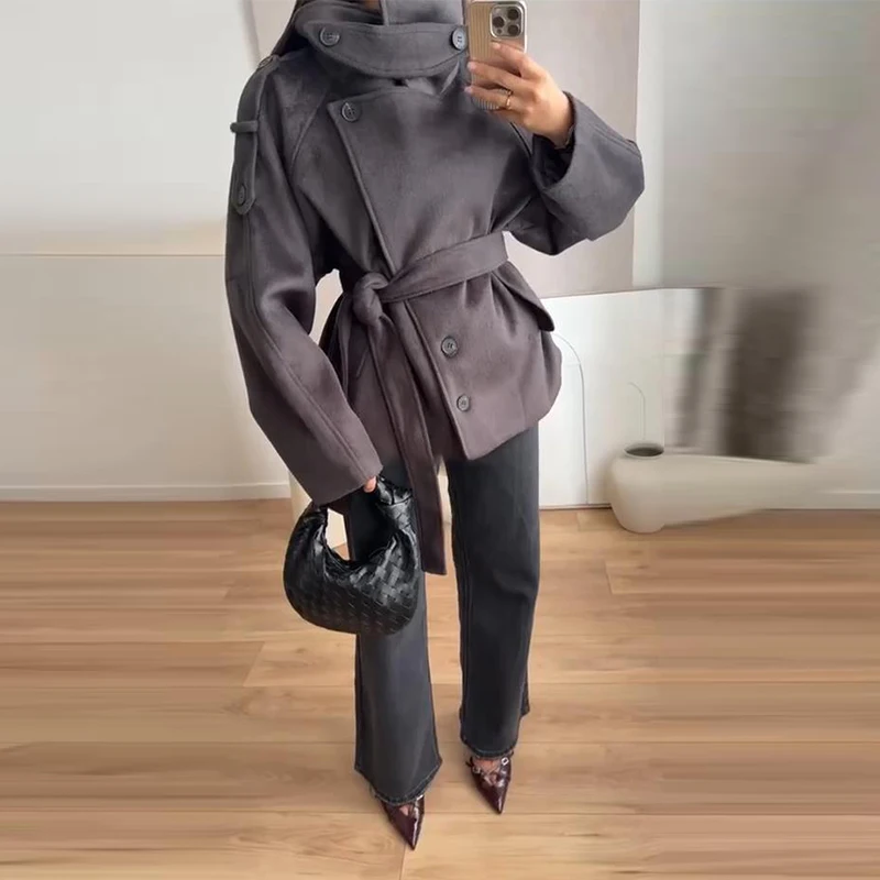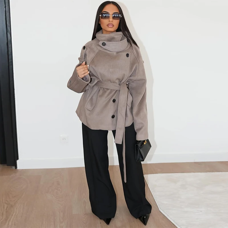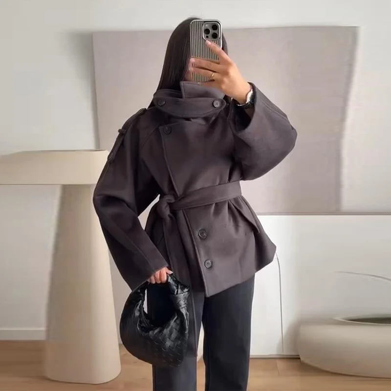 Stylish Woolen Belt Coat Women Stand Collar Buttons Pocket Full Sleeve Jacket Female 2025 Autumn Winter Fashion Lady Outwear New