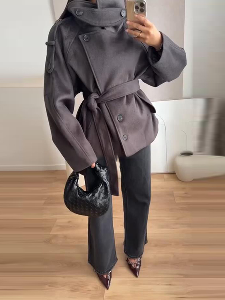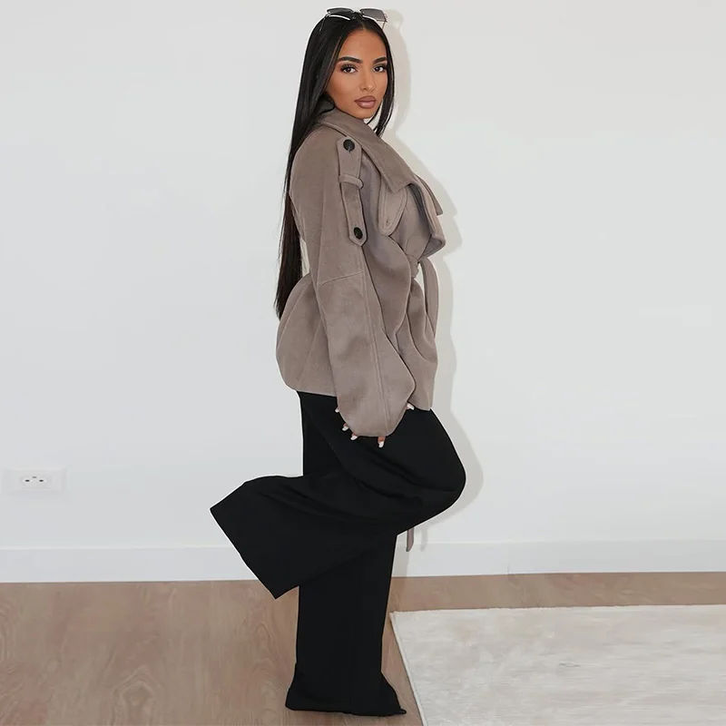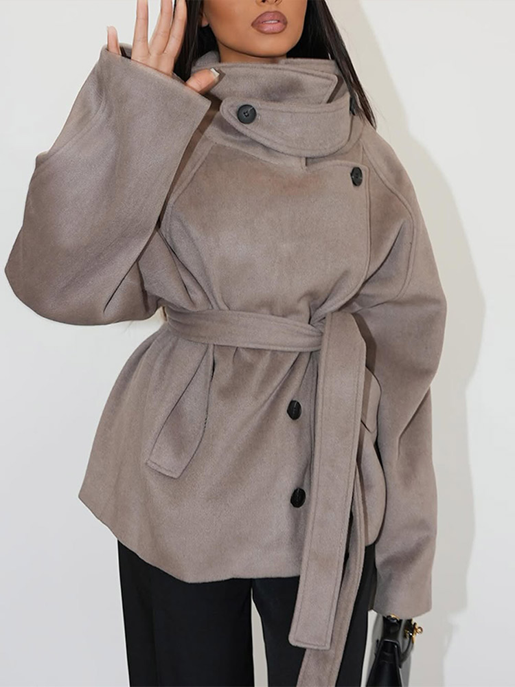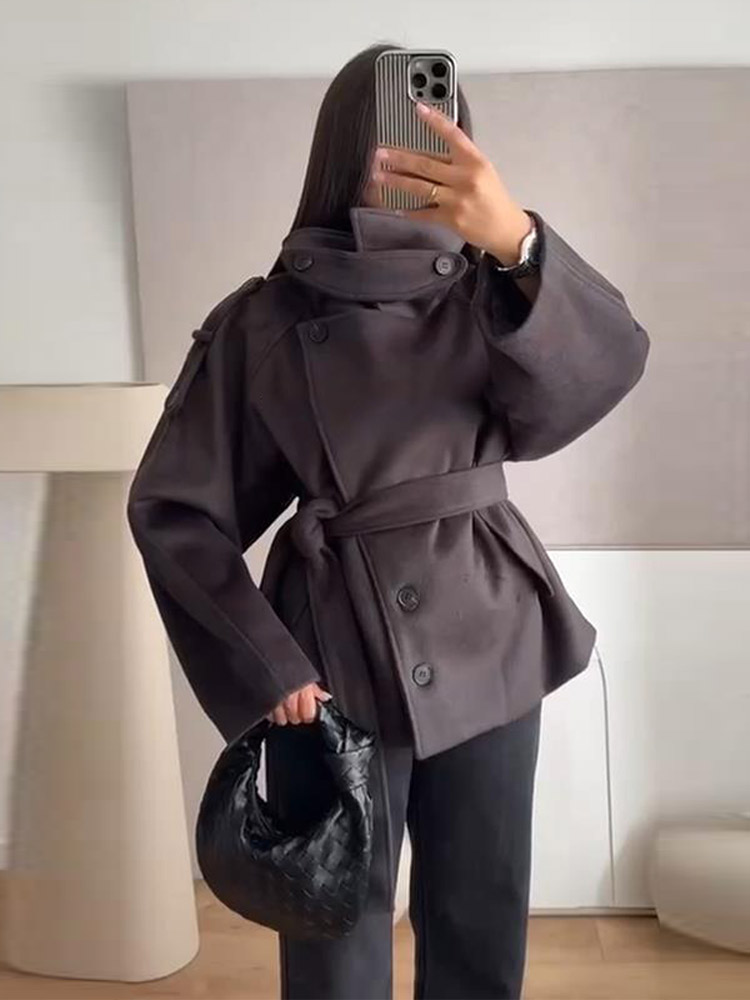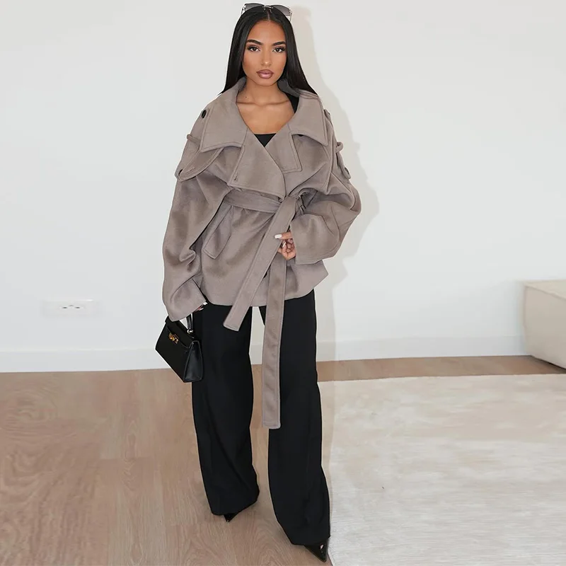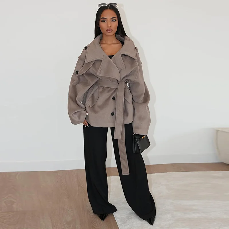 Stylish Woolen Belt Coat Women Stand Collar Buttons Pocket Full Sleeve Jacket Female 2025 Autumn Winter Fashion Lady Outwear New