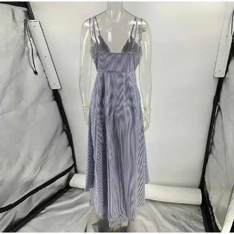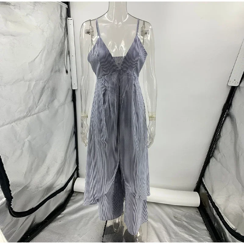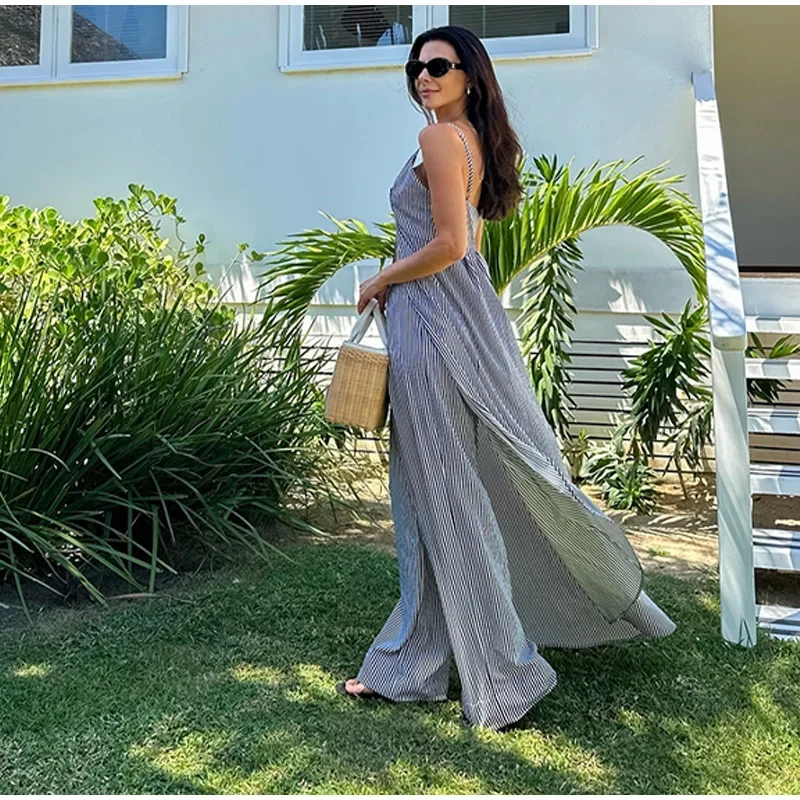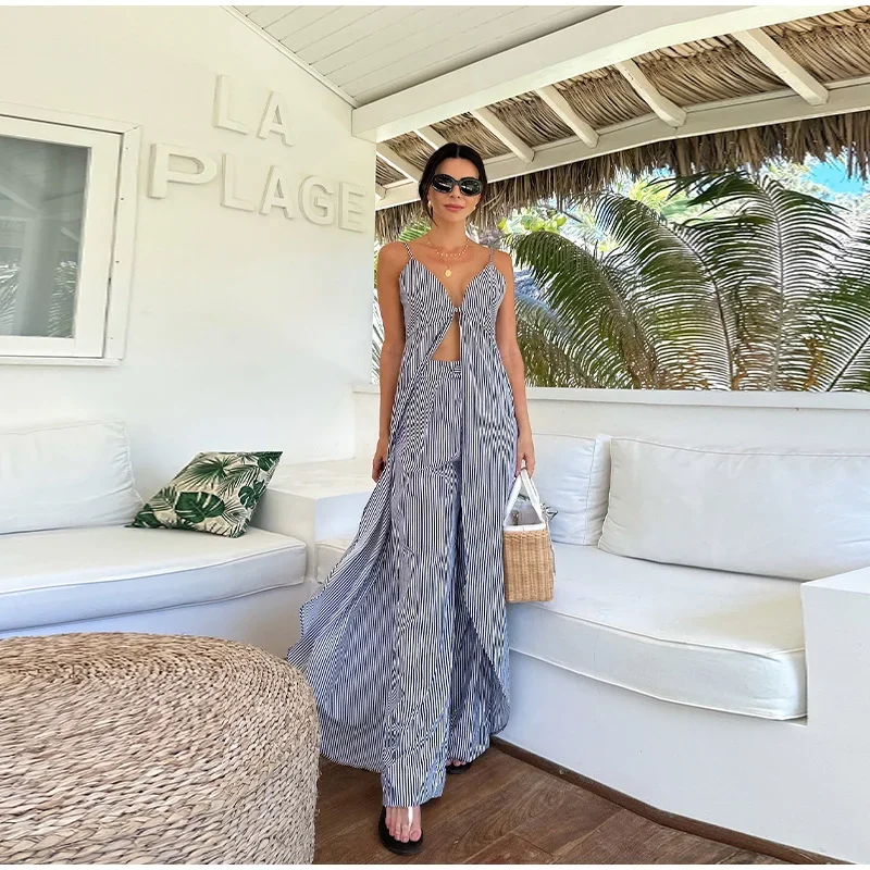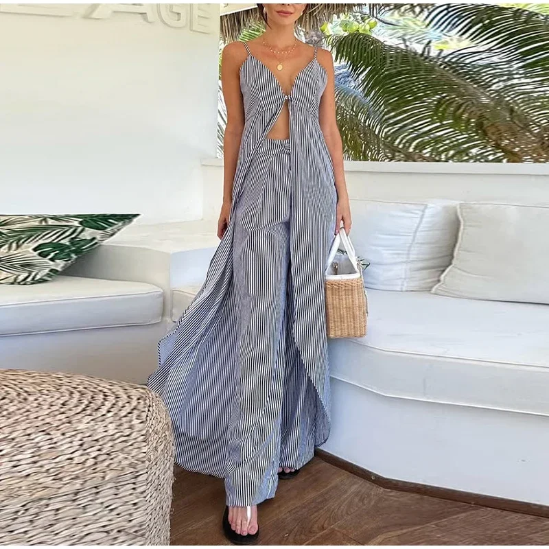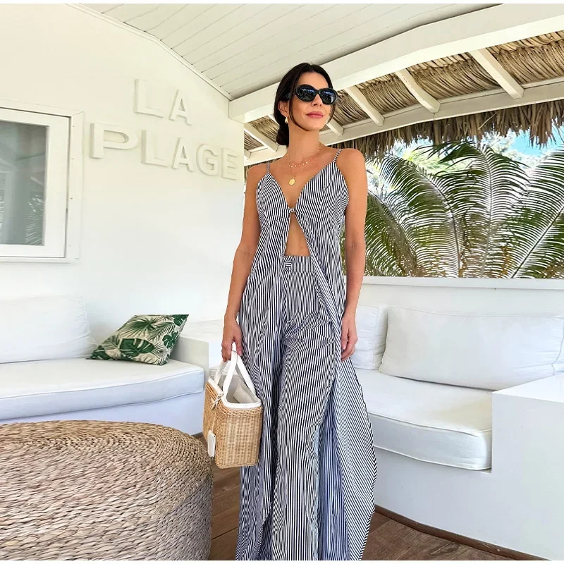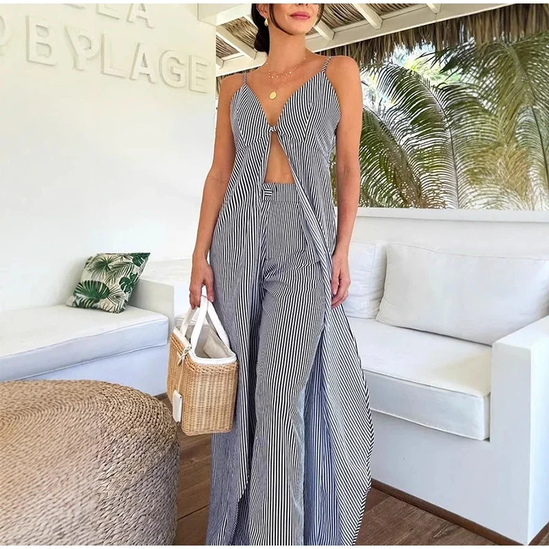 Summer Women Long Top Striped 2pcs Set Holiday V Neck Sexy Pants Simple Outfit 2025 New Sleeveless Beach Lady Suits