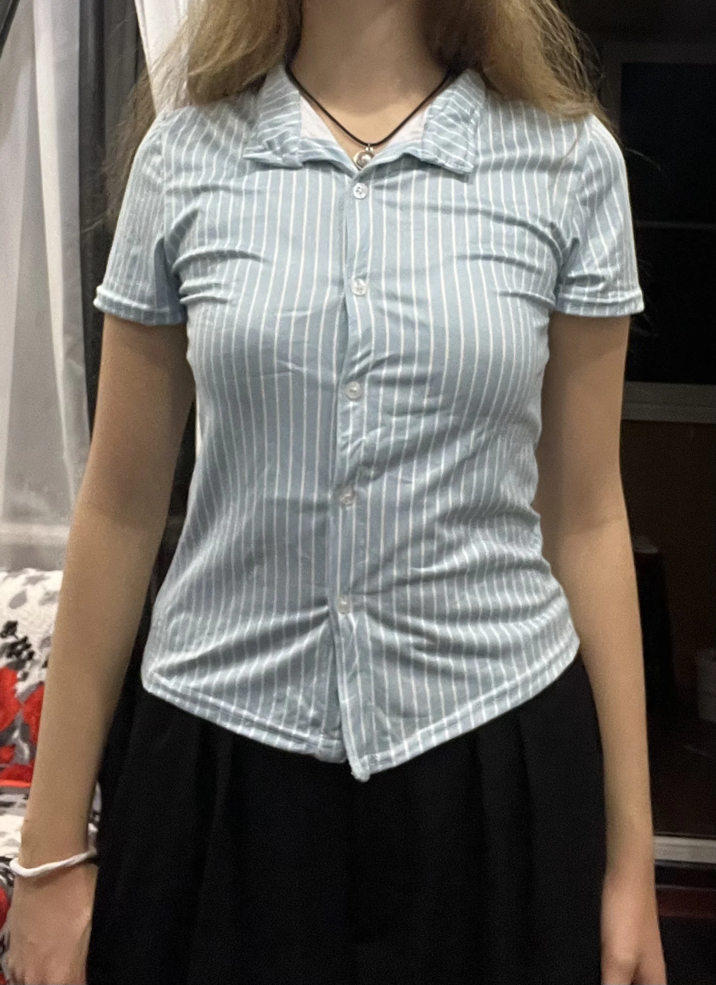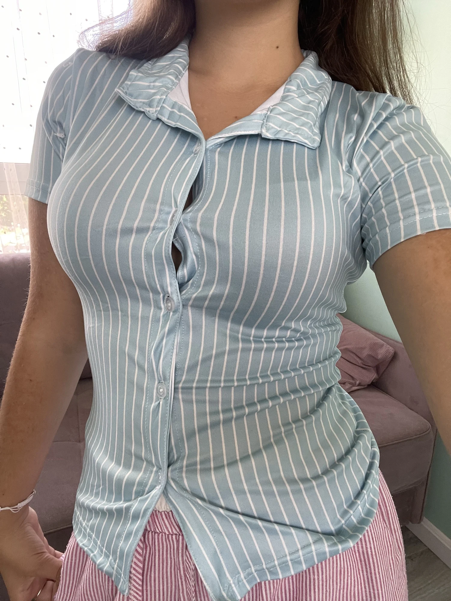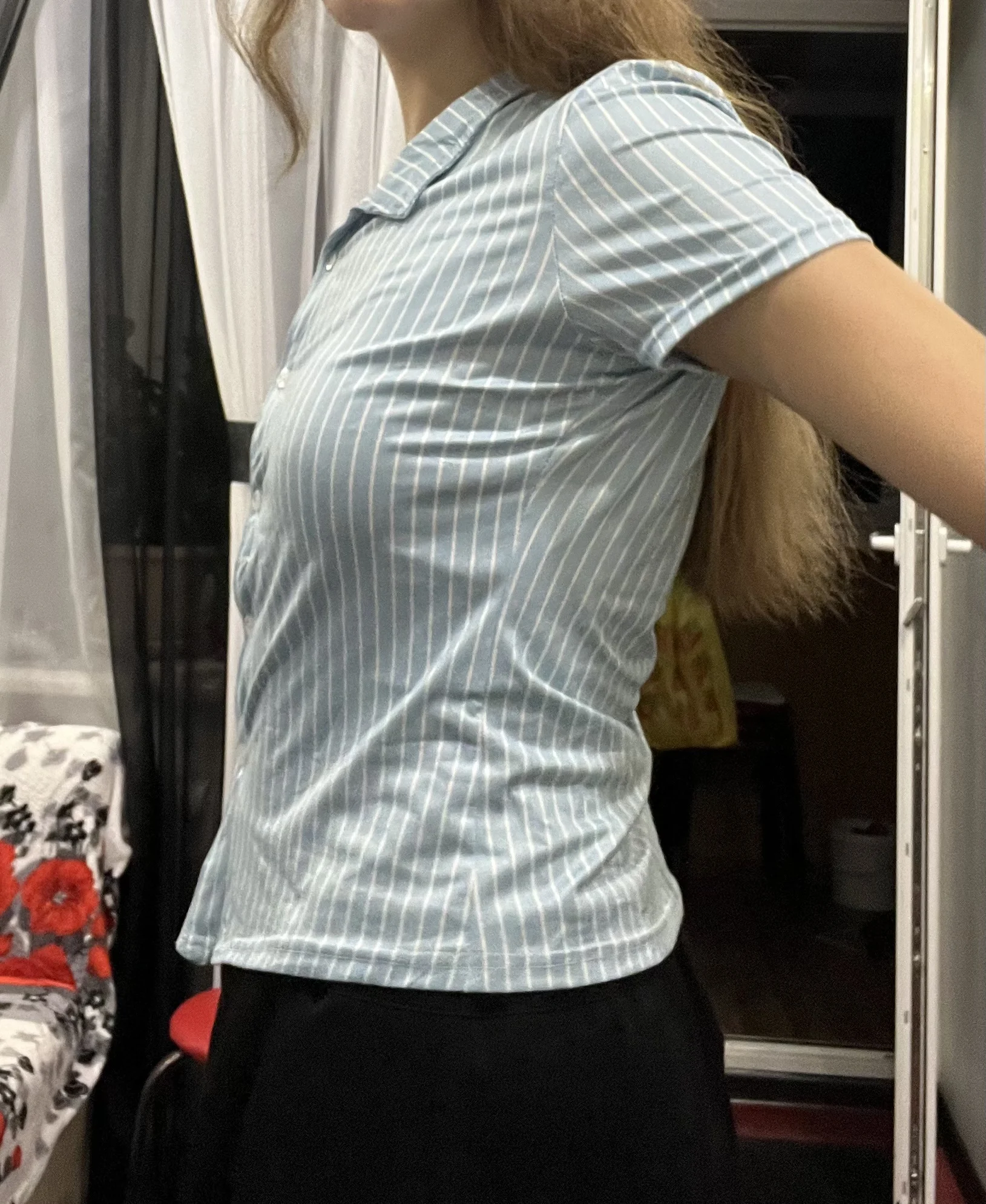 The shirt is good, comfortable to wear, but it runs a bit small. I usually wear XS, but here size S is a bit small both in the chest and waist (my measurements: waist 75, hips 60, hips 90, height 162). and the color of the shirt is also slightly different, in real life the color is brighter, not like in the photo, in the photo it is lighter and more cute, but overall, I'm satisfied and I like it :) ☘️ if you are looking for a shirt that won't hug your figure and look like a blouse, then it's probably better to look for something else. 🍓 🤲🏻