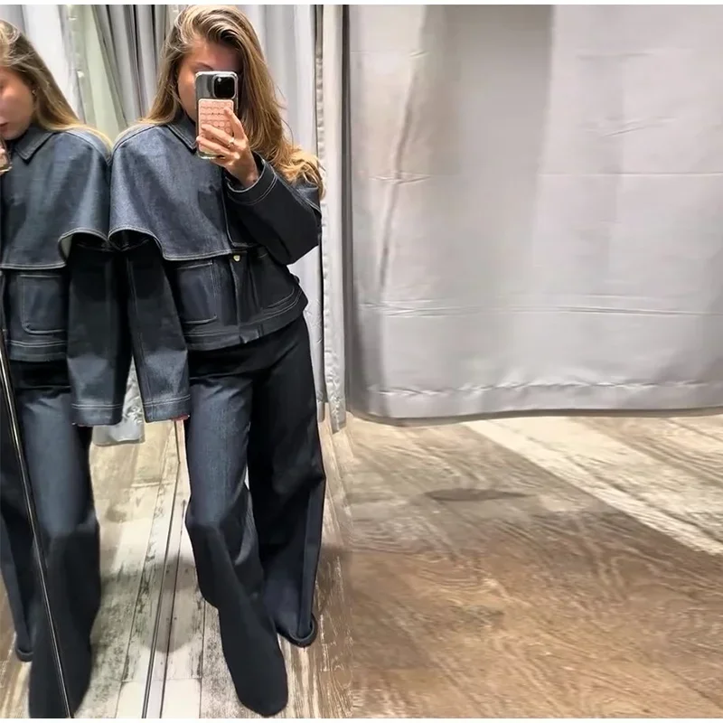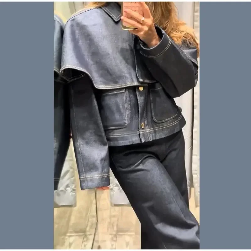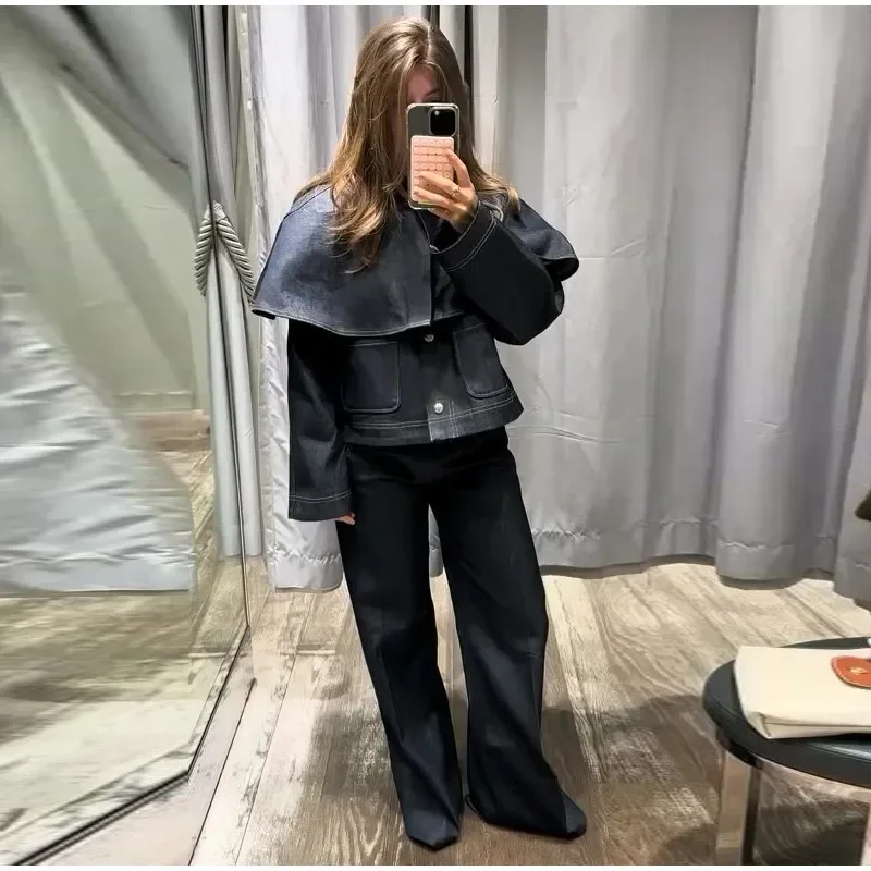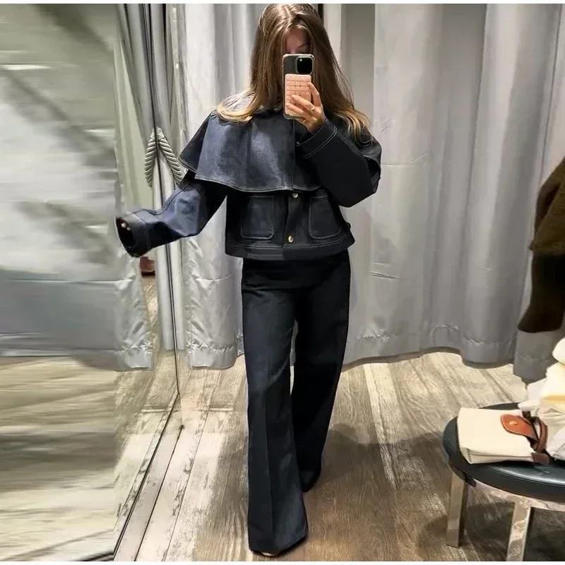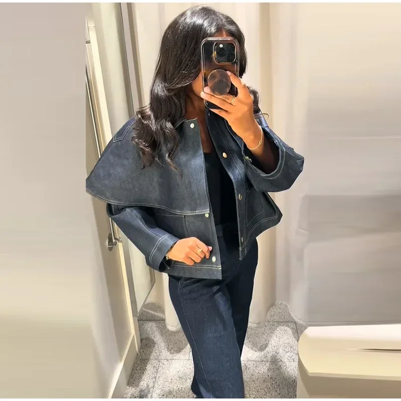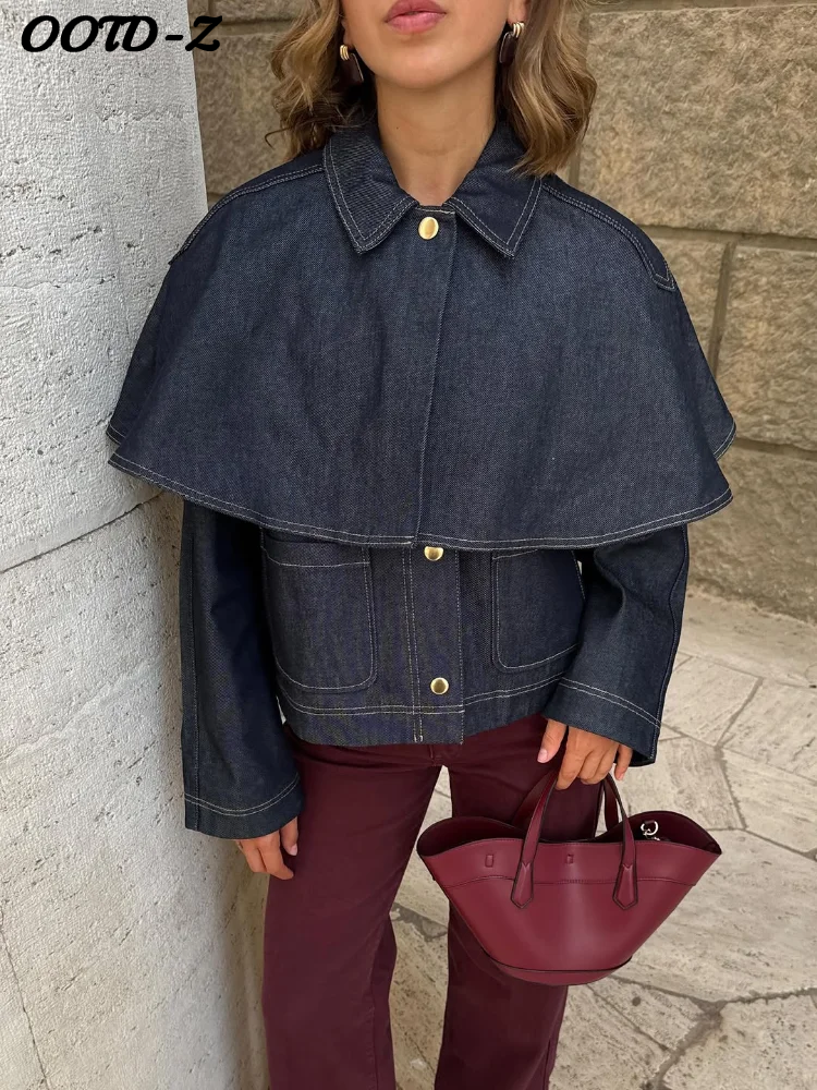 Trendy Denim Cape Coat Women Loose Lapel Full Sleeve Single Breasted Pocket Female Jacket 2025 Casual Autumn Winter Lady Outwear
