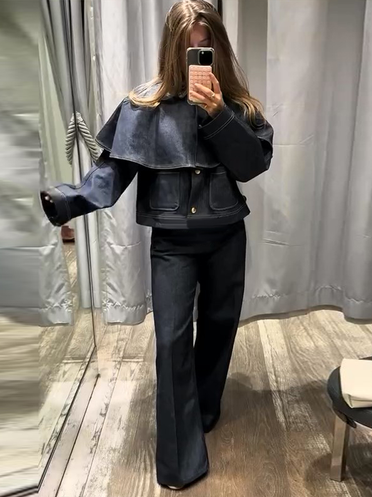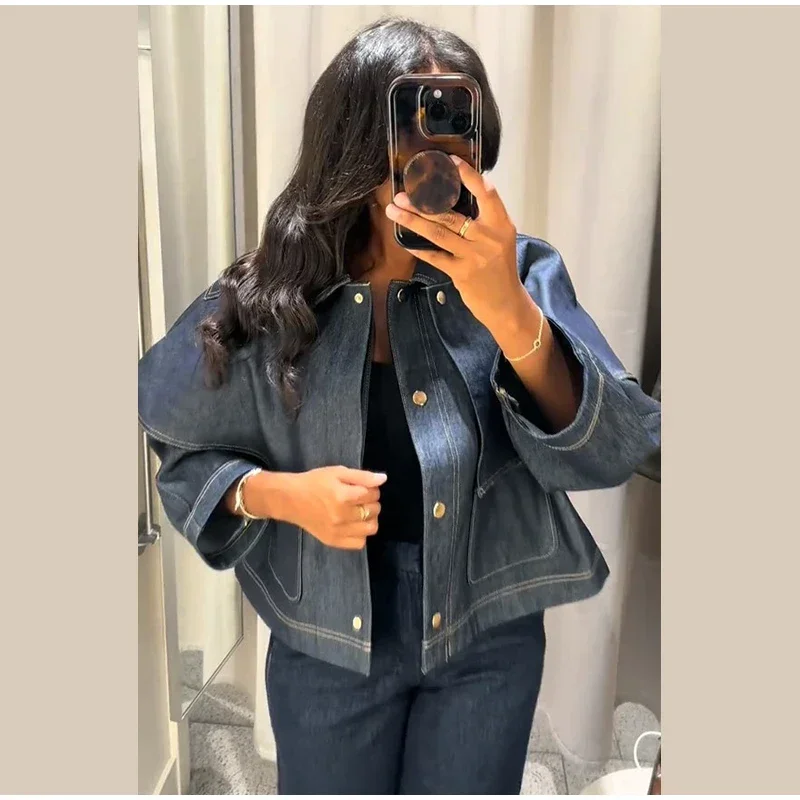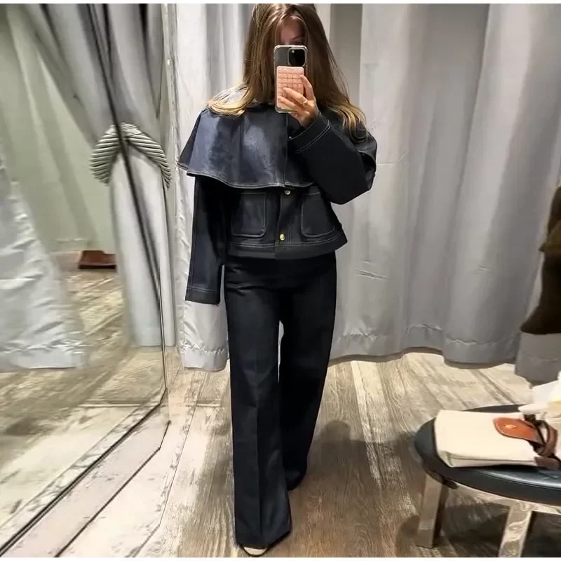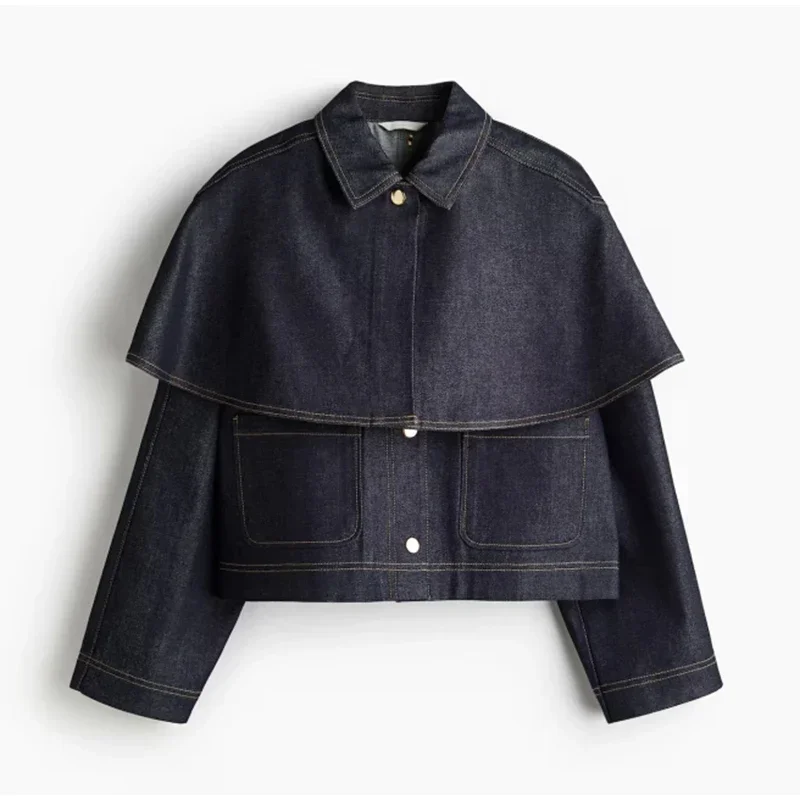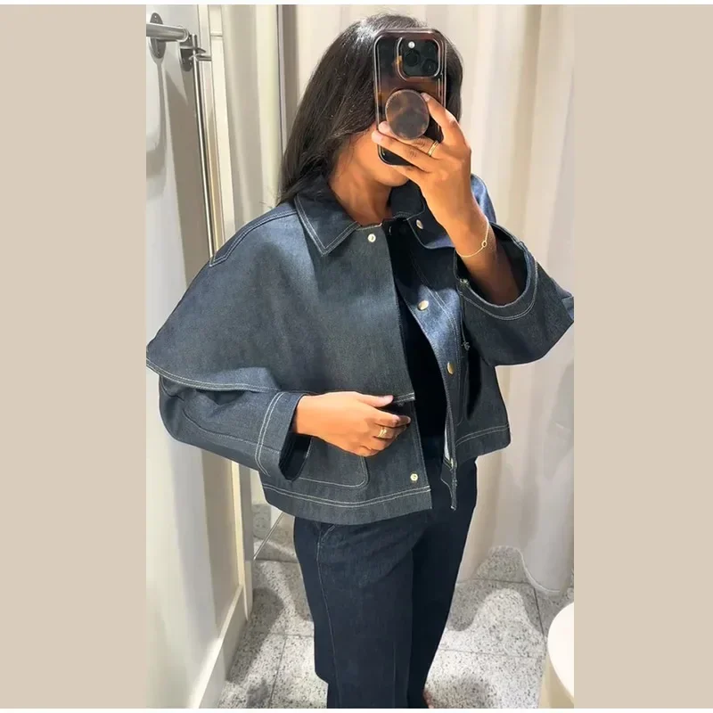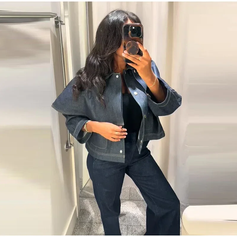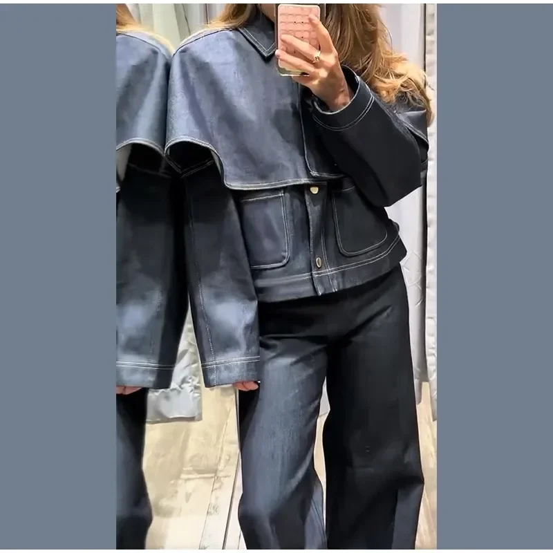 Trendy Denim Cape Coat Women Loose Lapel Full Sleeve Single Breasted Pocket Female Jacket 2025 Casual Autumn Winter Lady Outwear