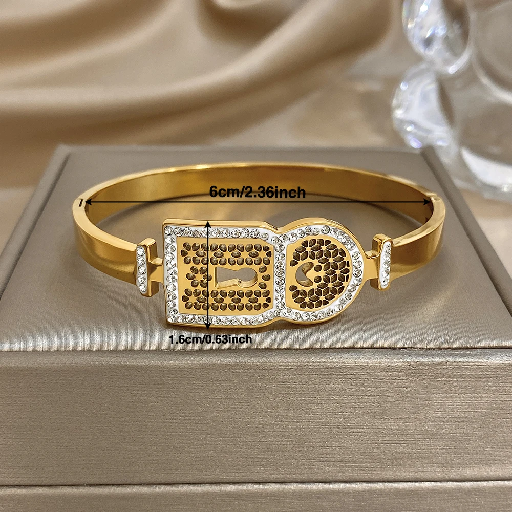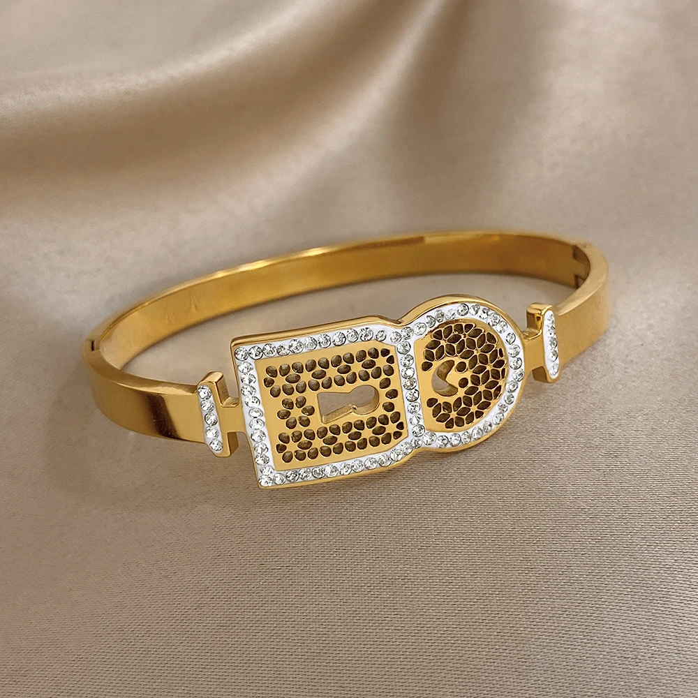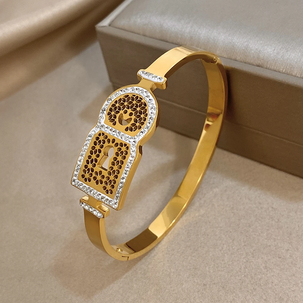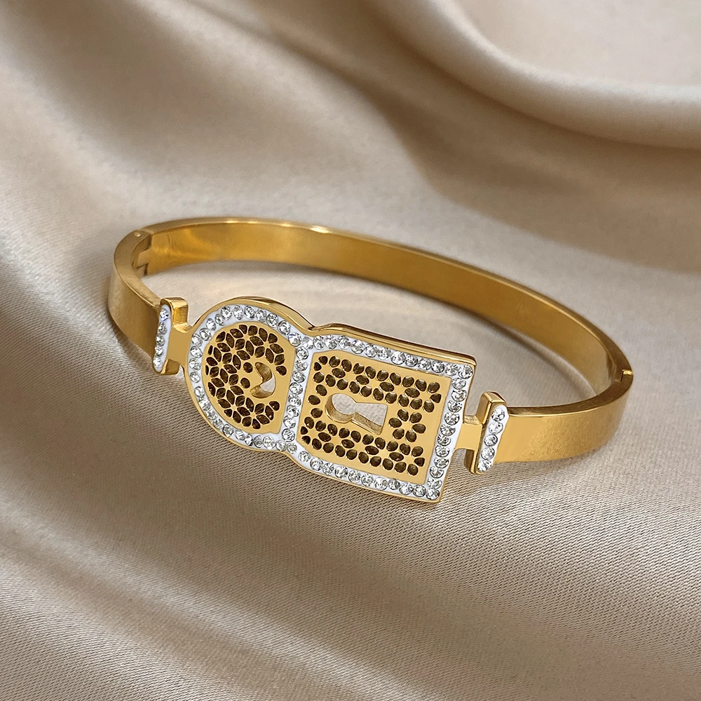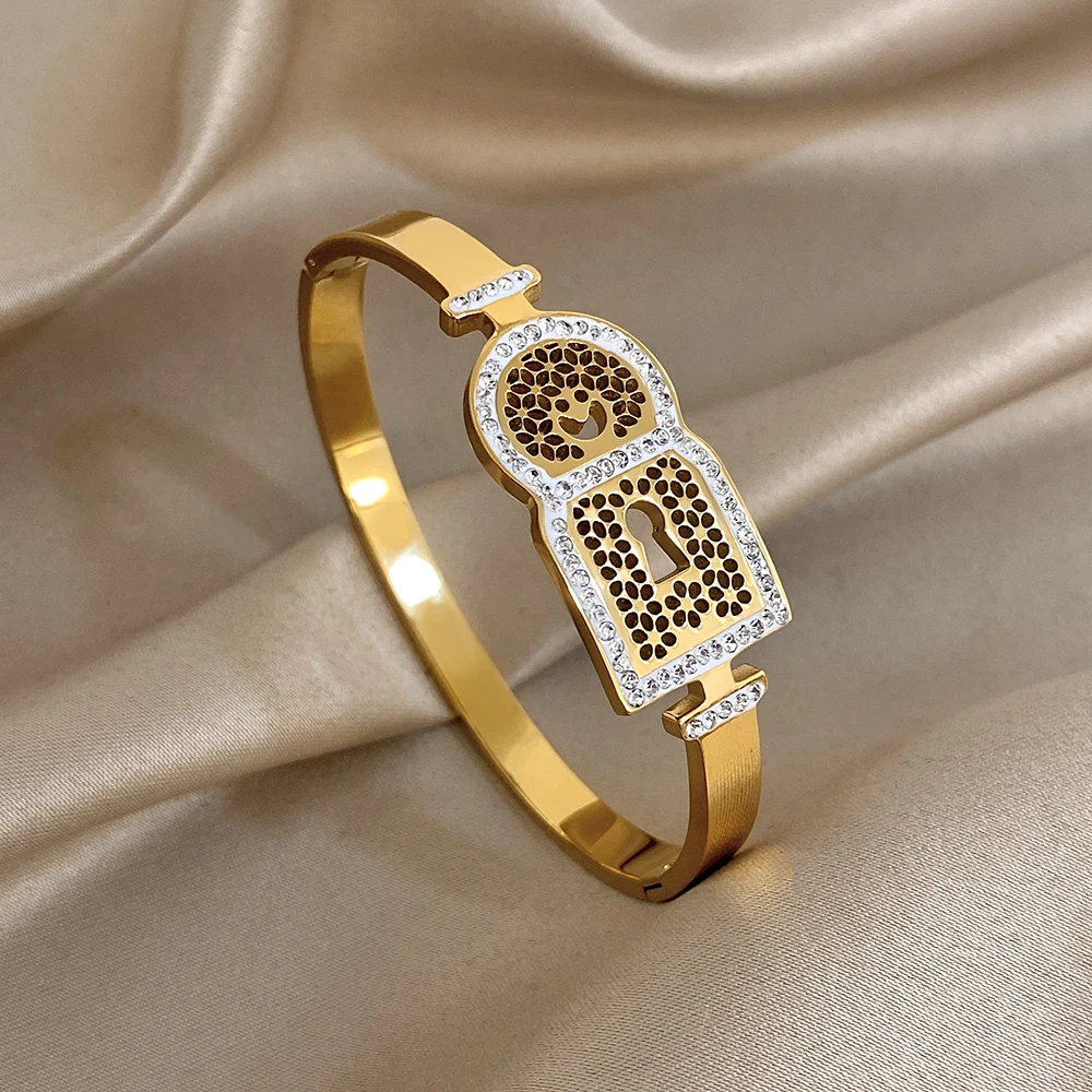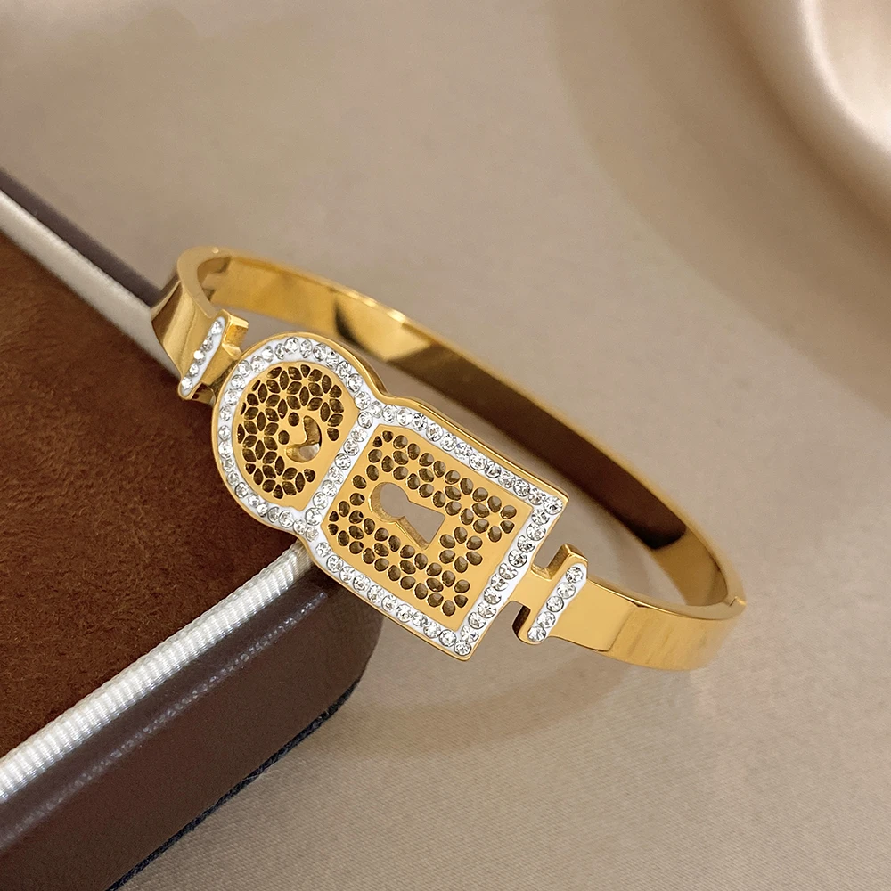 Trendy Geometric Hollow Lock Rhinestone Cuff Bangle Bracelets Glossy Gold Plated Stainless Steel Wrist Bracelet Party Jewelry