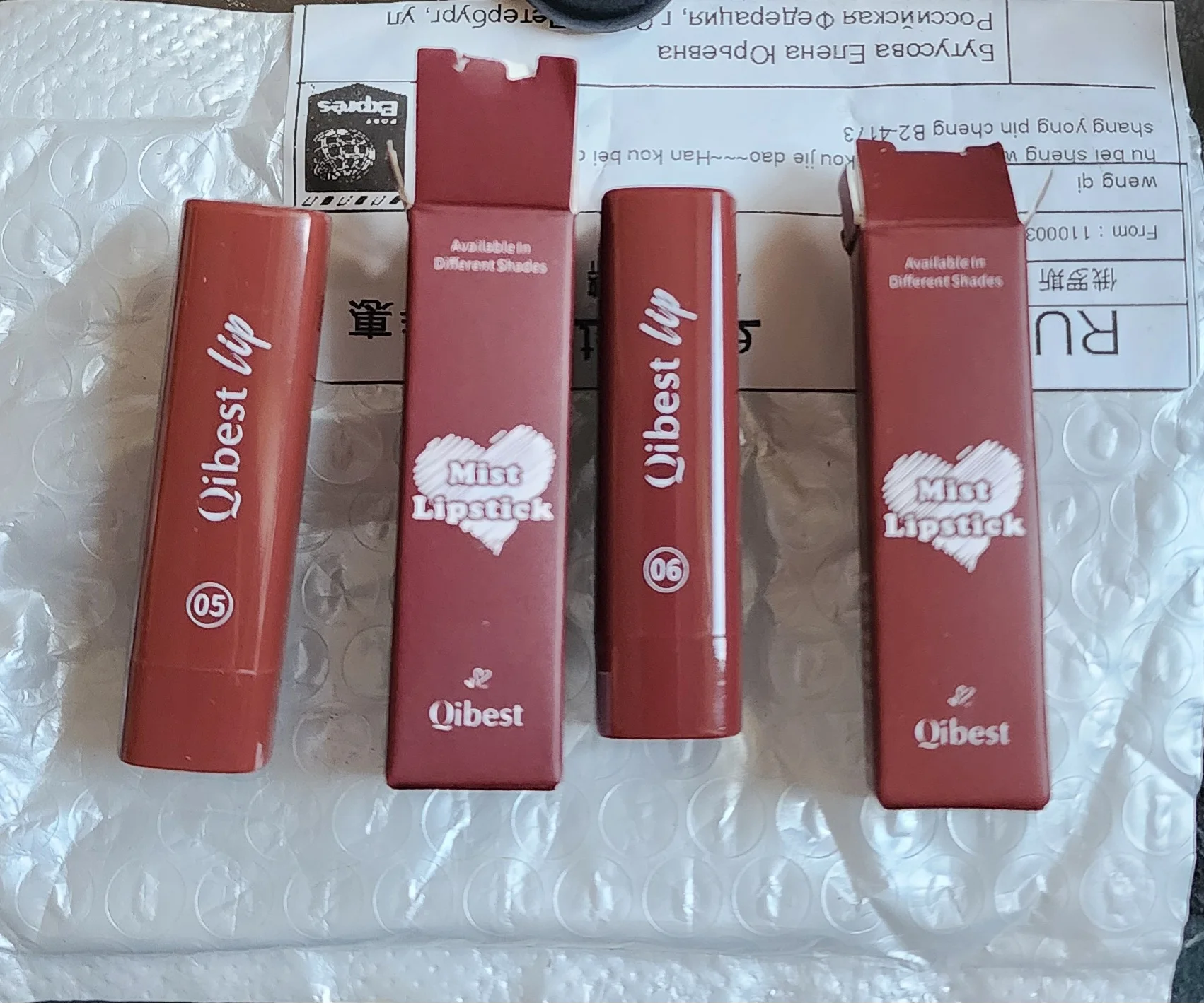 The order arrived quickly in Adygea, everything intact! I'm buying this lipstick for the second time, I like it. The color matches the seller's palette. This time I ordered numbers 02 and 05. The lipstick applies smoothly in one layer from the first time, doesn't smudge, isn't greasy, and doesn't dry out the lips. Small, so it runs out quickly. But for this price, you can order more than one piece. The boxes that contain the lipstick are also well-made, not a shoddy option! I'm satisfied with the product, the seller is great, thank you!