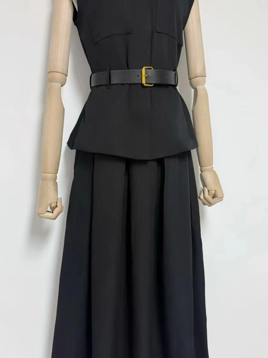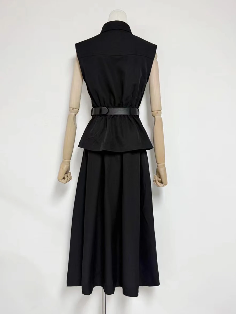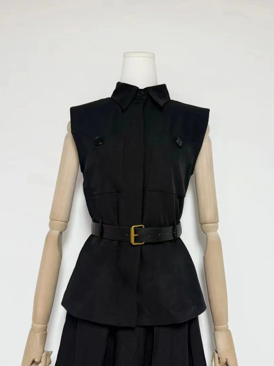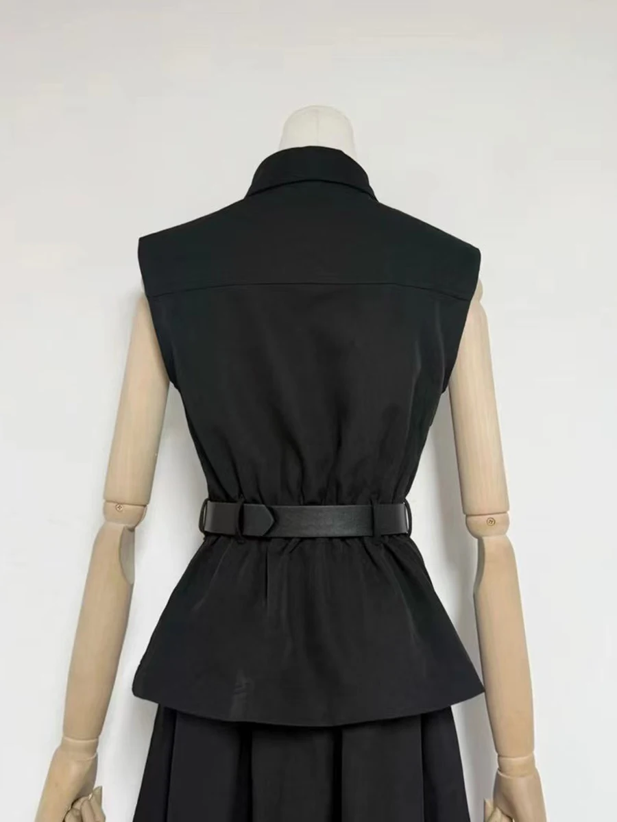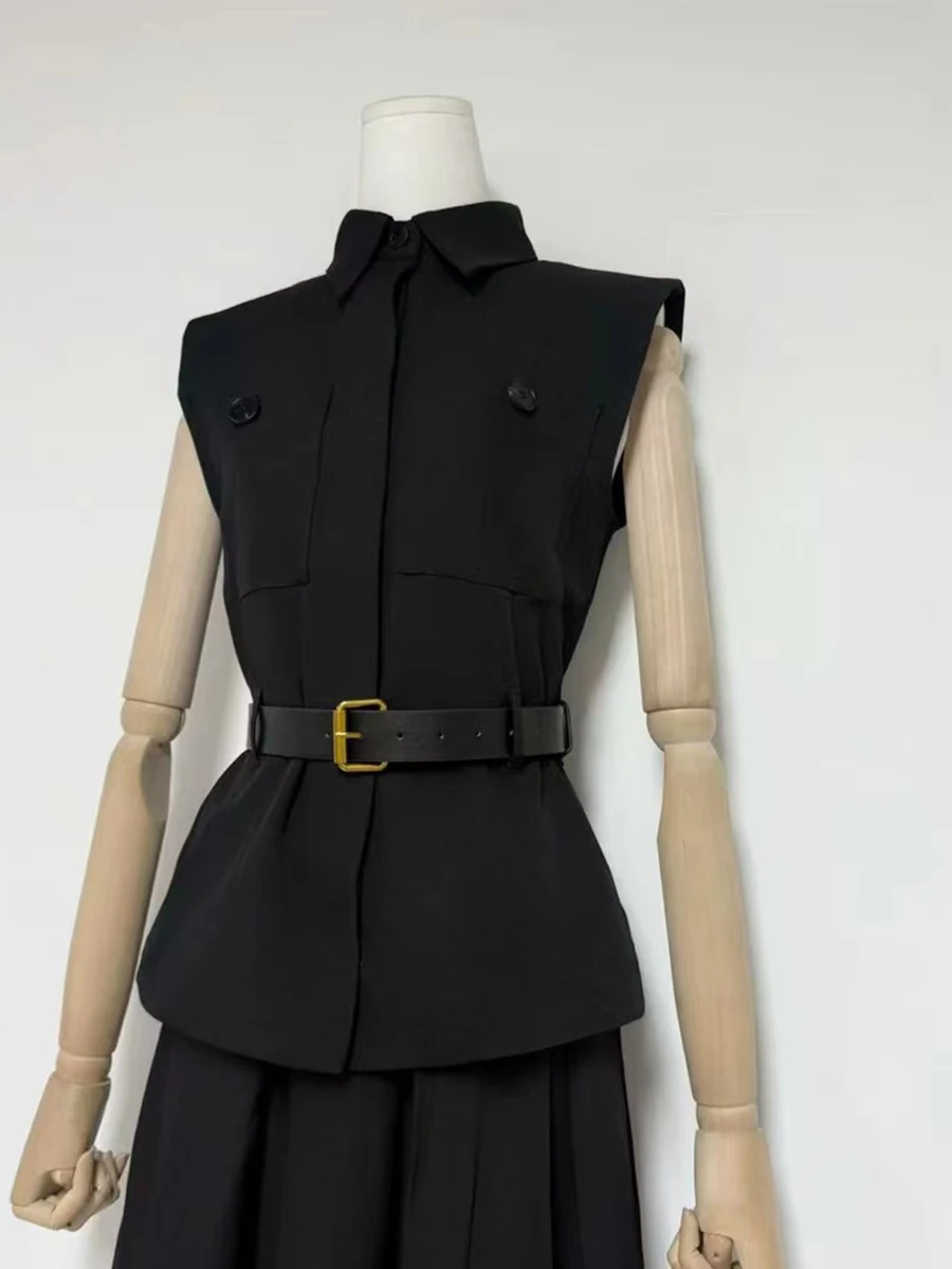 TWOTWINSTYL Casual Two Piece Sets for Women Lapel Sleeveless Spliced Belt Top High Waist Patchwork Folds Skirt Set Female New