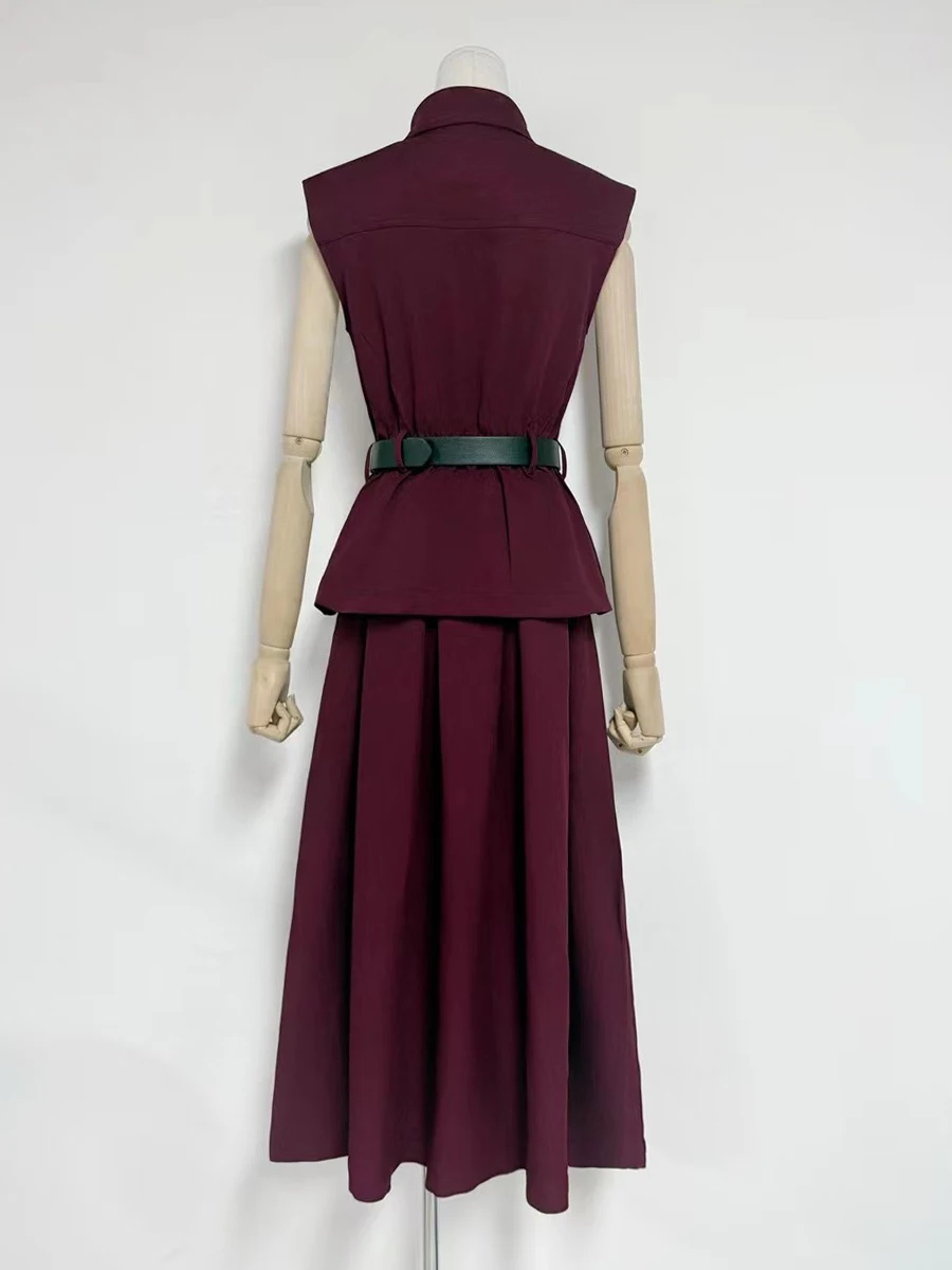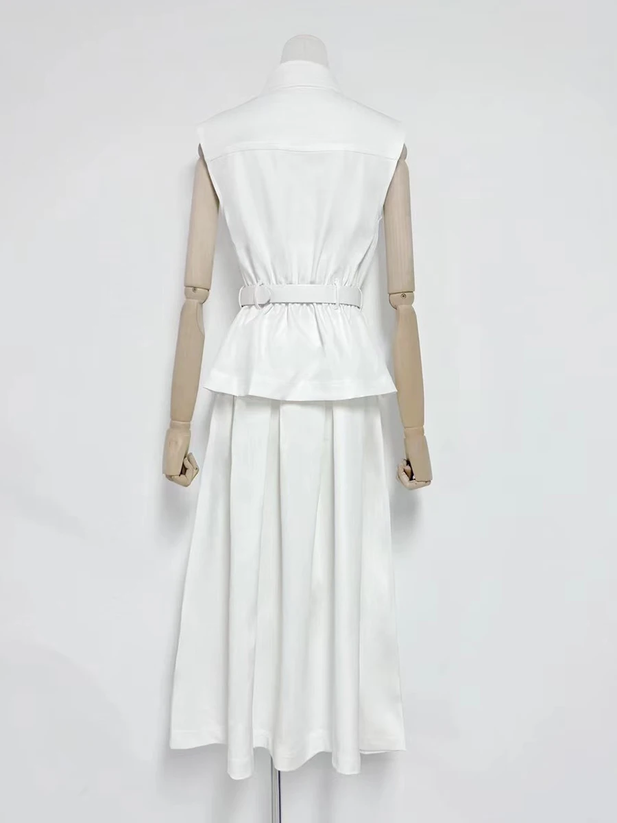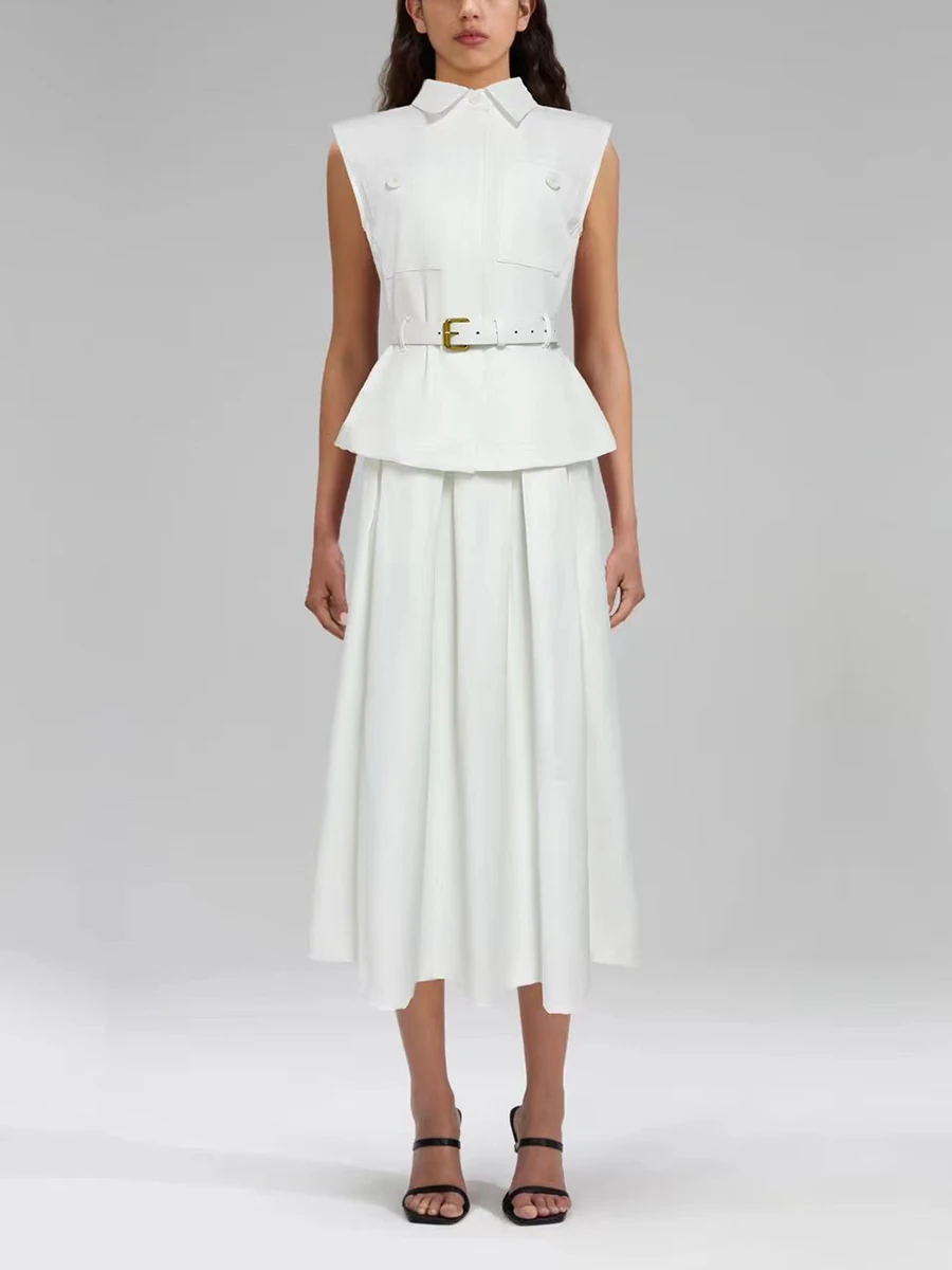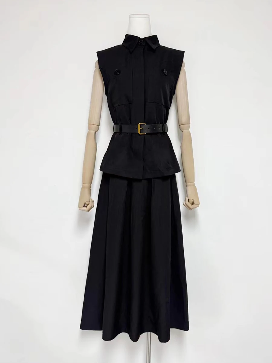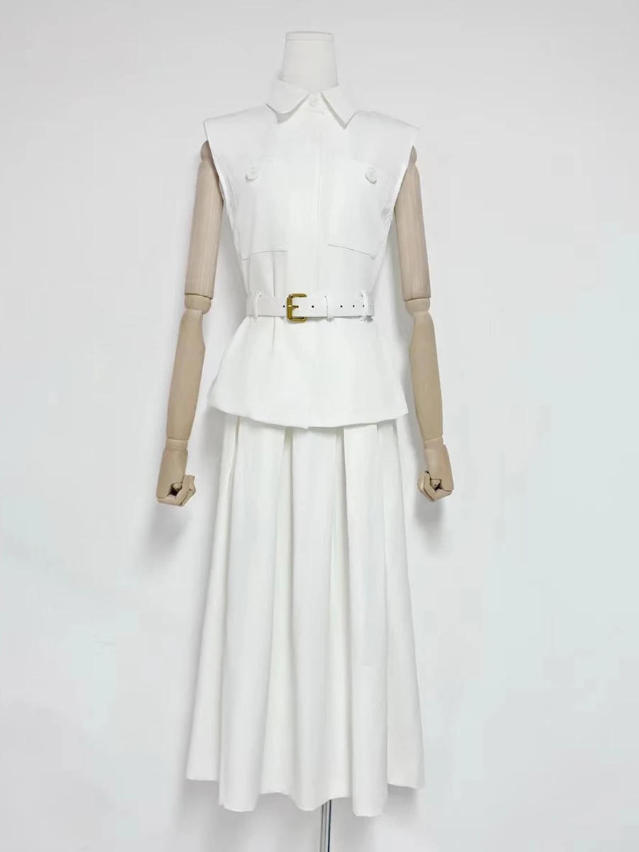TWOTWINSTYL Casual Two Piece Sets for Women Lapel Sleeveless Spliced Belt Top High Waist Patchwork Folds Skirt Set Female New