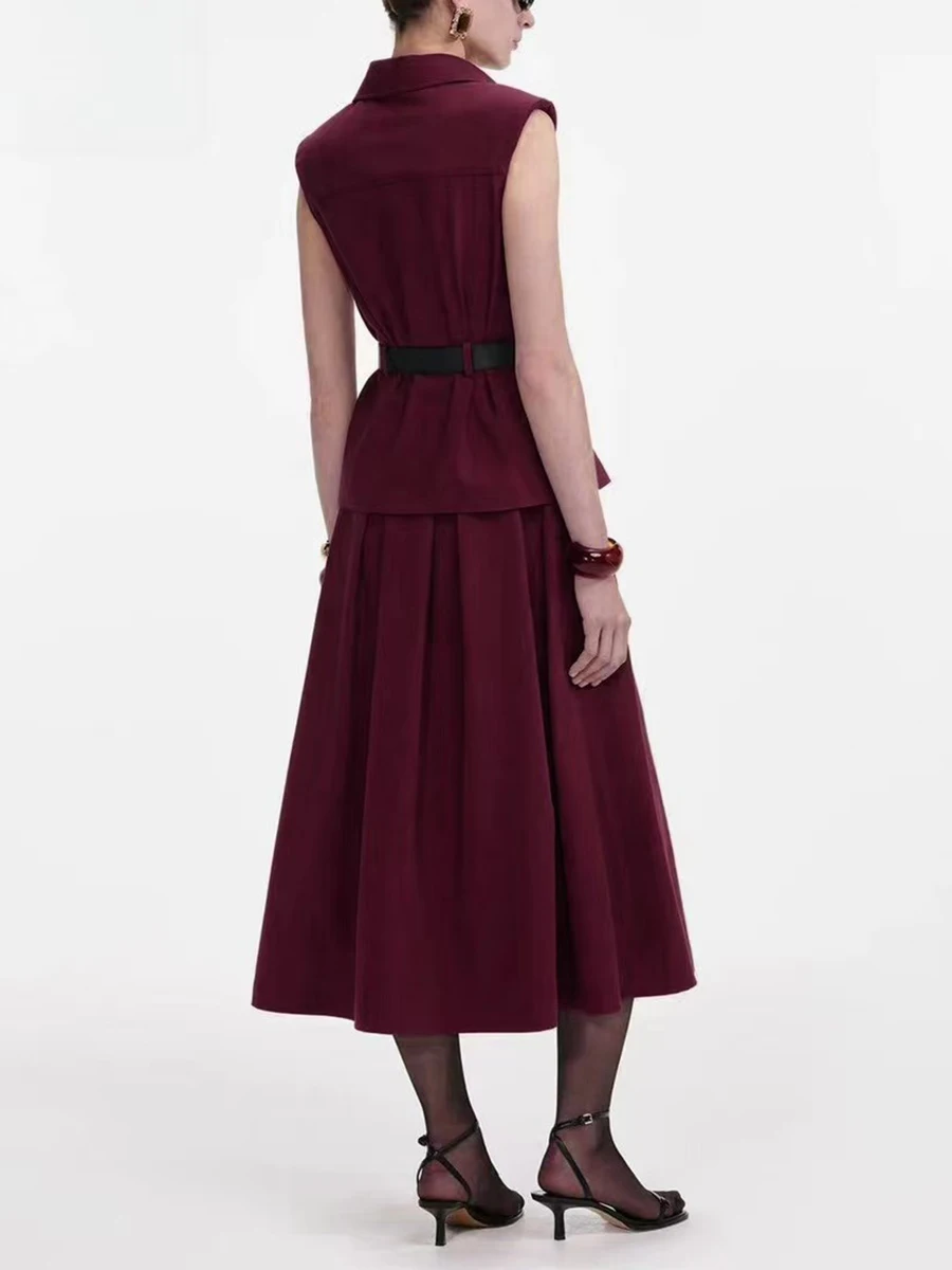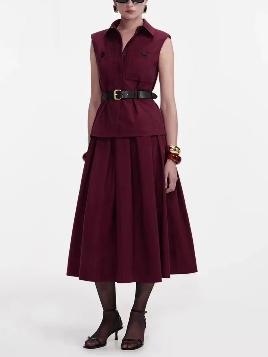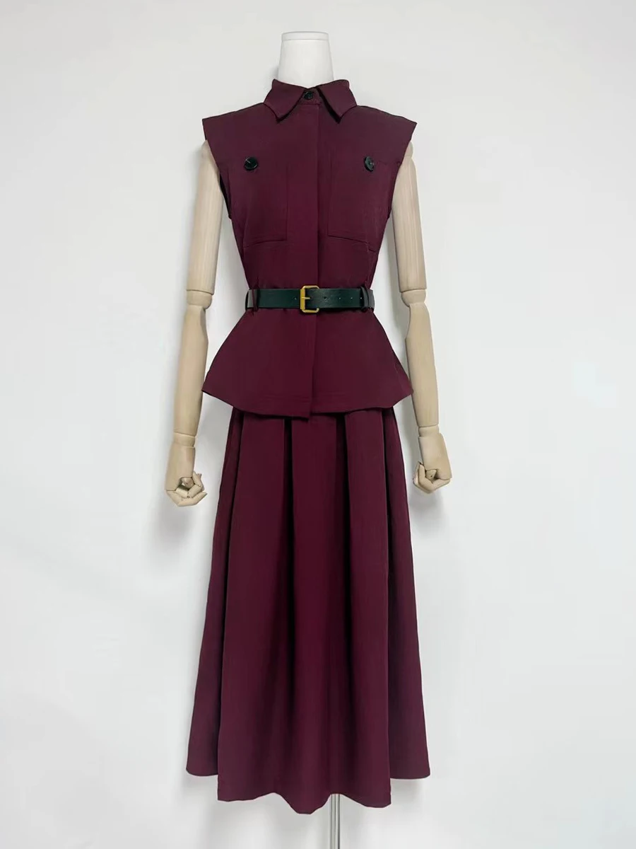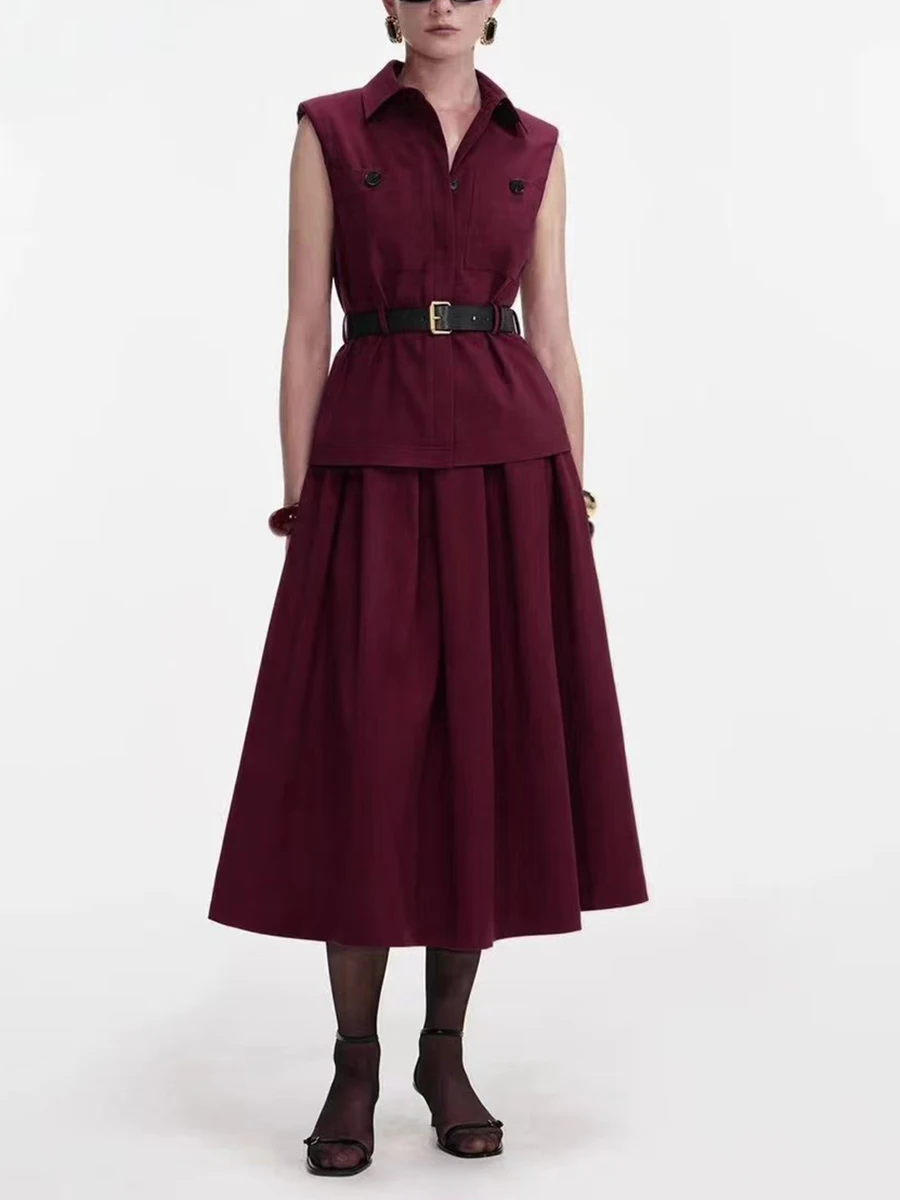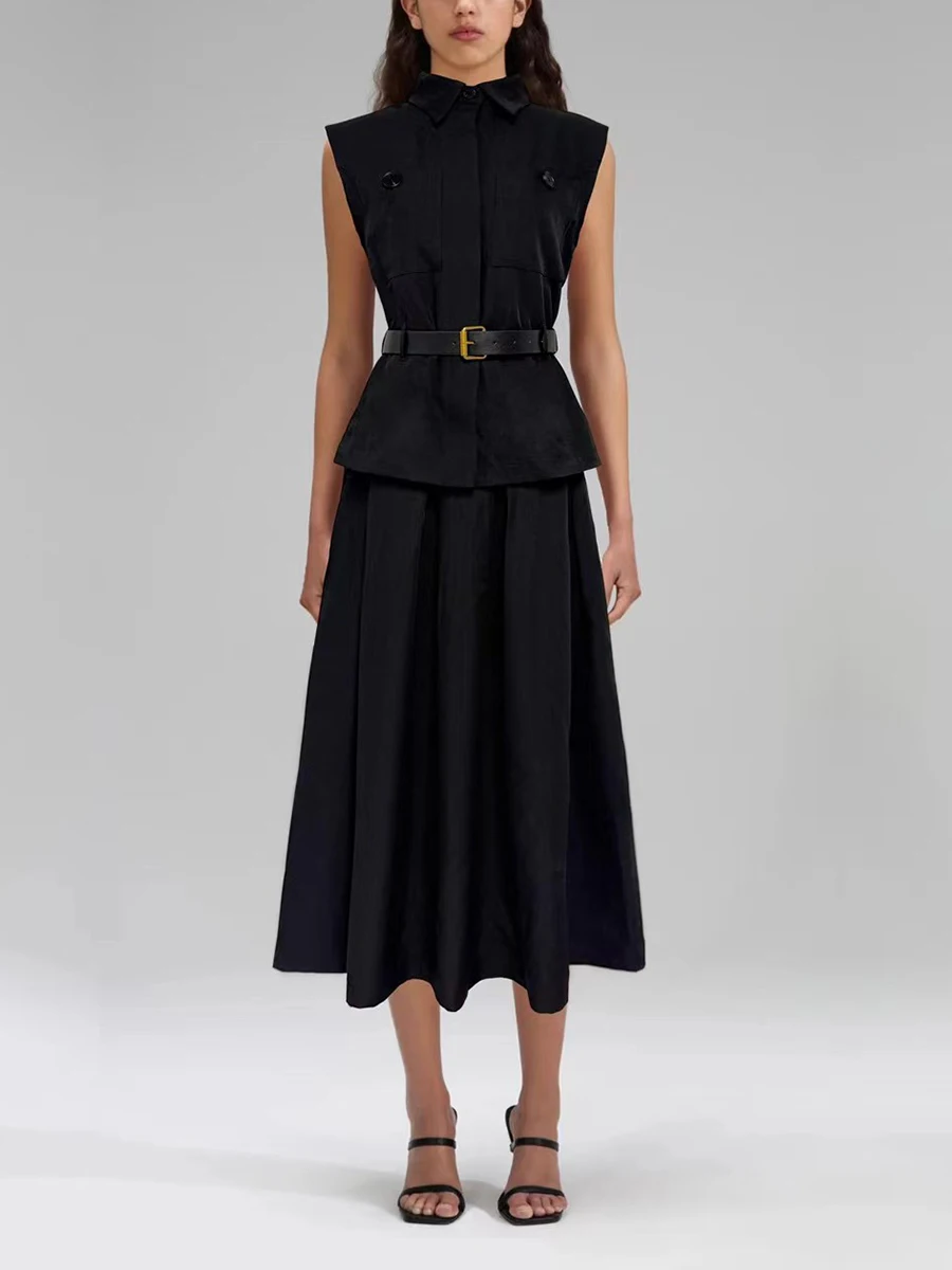 TWOTWINSTYL Casual Two Piece Sets for Women Lapel Sleeveless Spliced Belt Top High Waist Patchwork Folds Skirt Set Female New
