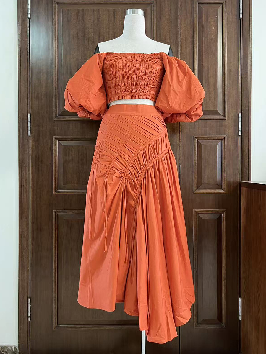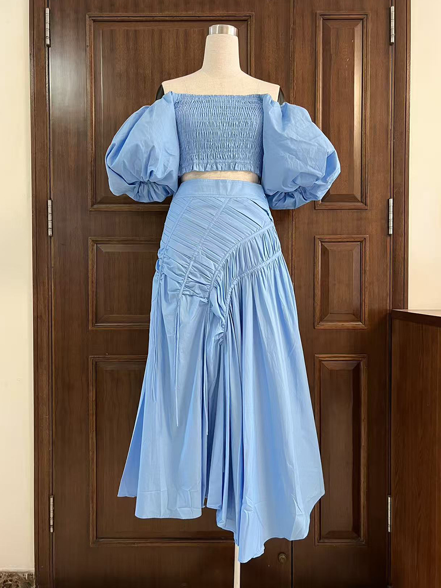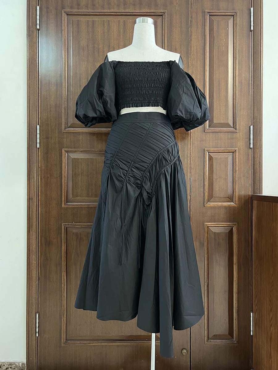 TWOTWINSTYL Solid Spliced Folds Two Piece Sets for Women Slash Neck Half Sleeves Short Top High Waist Irregular Skirt Set Female