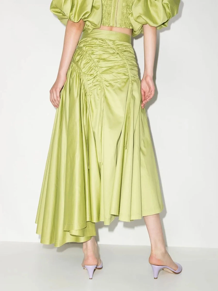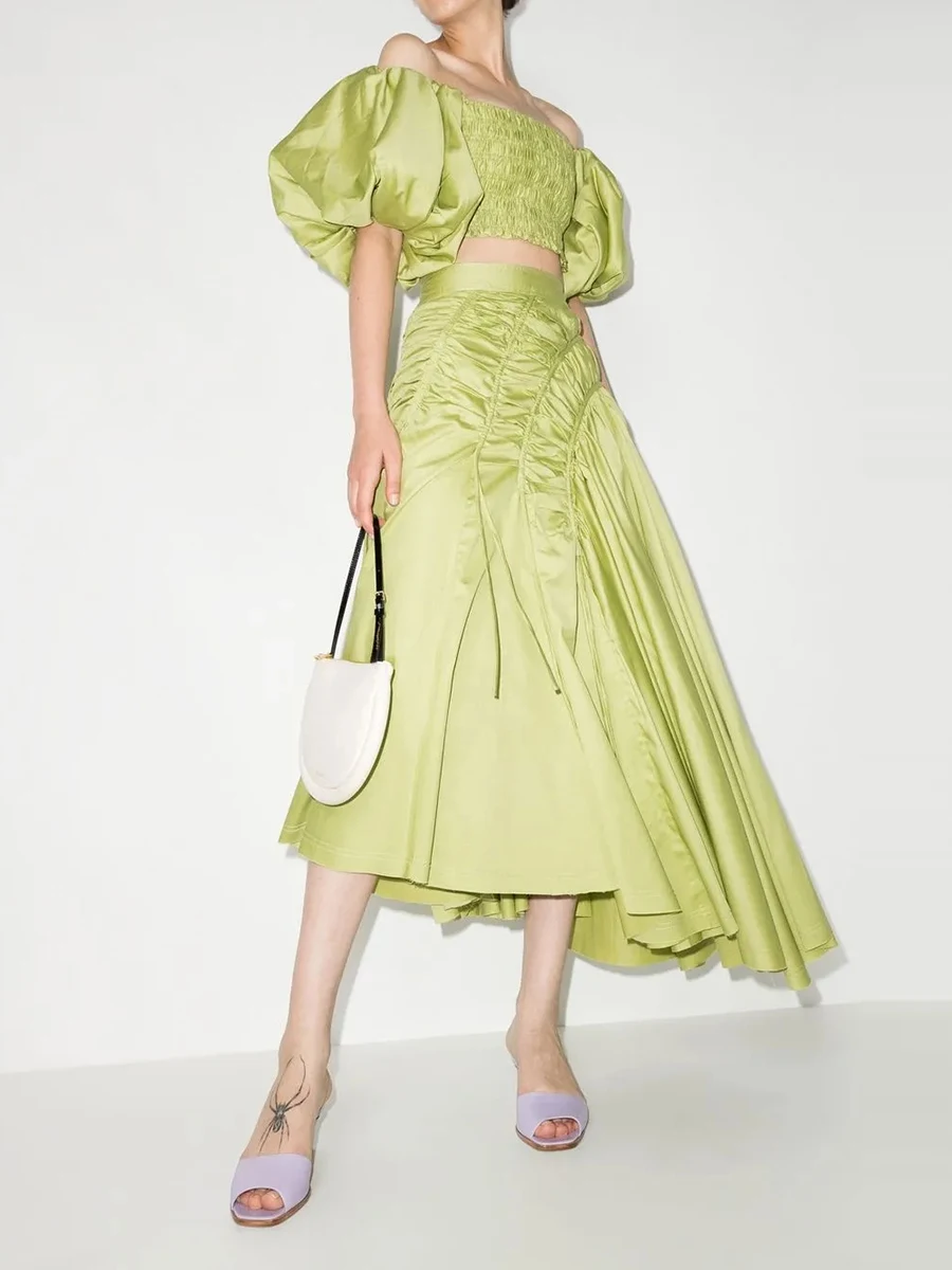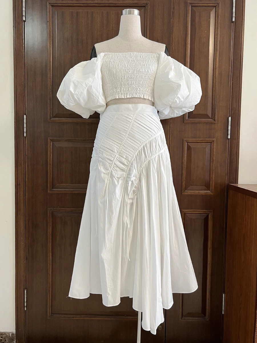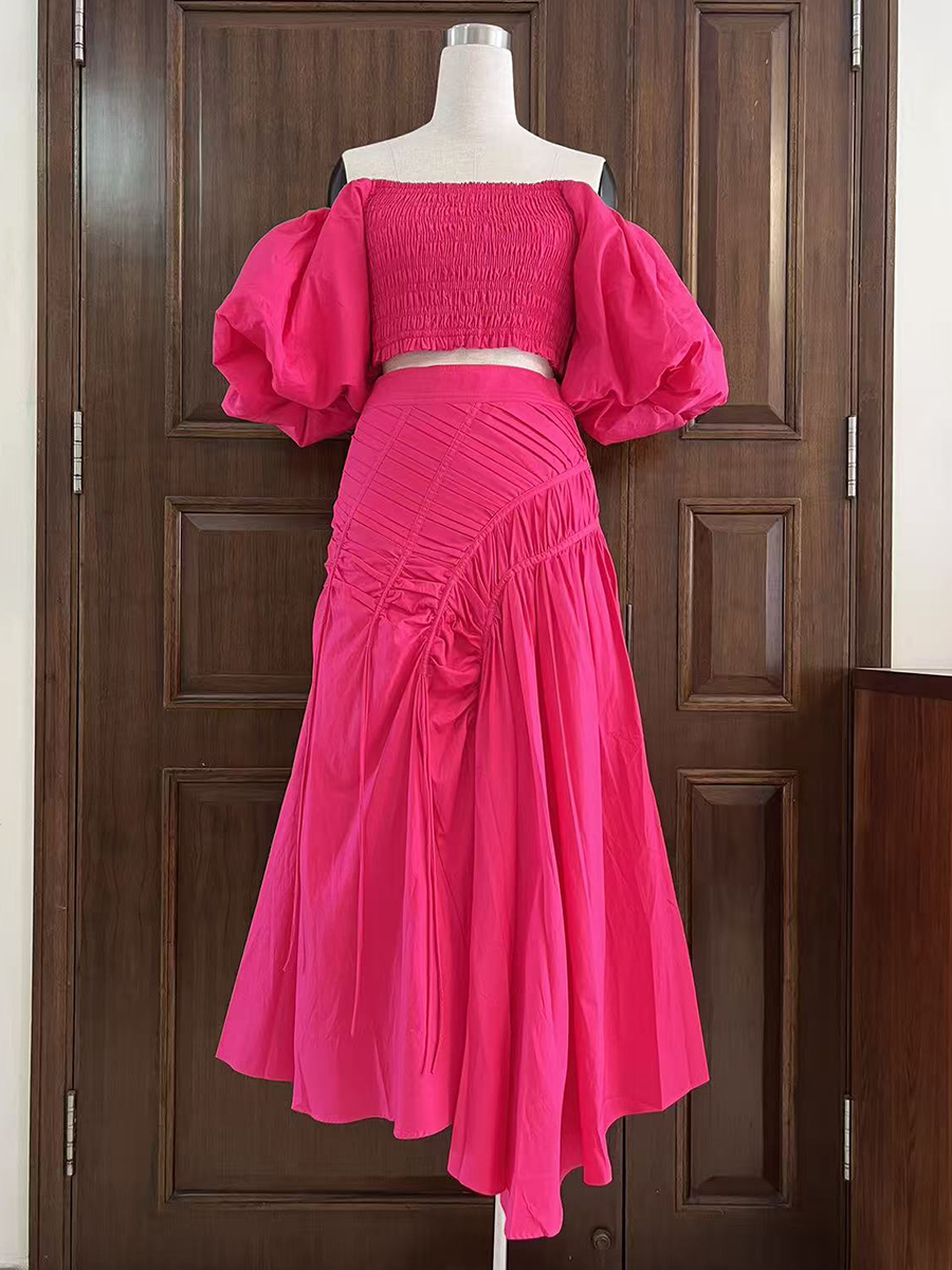 TWOTWINSTYL Solid Spliced Folds Two Piece Sets for Women Slash Neck Half Sleeves Short Top High Waist Irregular Skirt Set Female