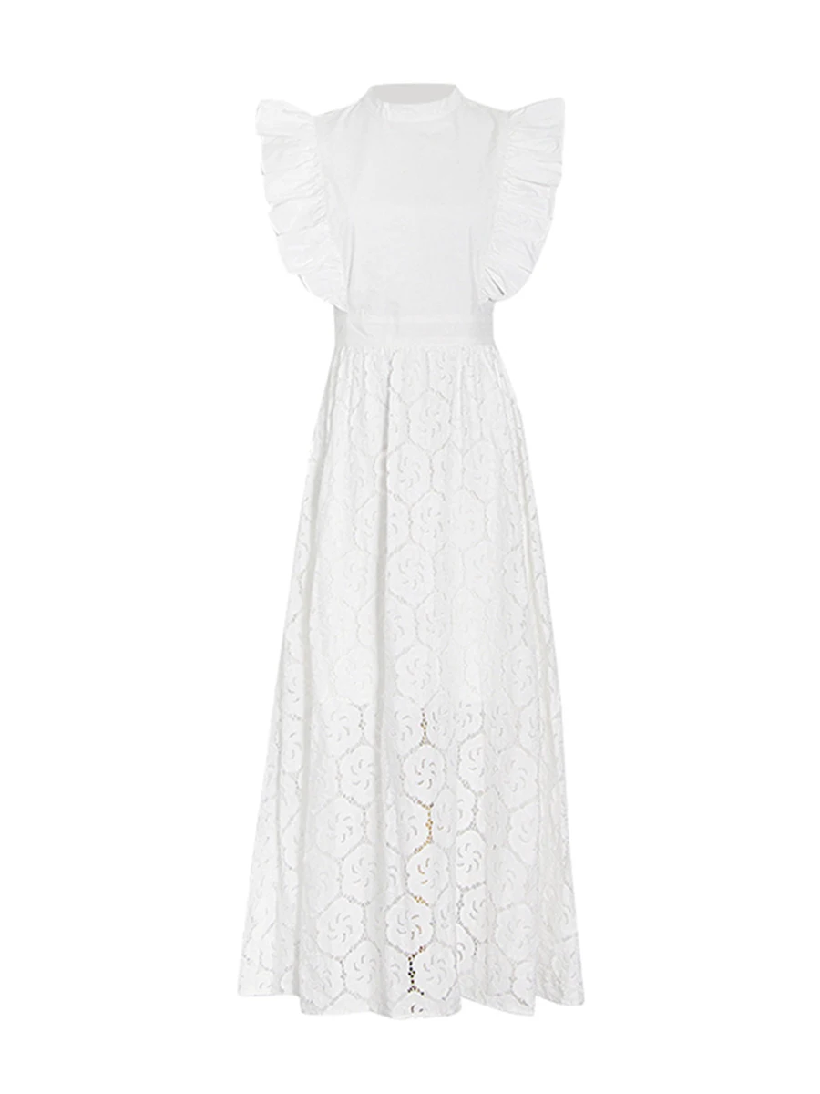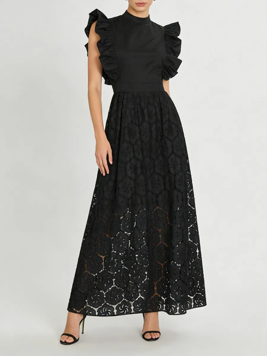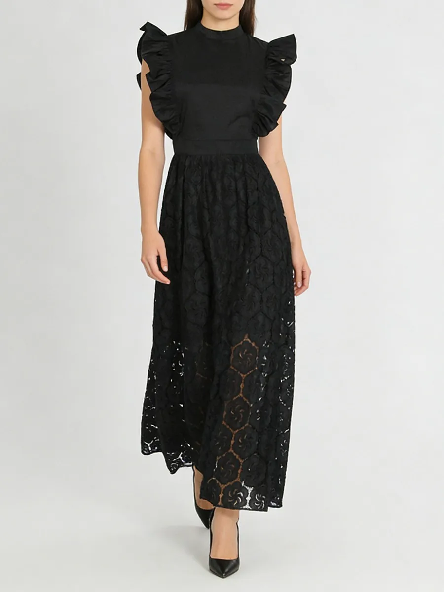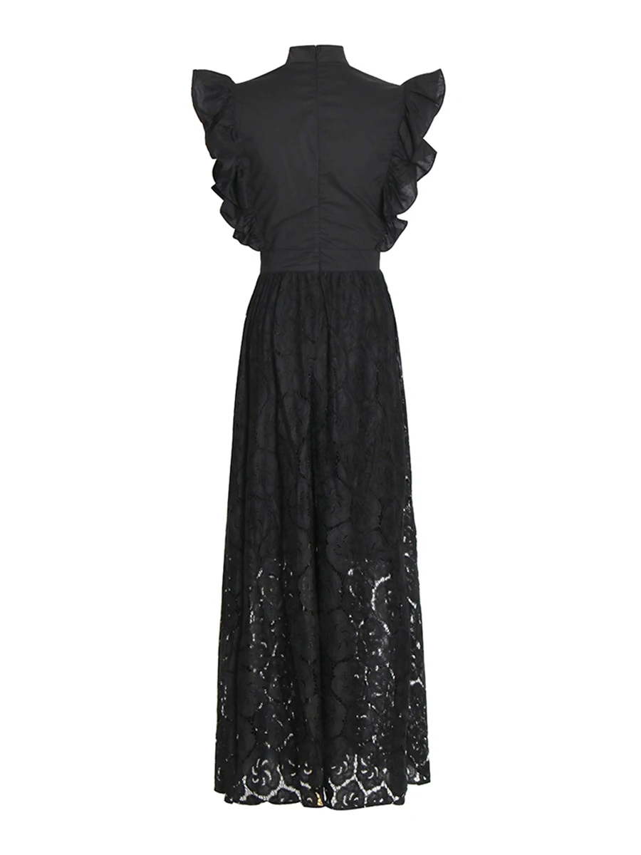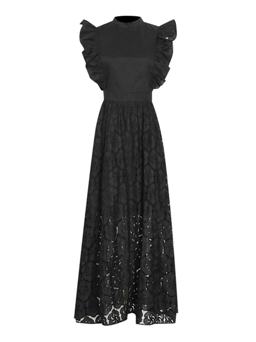 TWOTWINSTYLE Black Hollow Out Spliced Ruffles Lace Long Dress for Women O Neck Sleeveless High Waist Temperamen Tdresses Female