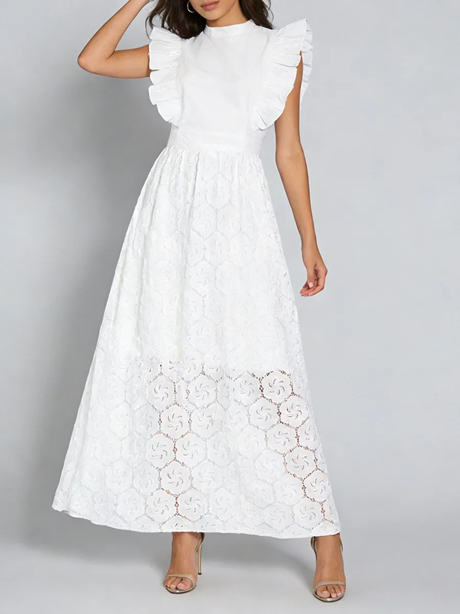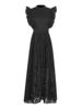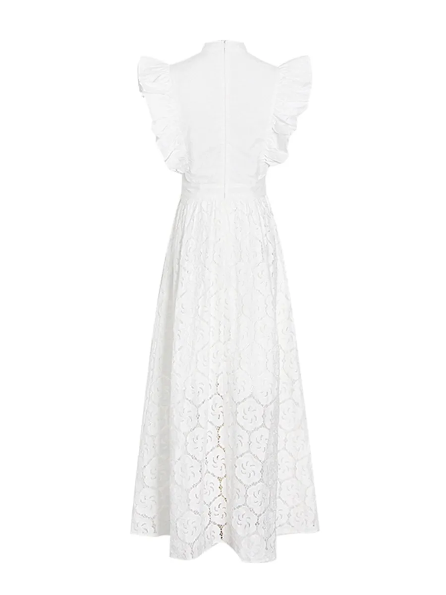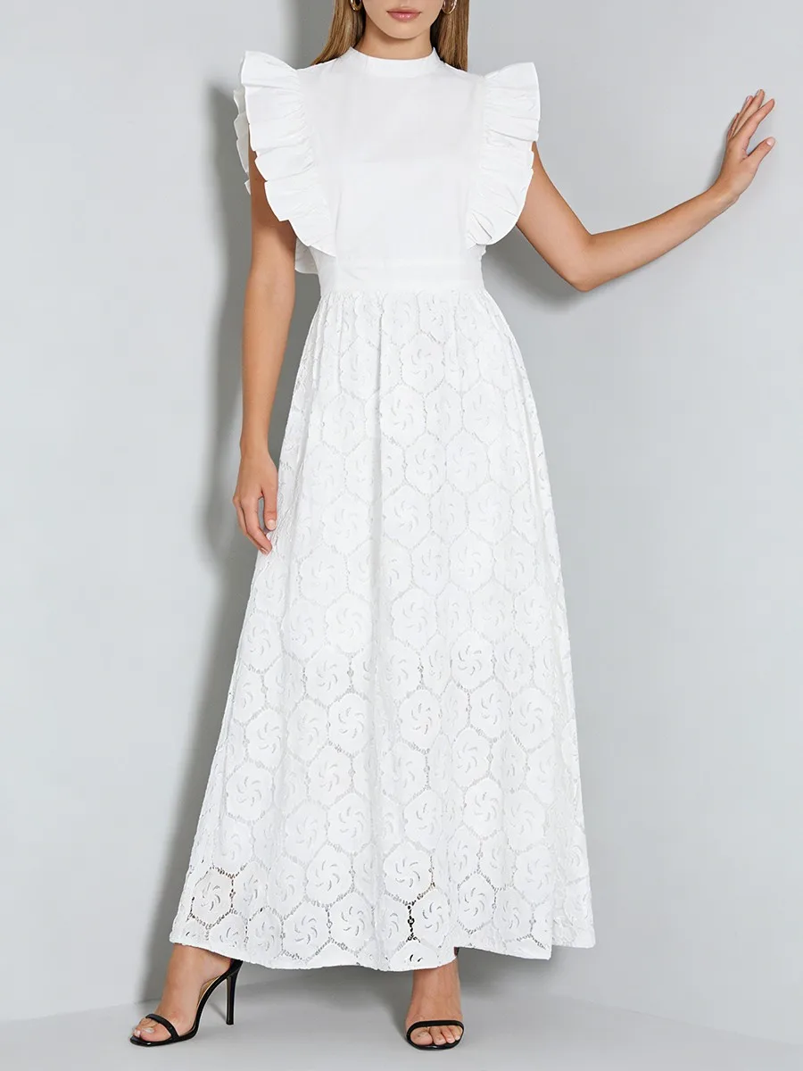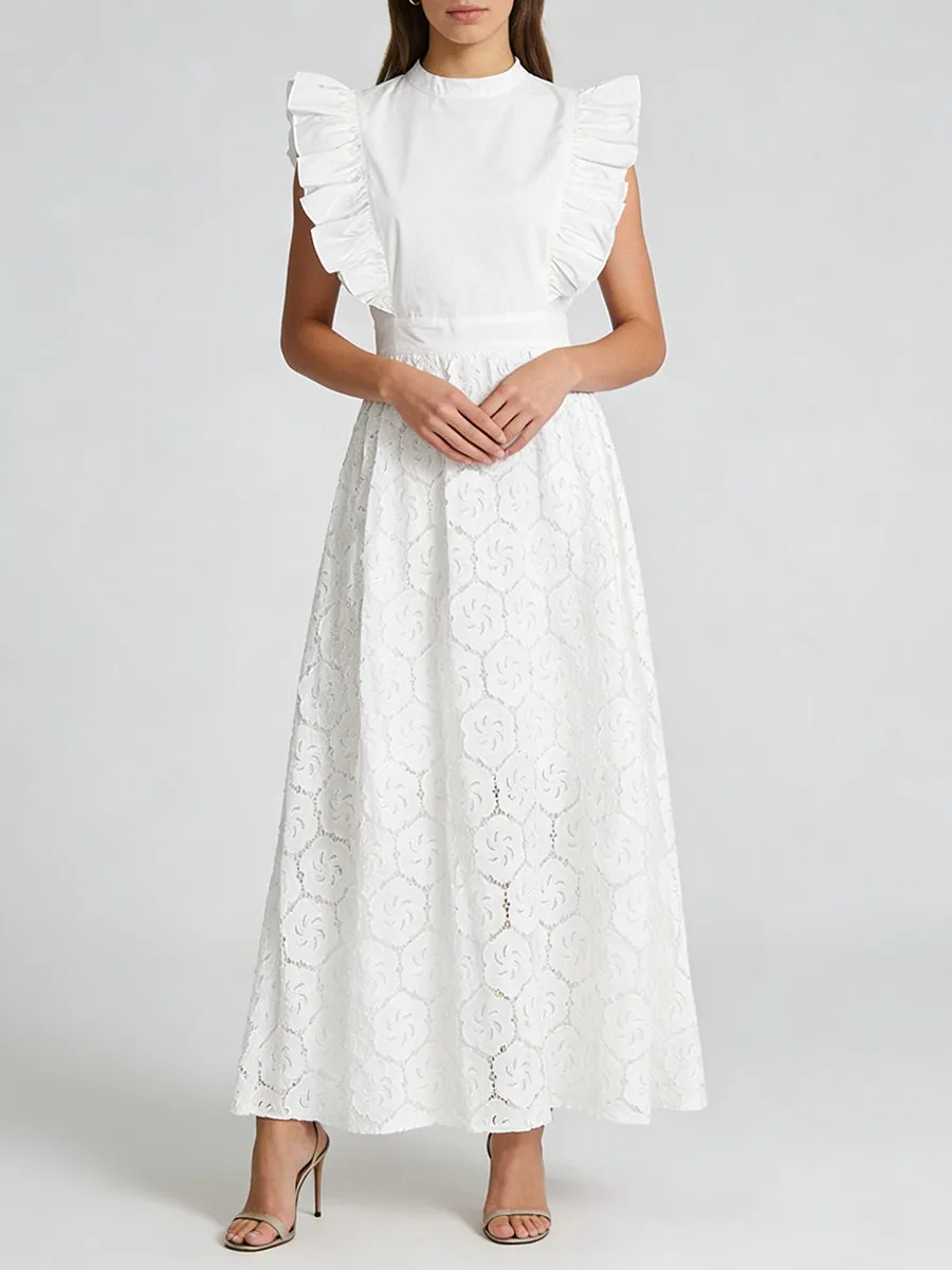 TWOTWINSTYLE Black Hollow Out Spliced Ruffles Lace Long Dress for Women O Neck Sleeveless High Waist Temperamen Tdresses Female