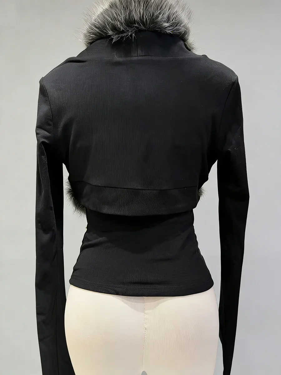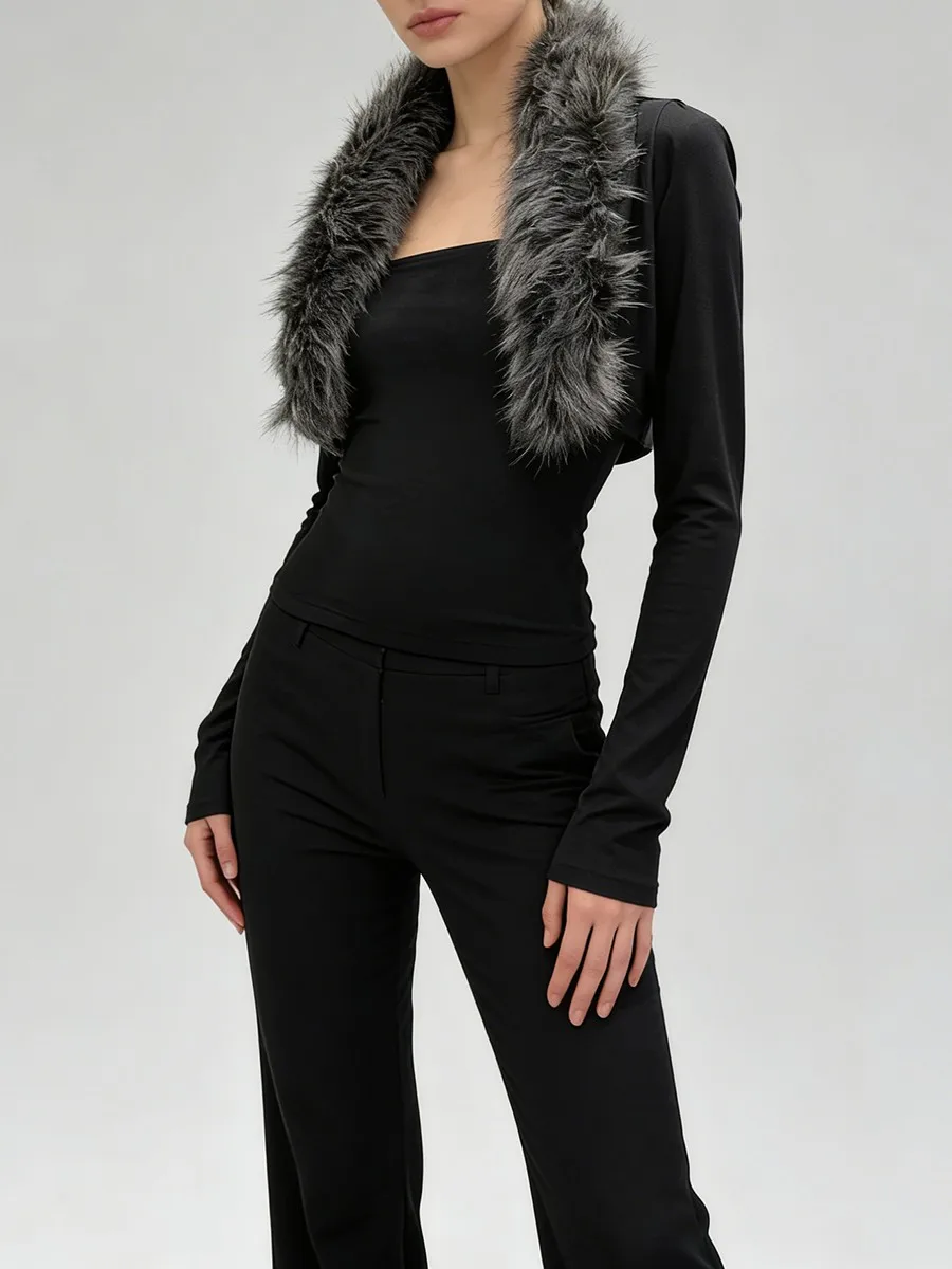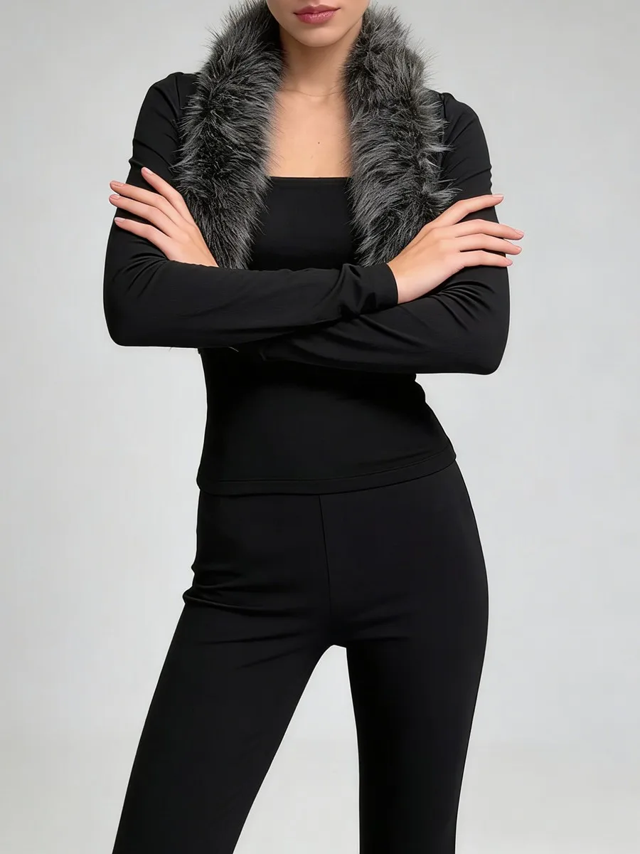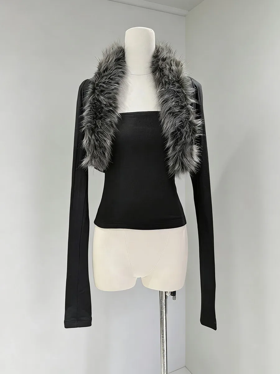 TWOTWINSTYLE Black Slimming Two Piece Sets for Women Fur Collar Long Sleeves Short Coat Square Neck Sleeveless Vest Set Female