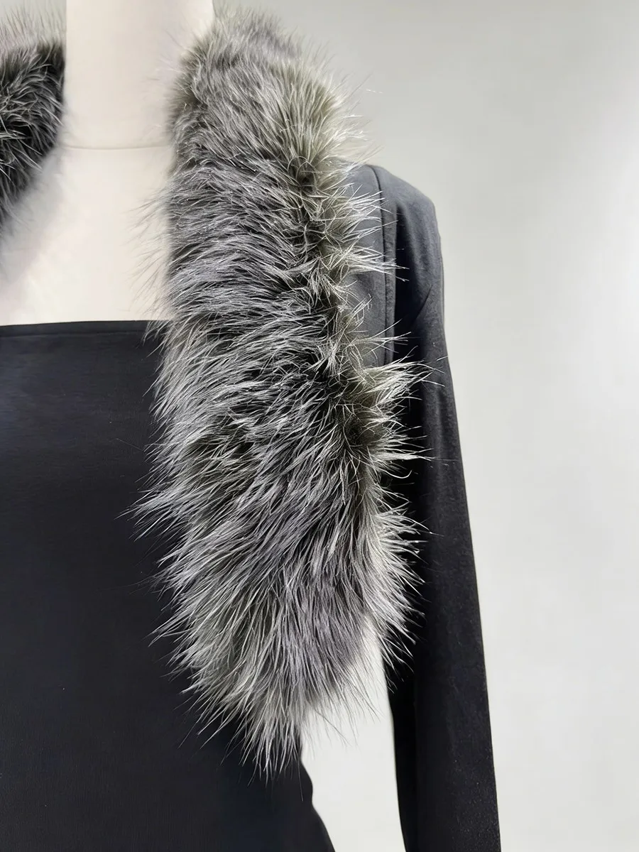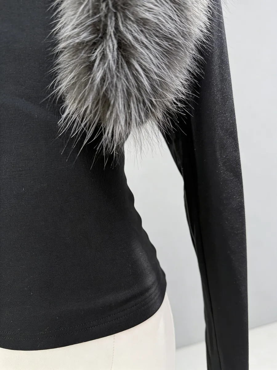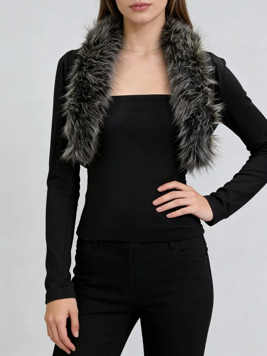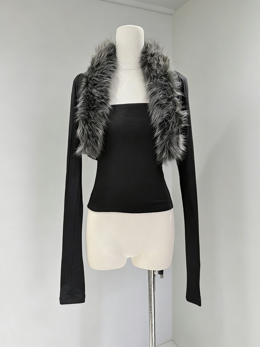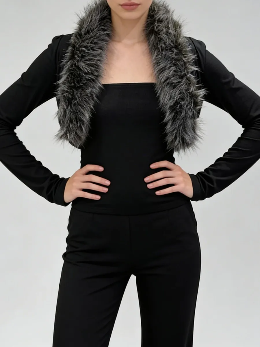 TWOTWINSTYLE Black Slimming Two Piece Sets for Women Fur Collar Long Sleeves Short Coat Square Neck Sleeveless Vest Set Female