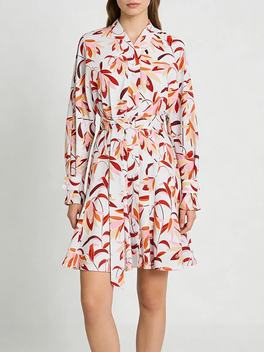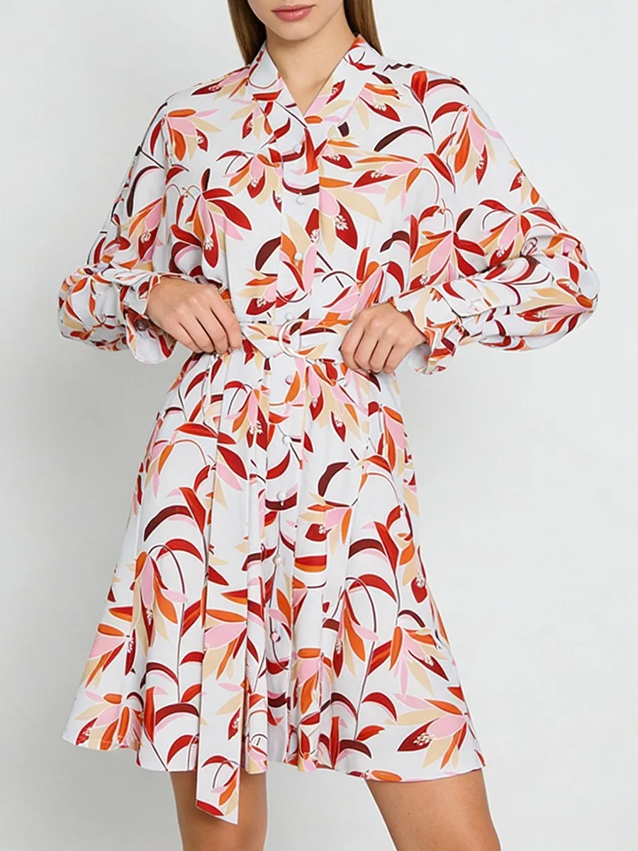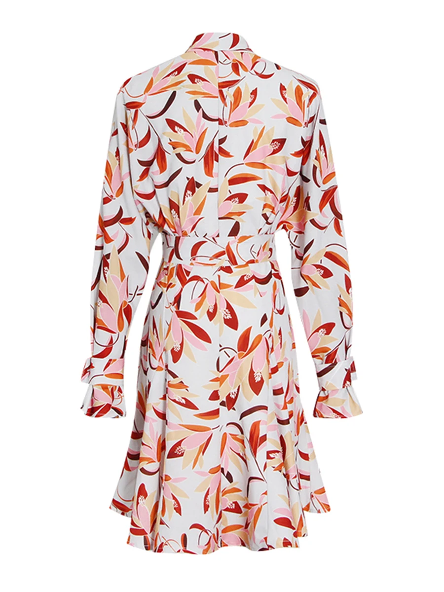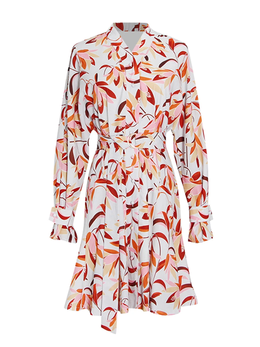 TWOTWINSTYLE Casual Printing Spliced Belt Loose Dresses for Women V Neck Long Sleeves Patchwork Buttons Vintage Dress Female New