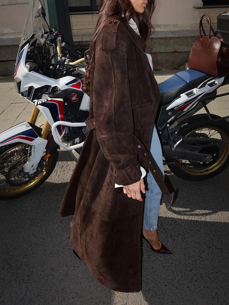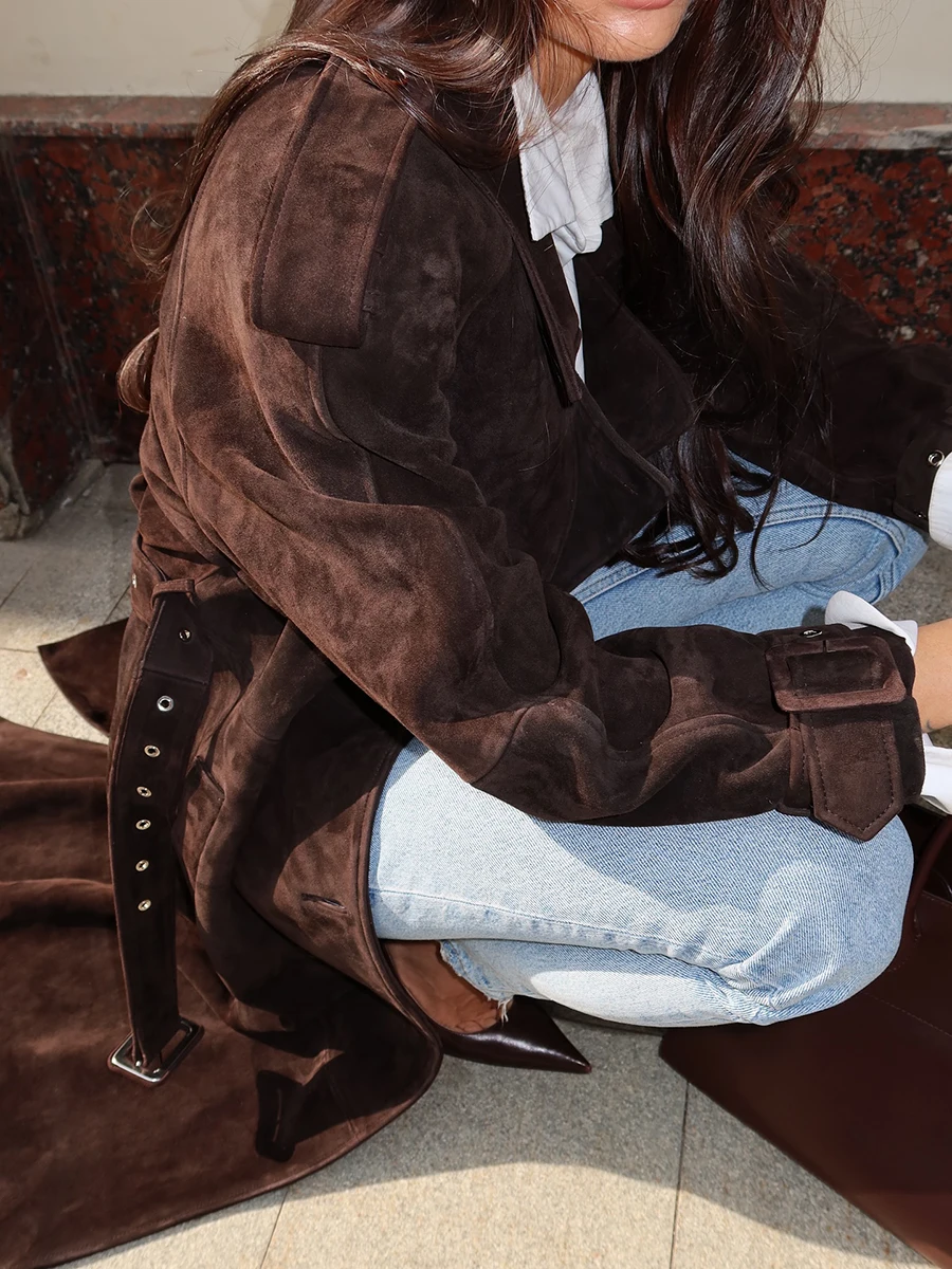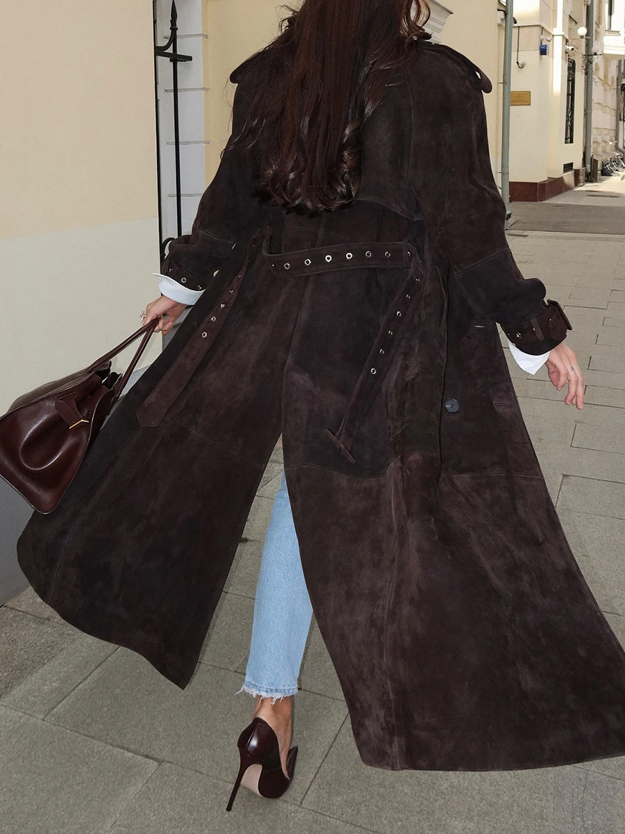 TWOTWINSTYLE Coffee Color Vintage Windbreaker for Women Lapel Long Sleeve Spliced Lace Up Temperament Coat Female Clothing New