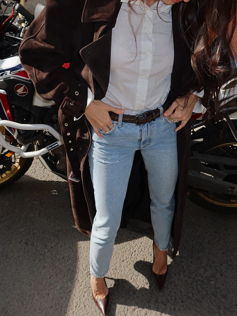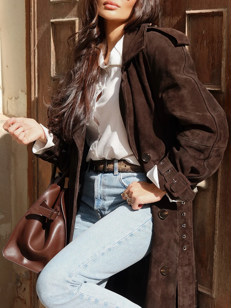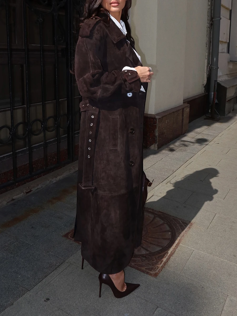 TWOTWINSTYLE Coffee Color Vintage Windbreaker for Women Lapel Long Sleeve Spliced Lace Up Temperament Coat Female Clothing New