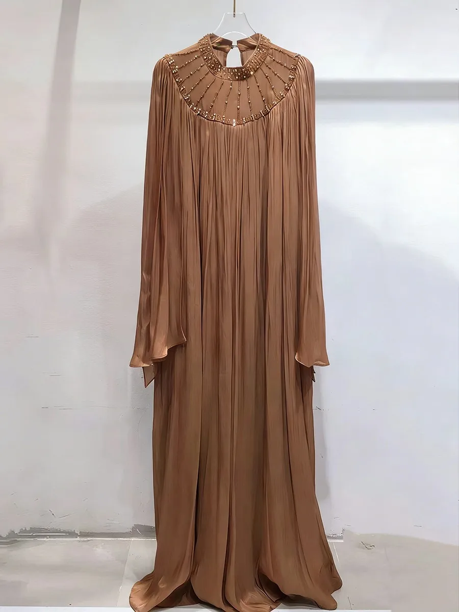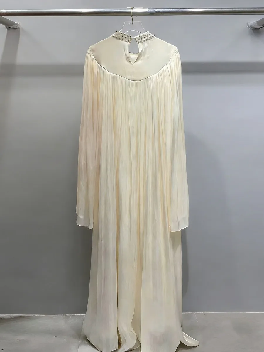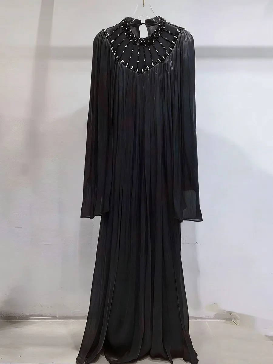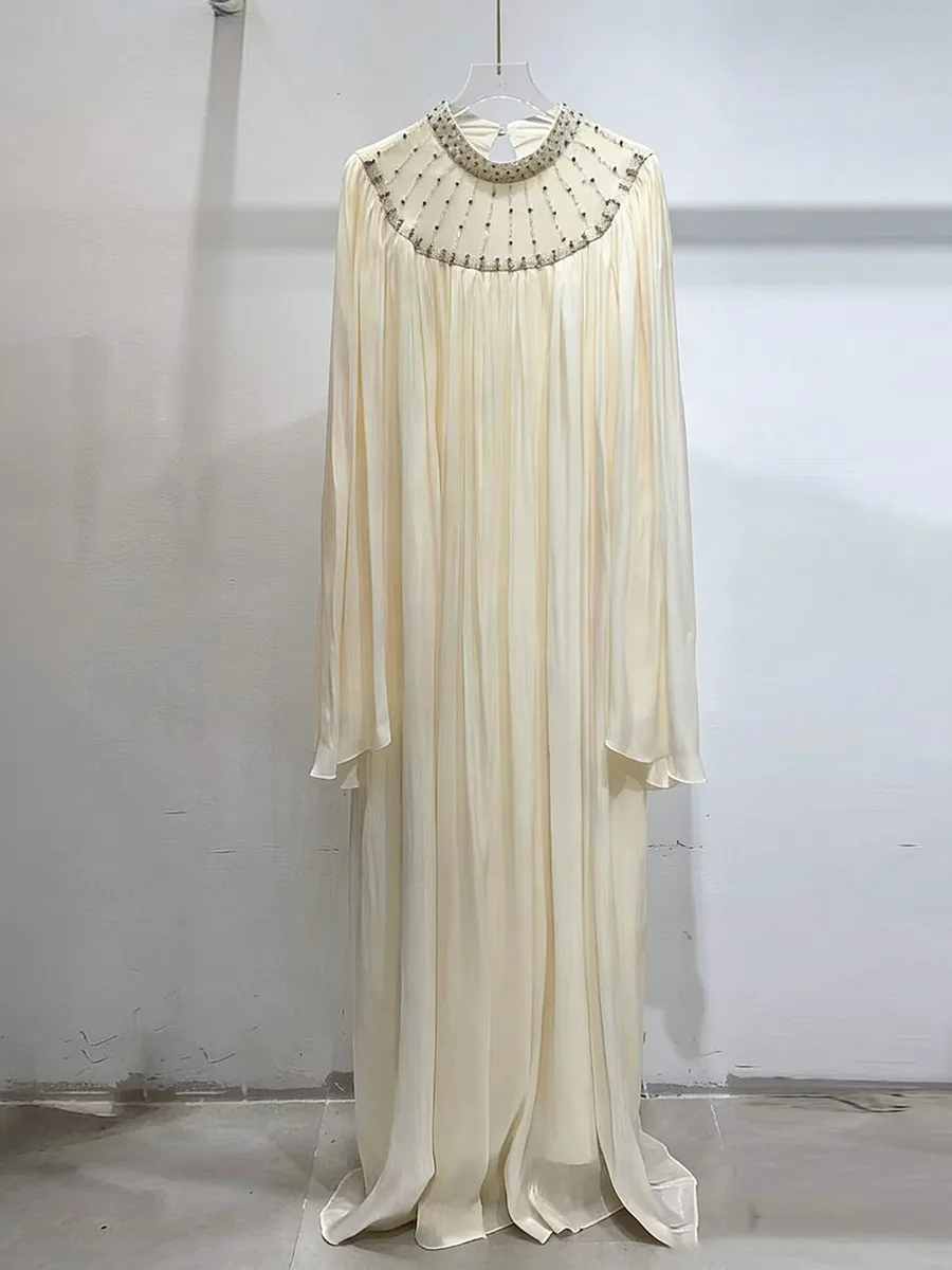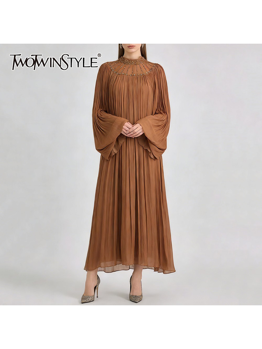 TWOTWINSTYLE Elegant Loose Spliced Bead Vintage Long Dress for Women Round Neck Long Sleeves Patchwork Folds Dresses Female New
