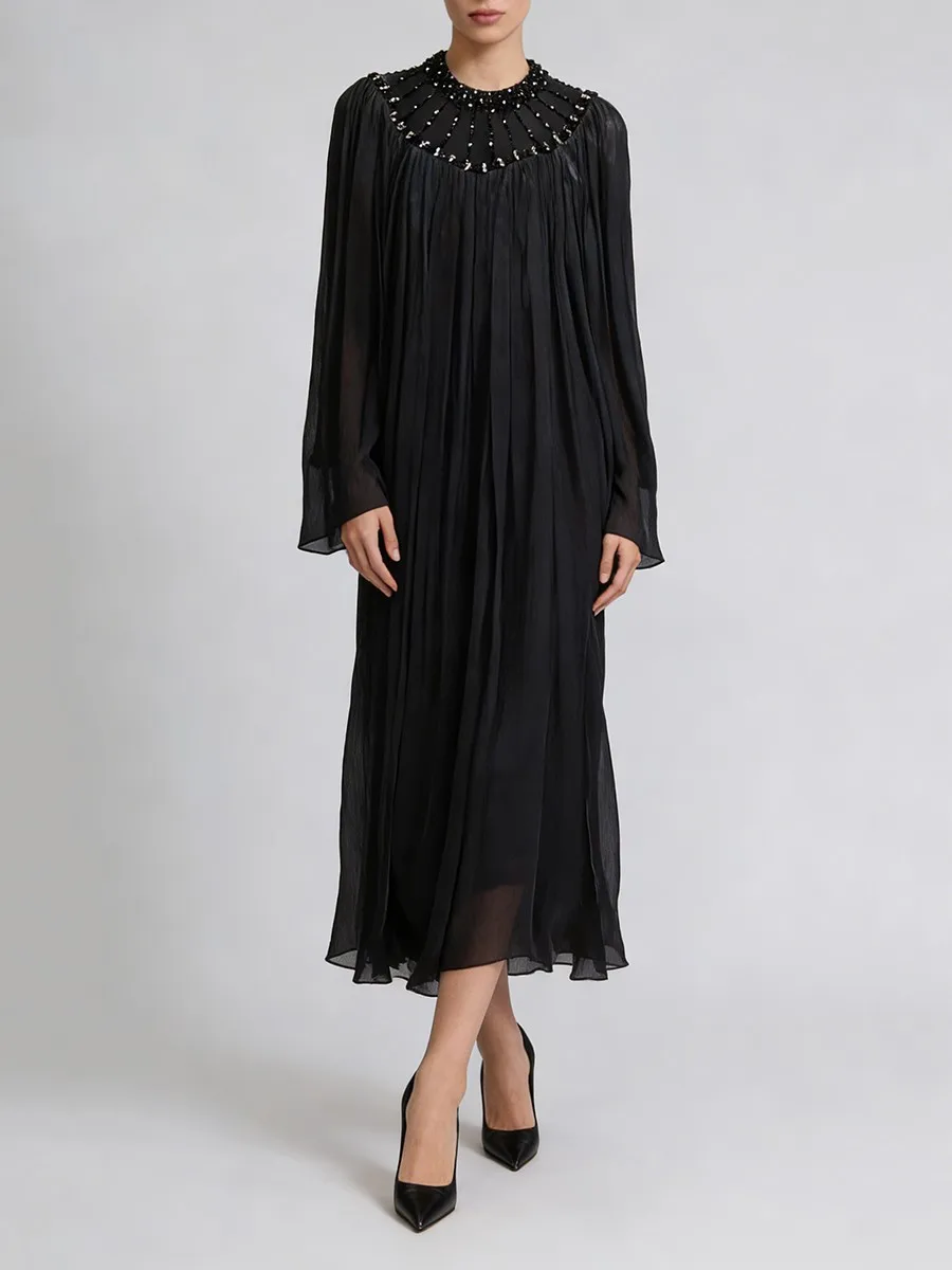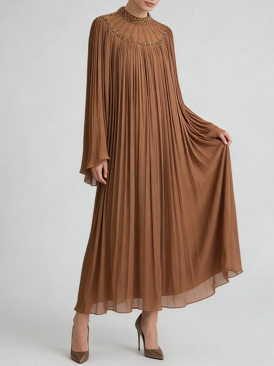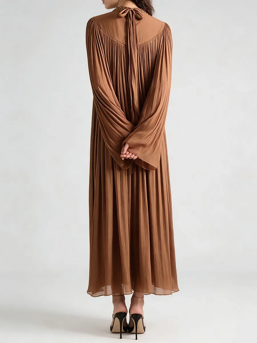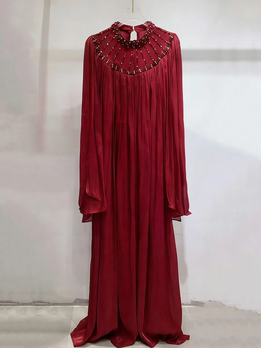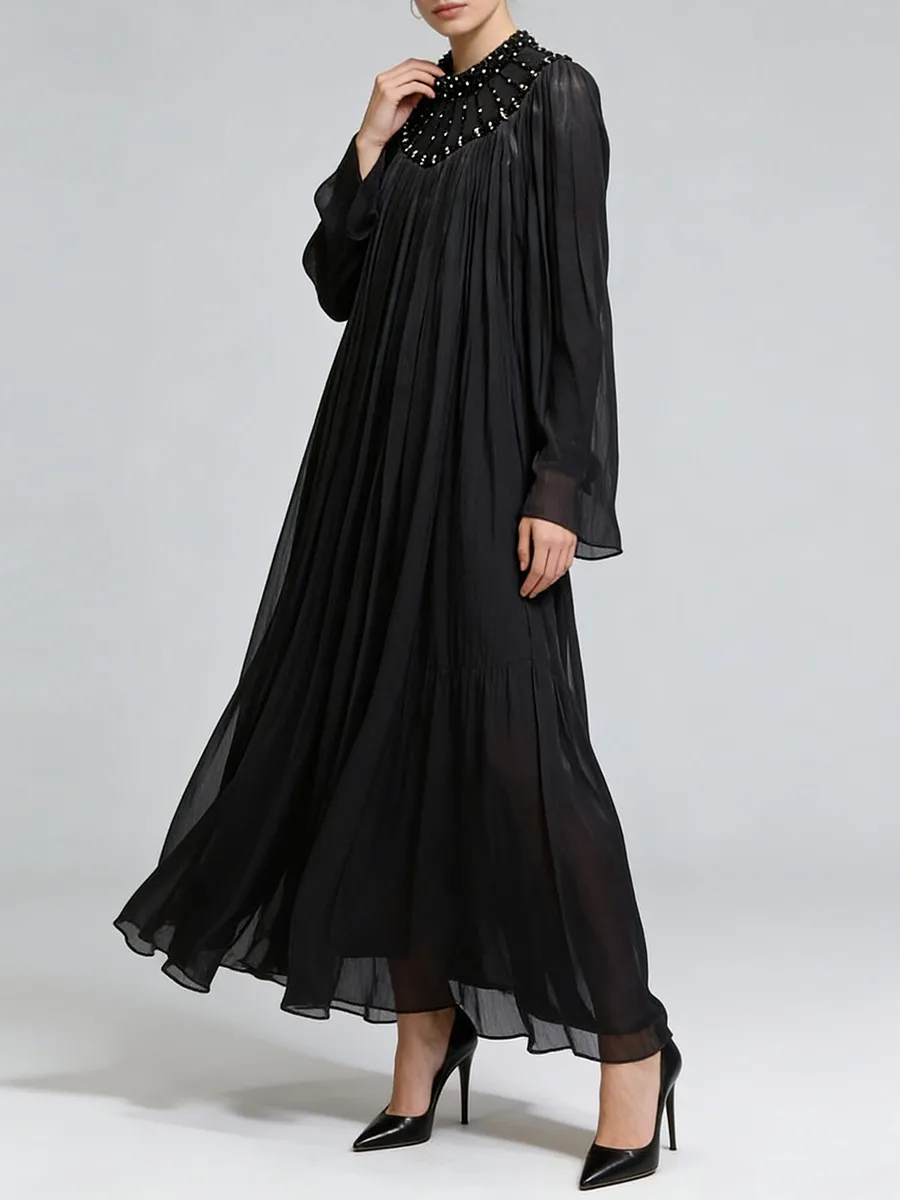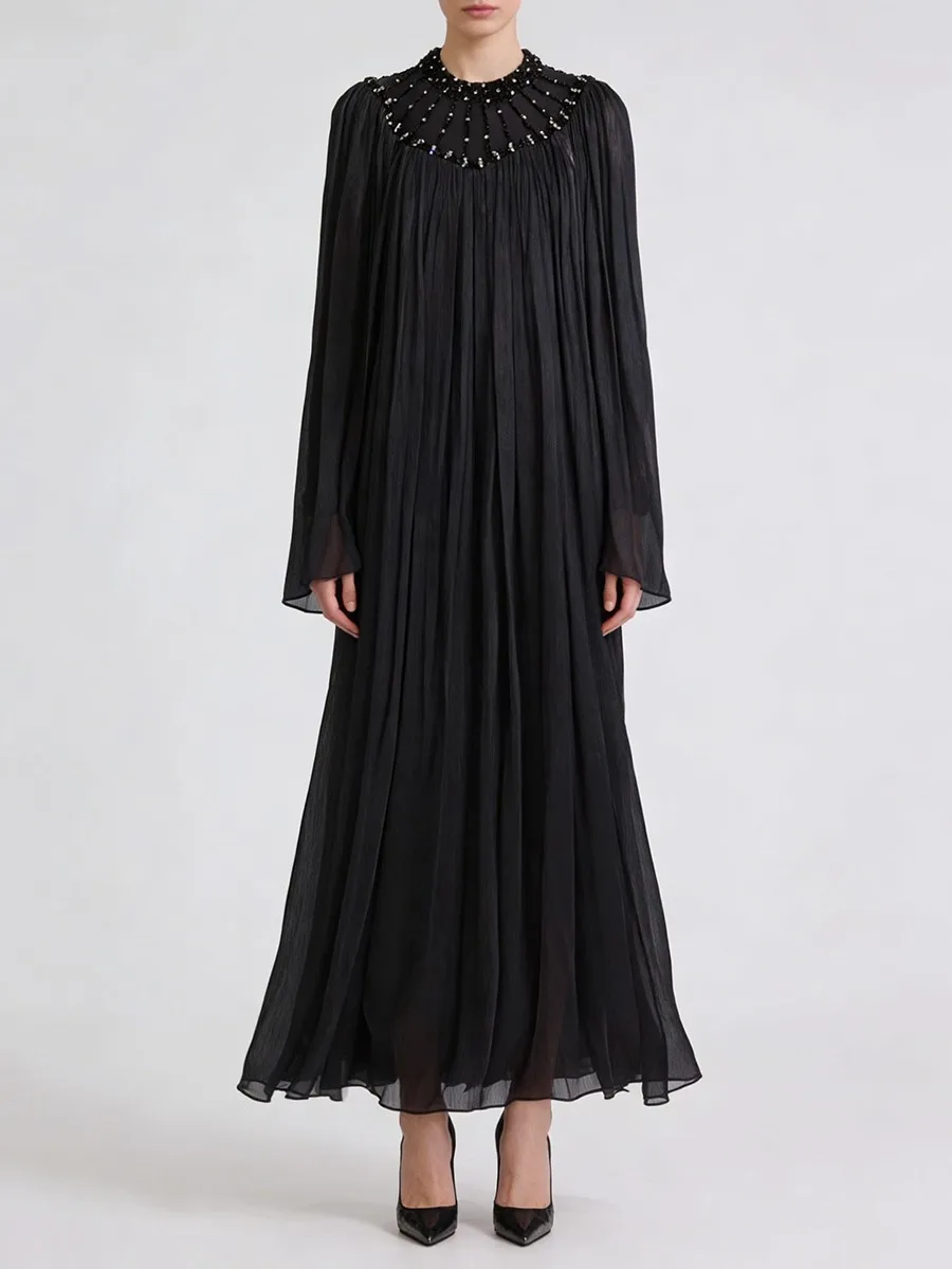 TWOTWINSTYLE Elegant Loose Spliced Bead Vintage Long Dress for Women Round Neck Long Sleeves Patchwork Folds Dresses Female New
