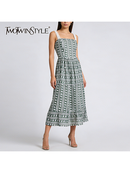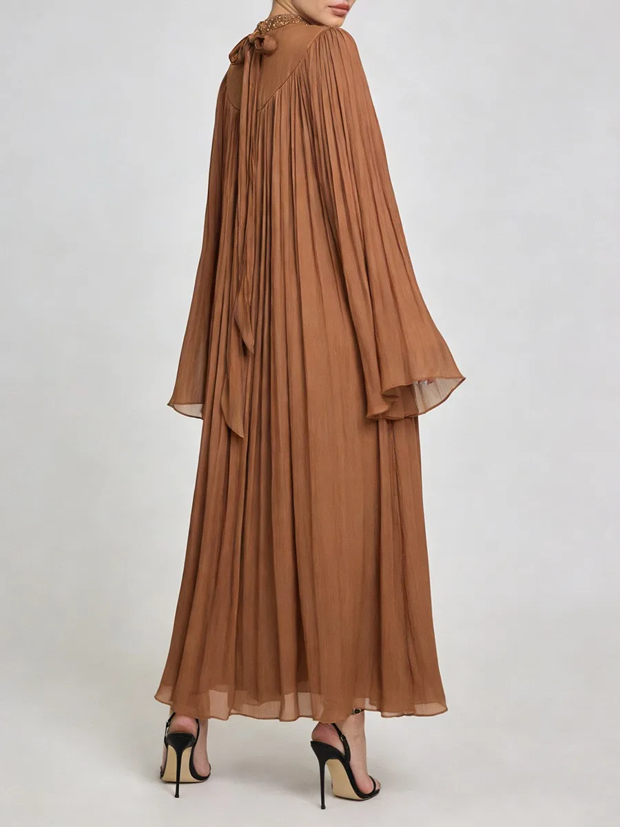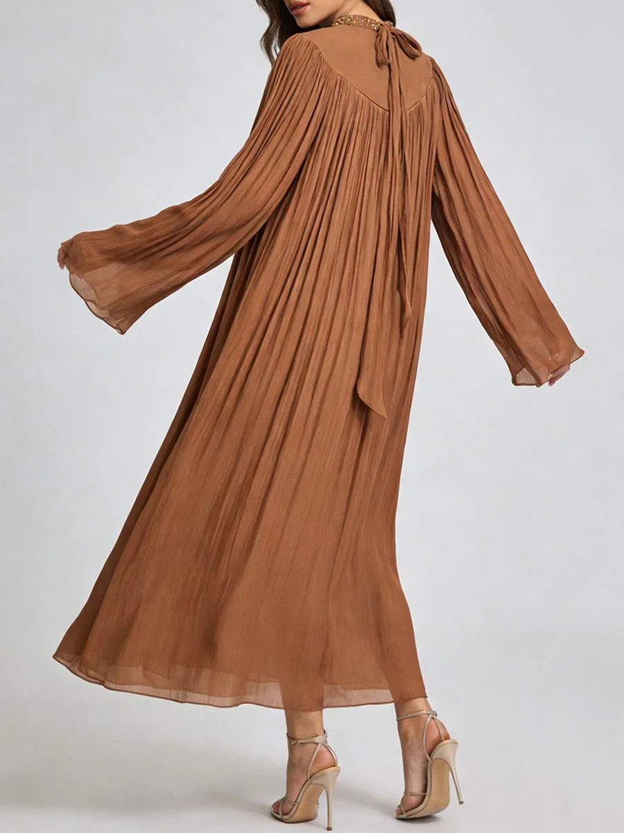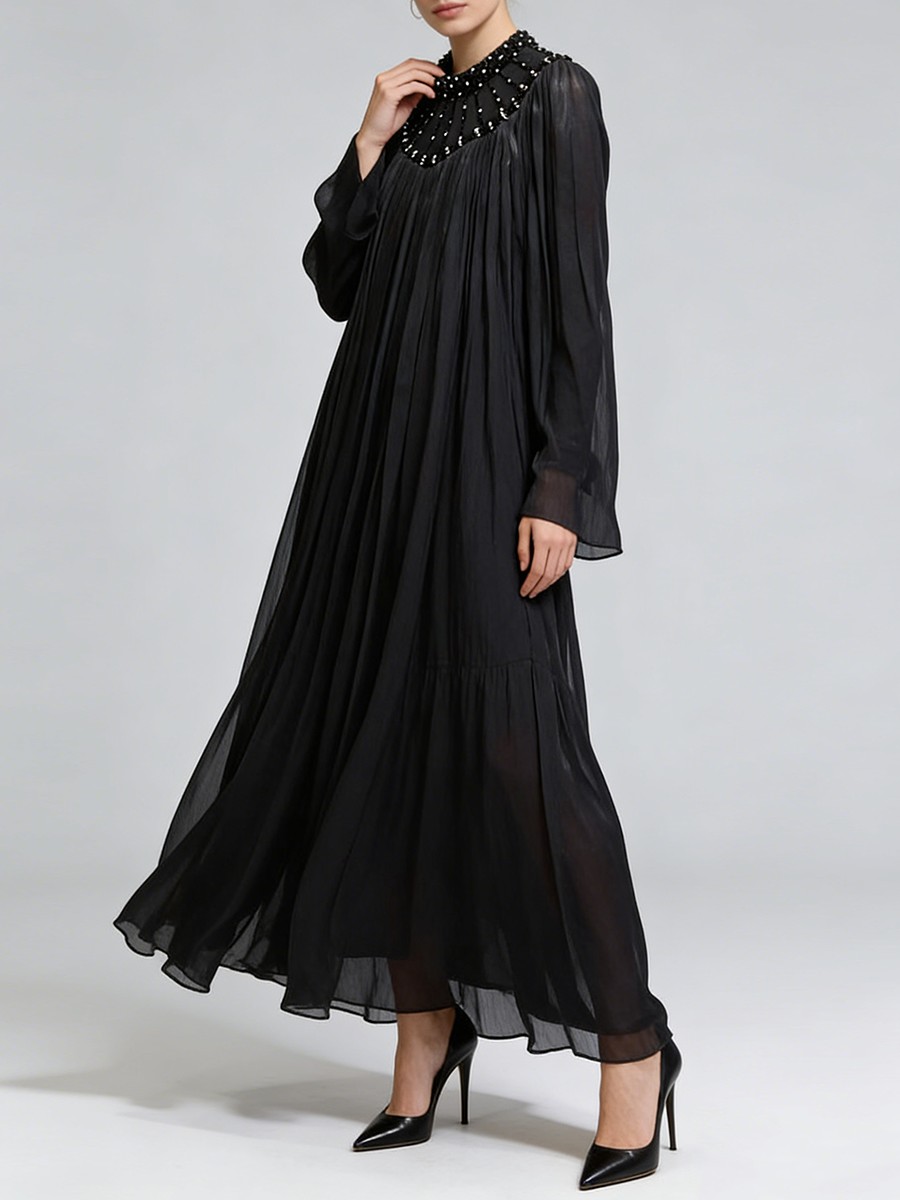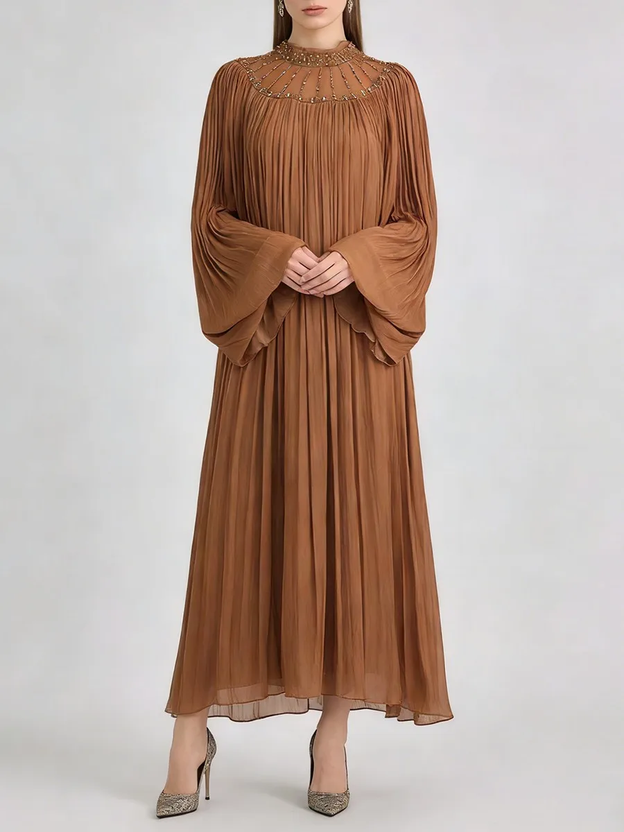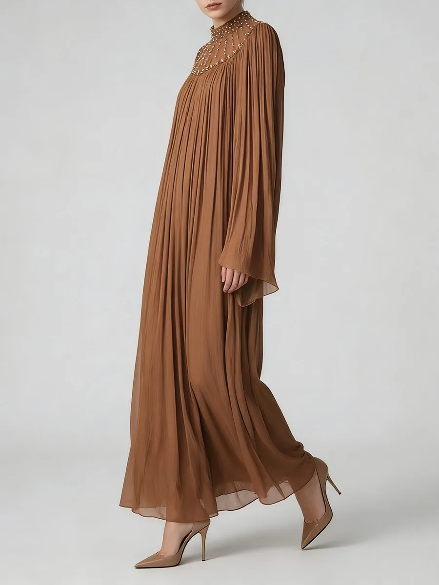 TWOTWINSTYLE Elegant Loose Spliced Bead Vintage Long Dress for Women Round Neck Long Sleeves Patchwork Folds Dresses Female New