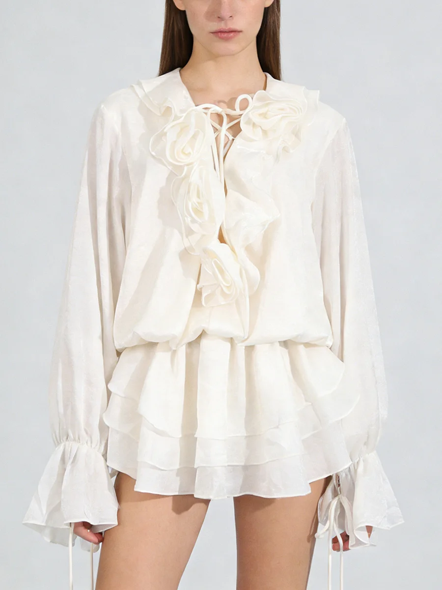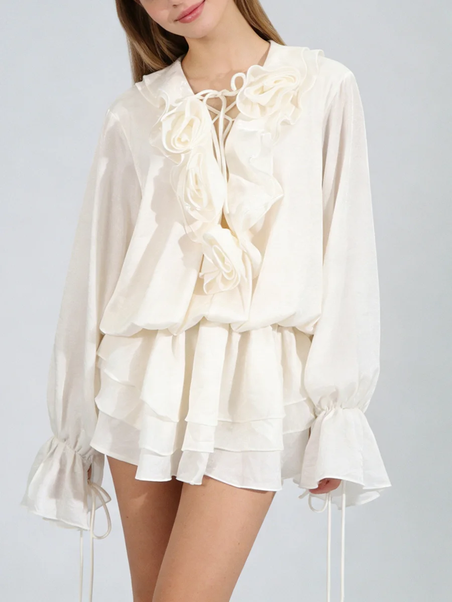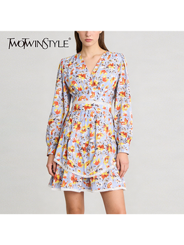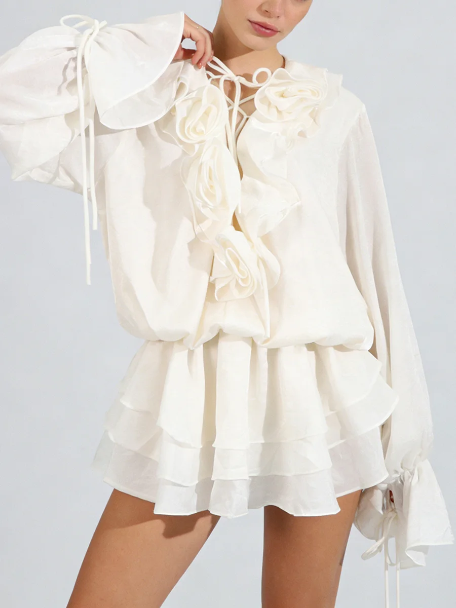 TWOTWINSTYLE Elegant Spliced 3D Flower Fashion Mini Dress for Women V Neck Long Sleeves Tunic Patchwork Ruffles Dresses Female