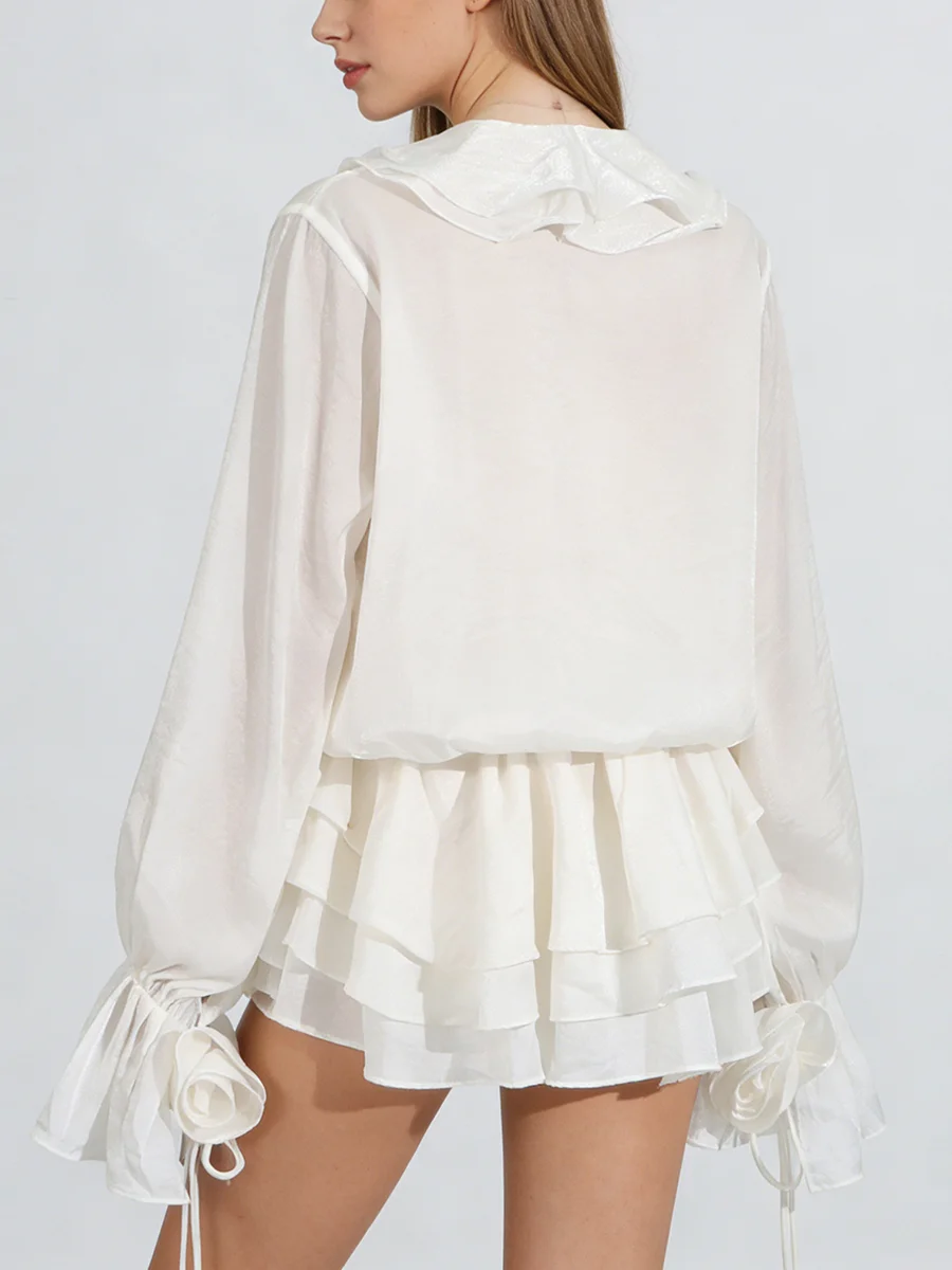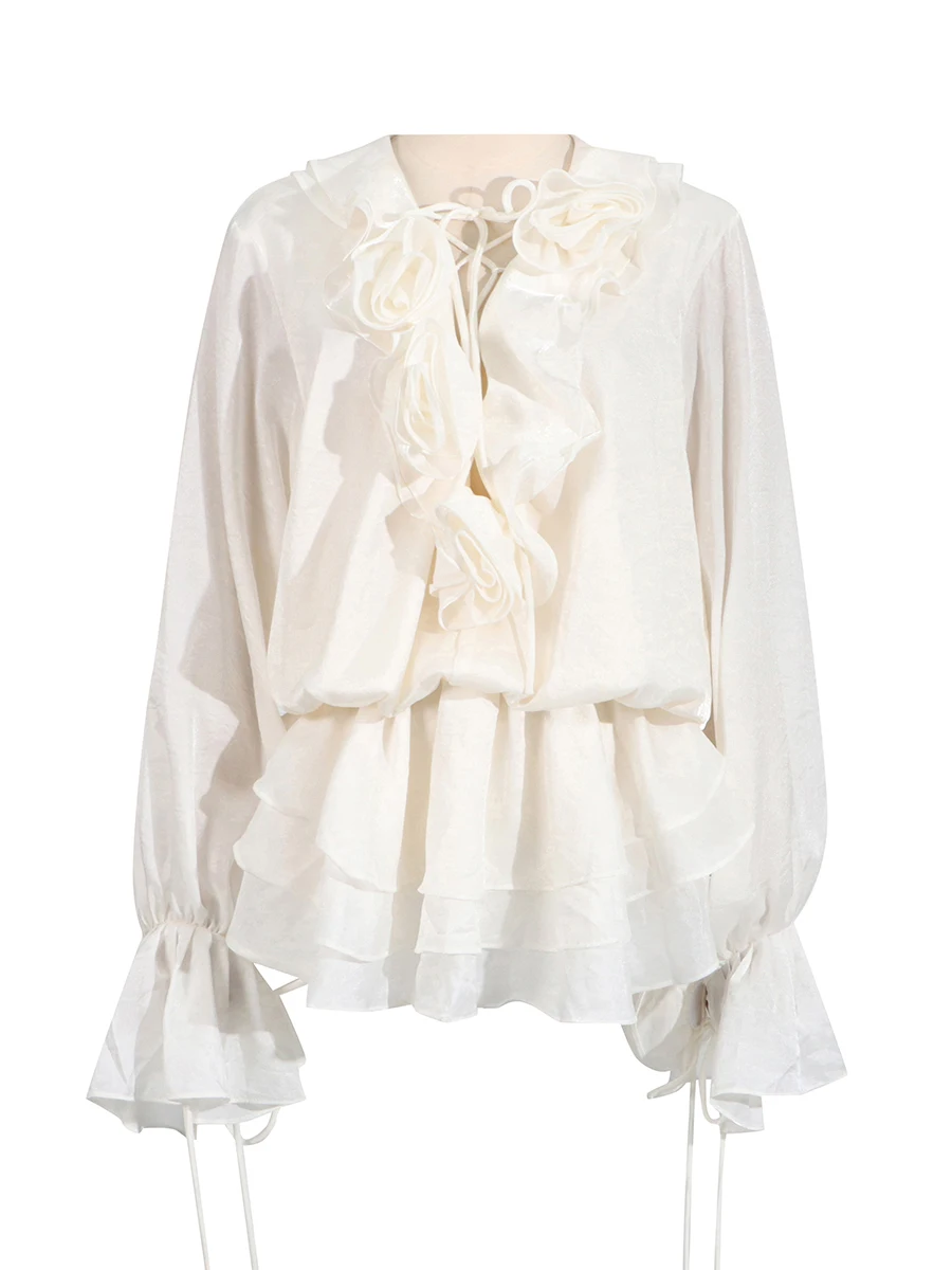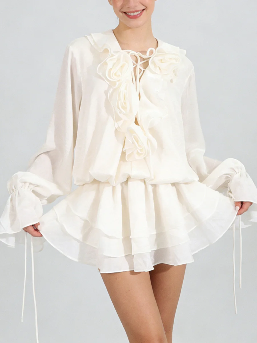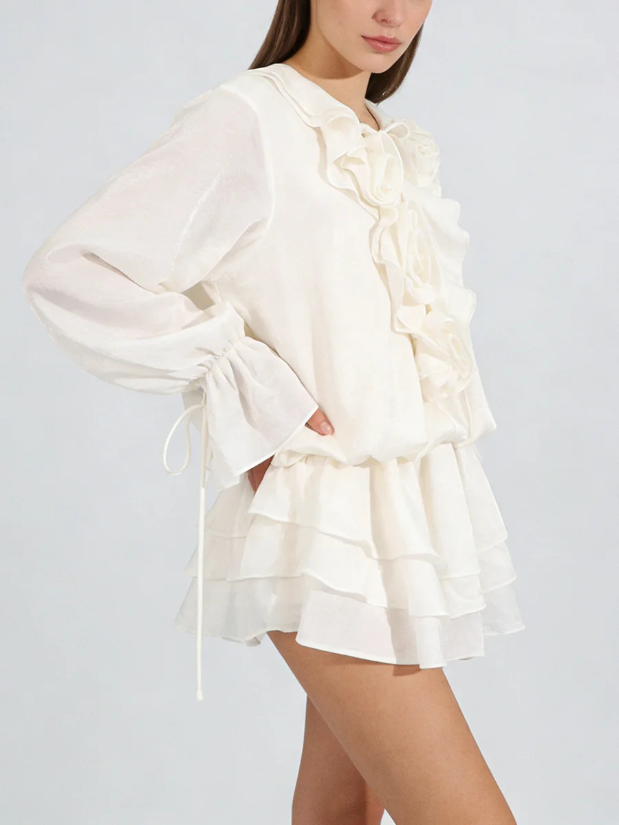 TWOTWINSTYLE Elegant Spliced 3D Flower Fashion Mini Dress for Women V Neck Long Sleeves Tunic Patchwork Ruffles Dresses Female