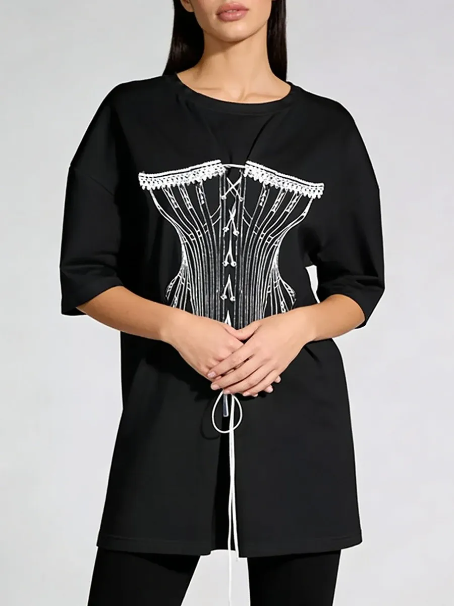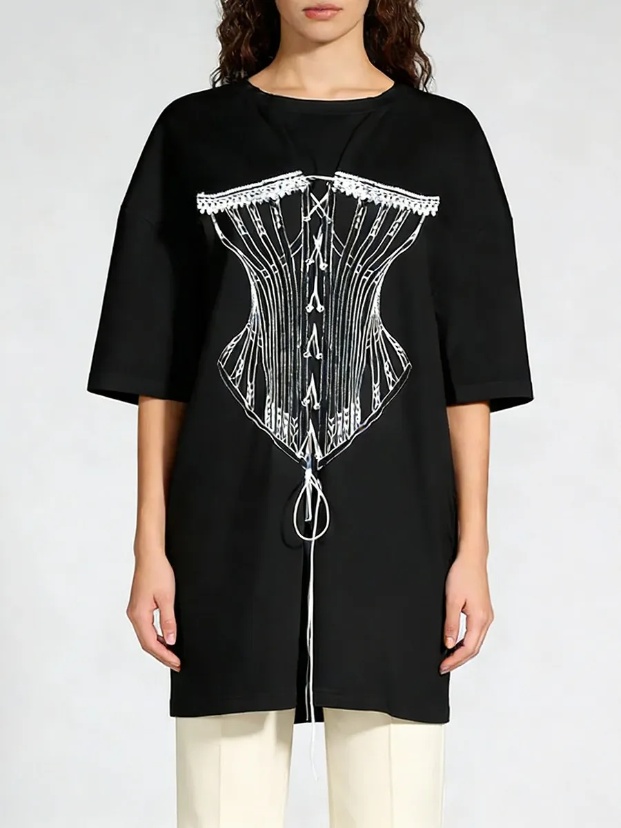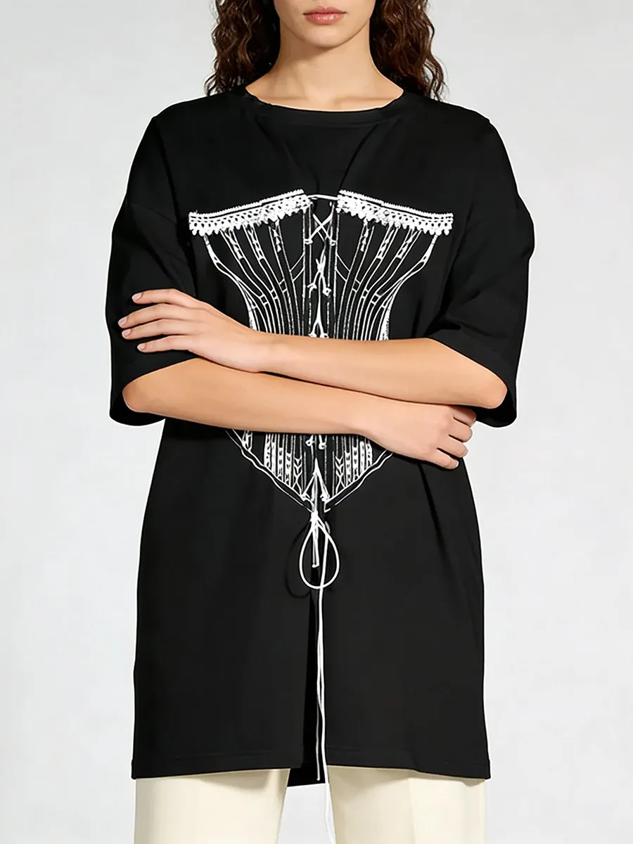 TWOTWINSTYLE Fashion Loose Spliced Strap T Shirts for Women Round Neck Half Sleeves Patchwork Lace Casual T Shirt Female Clothes